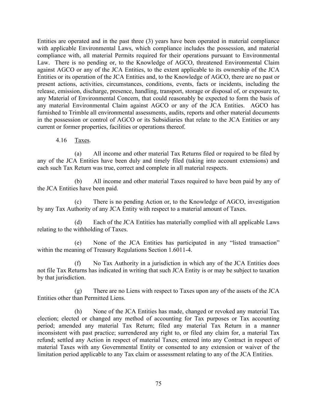 75 Entities are operated and in the past three (3) years have been operated in material compliance with applicable Environmental Laws, which compliance includes the possession, and material compliance with, all material Permits required for their operations pursuant to Environmental Law. There is no pending or, to the Knowledge of AGCO, threatened Environmental Claim against AGCO or any of the JCA Entities, to the extent applicable to its ownership of the JCA Entities or its operation of the JCA Entities and, to the Knowledge of AGCO, there are no past or present actions, activities, circumstances, conditions, events, facts or incidents, including the release, emission, discharge, presence, handling, transport, storage or disposal of, or exposure to, any Material of Environmental Concern, that could reasonably be expected to form the basis of any material Environmental Claim against AGCO or any of the JCA Entities. AGCO has furnished to Trimble all environmental assessments, audits, reports and other material documents in the possession or control of AGCO or its Subsidiaries that relate to the JCA Entities or any current or former properties, facilities or operations thereof. 4.16 Taxes. (a) All income and other material Tax Returns filed or required to be filed by any of the JCA Entities have been duly and timely filed (taking into account extensions) and each such Tax Return was true, correct and complete in all material respects. (b) All income and other material Taxes required to have been paid by any of the JCA Entities have been paid. (c) There is no pending Action or, to the Knowledge of AGCO, investigation by any Tax Authority of any JCA Entity with respect to a material amount of Taxes. (d) Each of the JCA Entities has materially complied with all applicable Laws relating to the withholding of Taxes. (e) None of the JCA Entities has participated in any “listed transaction” within the meaning of Treasury Regulations Section 1.6011-4. (f) No Tax Authority in a jurisdiction in which any of the JCA Entities does not file Tax Returns has indicated in writing that such JCA Entity is or may be subject to taxation by that jurisdiction. (g) There are no Liens with respect to Taxes upon any of the assets of the JCA Entities other than Permitted Liens. (h) None of the JCA Entities has made, changed or revoked any material Tax election; elected or changed any method of accounting for Tax purposes or Tax accounting period; amended any material Tax Return; filed any material Tax Return in a manner inconsistent with past practice; surrendered any right to, or filed any claim for, a material Tax refund; settled any Action in respect of material Taxes; entered into any Contract in respect of material Taxes with any Governmental Entity or consented to any extension or waiver of the limitation period applicable to any Tax claim or assessment relating to any of the JCA Entities.