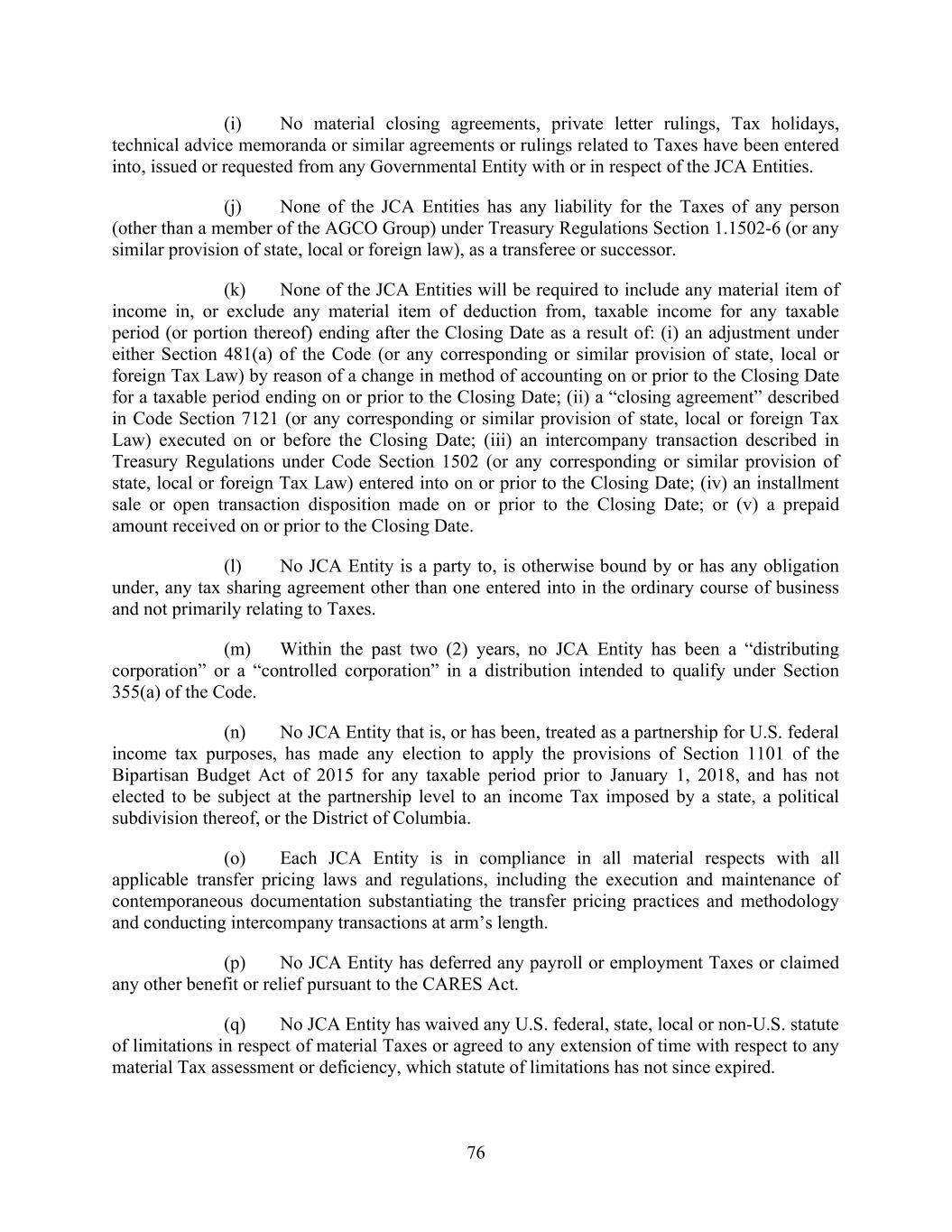 76 (i) No material closing agreements, private letter rulings, Tax holidays, technical advice memoranda or similar agreements or rulings related to Taxes have been entered into, issued or requested from any Governmental Entity with or in respect of the JCA Entities. (j) None of the JCA Entities has any liability for the Taxes of any person (other than a member of the AGCO Group) under Treasury Regulations Section 1.1502-6 (or any similar provision of state, local or foreign law), as a transferee or successor. (k) None of the JCA Entities will be required to include any material item of income in, or exclude any material item of deduction from, taxable income for any taxable period (or portion thereof) ending after the Closing Date as a result of: (i) an adjustment under either Section 481(a) of the Code (or any corresponding or similar provision of state, local or foreign Tax Law) by reason of a change in method of accounting on or prior to the Closing Date for a taxable period ending on or prior to the Closing Date; (ii) a “closing agreement” described in Code Section 7121 (or any corresponding or similar provision of state, local or foreign Tax Law) executed on or before the Closing Date; (iii) an intercompany transaction described in Treasury Regulations under Code Section 1502 (or any corresponding or similar provision of state, local or foreign Tax Law) entered into on or prior to the Closing Date; (iv) an installment sale or open transaction disposition made on or prior to the Closing Date; or (v) a prepaid amount received on or prior to the Closing Date. (l) No JCA Entity is a party to, is otherwise bound by or has any obligation under, any tax sharing agreement other than one entered into in the ordinary course of business and not primarily relating to Taxes. (m) Within the past two (2) years, no JCA Entity has been a “distributing corporation” or a “controlled corporation” in a distribution intended to qualify under Section 355(a) of the Code. (n) No JCA Entity that is, or has been, treated as a partnership for U.S. federal income tax purposes, has made any election to apply the provisions of Section 1101 of the Bipartisan Budget Act of 2015 for any taxable period prior to January 1, 2018, and has not elected to be subject at the partnership level to an income Tax imposed by a state, a political subdivision thereof, or the District of Columbia. (o) Each JCA Entity is in compliance in all material respects with all applicable transfer pricing laws and regulations, including the execution and maintenance of contemporaneous documentation substantiating the transfer pricing practices and methodology and conducting intercompany transactions at arm’s length. (p) No JCA Entity has deferred any payroll or employment Taxes or claimed any other benefit or relief pursuant to the CARES Act. (q) No JCA Entity has waived any U.S. federal, state, local or non-U.S. statute of limitations in respect of material Taxes or agreed to any extension of time with respect to any material Tax assessment or deficiency, which statute of limitations has not since expired.