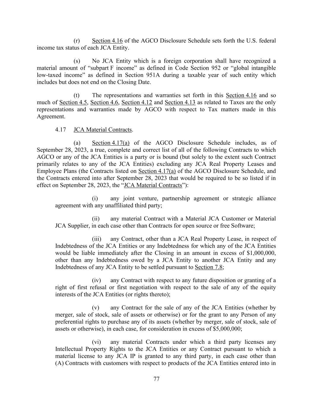 77 (r) Section 4.16 of the AGCO Disclosure Schedule sets forth the U.S. federal income tax status of each JCA Entity. (s) No JCA Entity which is a foreign corporation shall have recognized a material amount of “subpart F income” as defined in Code Section 952 or “global intangible low-taxed income” as defined in Section 951A during a taxable year of such entity which includes but does not end on the Closing Date. (t) The representations and warranties set forth in this Section 4.16 and so much of Section 4.5, Section 4.6, Section 4.12 and Section 4.13 as related to Taxes are the only representations and warranties made by AGCO with respect to Tax matters made in this Agreement. 4.17 JCA Material Contracts. (a) Section 4.17(a) of the AGCO Disclosure Schedule includes, as of September 28, 2023, a true, complete and correct list of all of the following Contracts to which AGCO or any of the JCA Entities is a party or is bound (but solely to the extent such Contract primarily relates to any of the JCA Entities) excluding any JCA Real Property Leases and Employee Plans (the Contracts listed on Section 4.17(a) of the AGCO Disclosure Schedule, and the Contracts entered into after September 28, 2023 that would be required to be so listed if in effect on September 28, 2023, the “JCA Material Contracts”): (i) any joint venture, partnership agreement or strategic alliance agreement with any unaffiliated third party; (ii) any material Contract with a Material JCA Customer or Material JCA Supplier, in each case other than Contracts for open source or free Software; (iii) any Contract, other than a JCA Real Property Lease, in respect of Indebtedness of the JCA Entities or any Indebtedness for which any of the JCA Entities would be liable immediately after the Closing in an amount in excess of $1,000,000, other than any Indebtedness owed by a JCA Entity to another JCA Entity and any Indebtedness of any JCA Entity to be settled pursuant to Section 7.8; (iv) any Contract with respect to any future disposition or granting of a right of first refusal or first negotiation with respect to the sale of any of the equity interests of the JCA Entities (or rights thereto); (v) any Contract for the sale of any of the JCA Entities (whether by merger, sale of stock, sale of assets or otherwise) or for the grant to any Person of any preferential rights to purchase any of its assets (whether by merger, sale of stock, sale of assets or otherwise), in each case, for consideration in excess of $5,000,000; (vi) any material Contracts under which a third party licenses any Intellectual Property Rights to the JCA Entities or any Contract pursuant to which a material license to any JCA IP is granted to any third party, in each case other than (A) Contracts with customers with respect to products of the JCA Entities entered into in