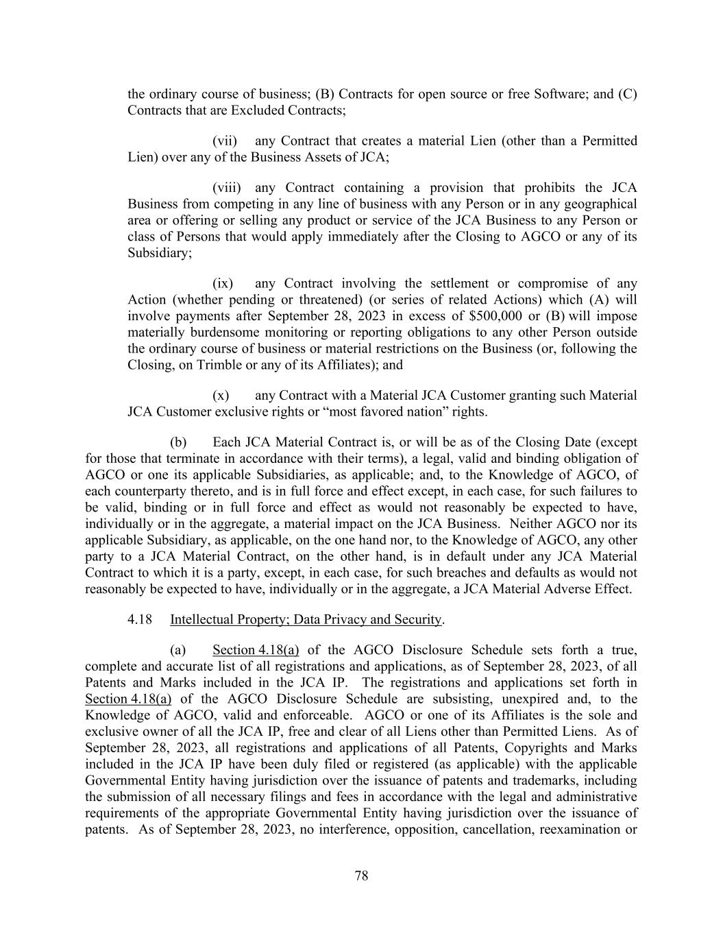 78 the ordinary course of business; (B) Contracts for open source or free Software; and (C) Contracts that are Excluded Contracts; (vii) any Contract that creates a material Lien (other than a Permitted Lien) over any of the Business Assets of JCA; (viii) any Contract containing a provision that prohibits the JCA Business from competing in any line of business with any Person or in any geographical area or offering or selling any product or service of the JCA Business to any Person or class of Persons that would apply immediately after the Closing to AGCO or any of its Subsidiary; (ix) any Contract involving the settlement or compromise of any Action (whether pending or threatened) (or series of related Actions) which (A) will involve payments after September 28, 2023 in excess of $500,000 or (B) will impose materially burdensome monitoring or reporting obligations to any other Person outside the ordinary course of business or material restrictions on the Business (or, following the Closing, on Trimble or any of its Affiliates); and (x) any Contract with a Material JCA Customer granting such Material JCA Customer exclusive rights or “most favored nation” rights. (b) Each JCA Material Contract is, or will be as of the Closing Date (except for those that terminate in accordance with their terms), a legal, valid and binding obligation of AGCO or one its applicable Subsidiaries, as applicable; and, to the Knowledge of AGCO, of each counterparty thereto, and is in full force and effect except, in each case, for such failures to be valid, binding or in full force and effect as would not reasonably be expected to have, individually or in the aggregate, a material impact on the JCA Business. Neither AGCO nor its applicable Subsidiary, as applicable, on the one hand nor, to the Knowledge of AGCO, any other party to a JCA Material Contract, on the other hand, is in default under any JCA Material Contract to which it is a party, except, in each case, for such breaches and defaults as would not reasonably be expected to have, individually or in the aggregate, a JCA Material Adverse Effect. 4.18 Intellectual Property; Data Privacy and Security. (a) Section 4.18(a) of the AGCO Disclosure Schedule sets forth a true, complete and accurate list of all registrations and applications, as of September 28, 2023, of all Patents and Marks included in the JCA IP. The registrations and applications set forth in Section 4.18(a) of the AGCO Disclosure Schedule are subsisting, unexpired and, to the Knowledge of AGCO, valid and enforceable. AGCO or one of its Affiliates is the sole and exclusive owner of all the JCA IP, free and clear of all Liens other than Permitted Liens. As of September 28, 2023, all registrations and applications of all Patents, Copyrights and Marks included in the JCA IP have been duly filed or registered (as applicable) with the applicable Governmental Entity having jurisdiction over the issuance of patents and trademarks, including the submission of all necessary filings and fees in accordance with the legal and administrative requirements of the appropriate Governmental Entity having jurisdiction over the issuance of patents. As of September 28, 2023, no interference, opposition, cancellation, reexamination or