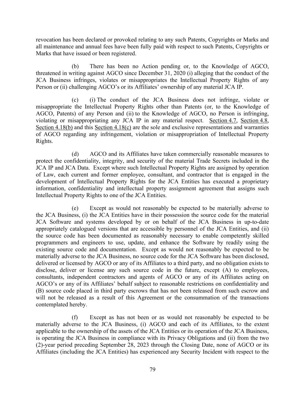 79 revocation has been declared or provoked relating to any such Patents, Copyrights or Marks and all maintenance and annual fees have been fully paid with respect to such Patents, Copyrights or Marks that have issued or been registered. (b) There has been no Action pending or, to the Knowledge of AGCO, threatened in writing against AGCO since December 31, 2020 (i) alleging that the conduct of the JCA Business infringes, violates or misappropriates the Intellectual Property Rights of any Person or (ii) challenging AGCO’s or its Affiliates’ ownership of any material JCA IP. (c) (i) The conduct of the JCA Business does not infringe, violate or misappropriate the Intellectual Property Rights other than Patents (or, to the Knowledge of AGCO, Patents) of any Person and (ii) to the Knowledge of AGCO, no Person is infringing, violating or misappropriating any JCA IP in any material respect. Section 4.7, Section 4.8, Section 4.18(b) and this Section 4.18(c) are the sole and exclusive representations and warranties of AGCO regarding any infringement, violation or misappropriation of Intellectual Property Rights. (d) AGCO and its Affiliates have taken commercially reasonable measures to protect the confidentiality, integrity, and security of the material Trade Secrets included in the JCA IP and JCA Data. Except where such Intellectual Property Rights are assigned by operation of Law, each current and former employee, consultant, and contractor that is engaged in the development of Intellectual Property Rights for the JCA Entities has executed a proprietary information, confidentiality and intellectual property assignment agreement that assigns such Intellectual Property Rights to one of the JCA Entities. (e) Except as would not reasonably be expected to be materially adverse to the JCA Business, (i) the JCA Entities have in their possession the source code for the material JCA Software and systems developed by or on behalf of the JCA Business in up-to-date appropriately catalogued versions that are accessible by personnel of the JCA Entities, and (ii) the source code has been documented as reasonably necessary to enable competently skilled programmers and engineers to use, update, and enhance the Software by readily using the existing source code and documentation. Except as would not reasonably be expected to be materially adverse to the JCA Business, no source code for the JCA Software has been disclosed, delivered or licensed by AGCO or any of its Affiliates to a third party, and no obligation exists to disclose, deliver or license any such source code in the future, except (A) to employees, consultants, independent contractors and agents of AGCO or any of its Affiliates acting on AGCO’s or any of its Affiliates’ behalf subject to reasonable restrictions on confidentiality and (B) source code placed in third party escrows that has not been released from such escrow and will not be released as a result of this Agreement or the consummation of the transactions contemplated hereby. (f) Except as has not been or as would not reasonably be expected to be materially adverse to the JCA Business, (i) AGCO and each of its Affiliates, to the extent applicable to the ownership of the assets of the JCA Entities or its operation of the JCA Business, is operating the JCA Business in compliance with its Privacy Obligations and (ii) from the two (2)-year period preceding September 28, 2023 through the Closing Date, none of AGCO or its Affiliates (including the JCA Entities) has experienced any Security Incident with respect to the