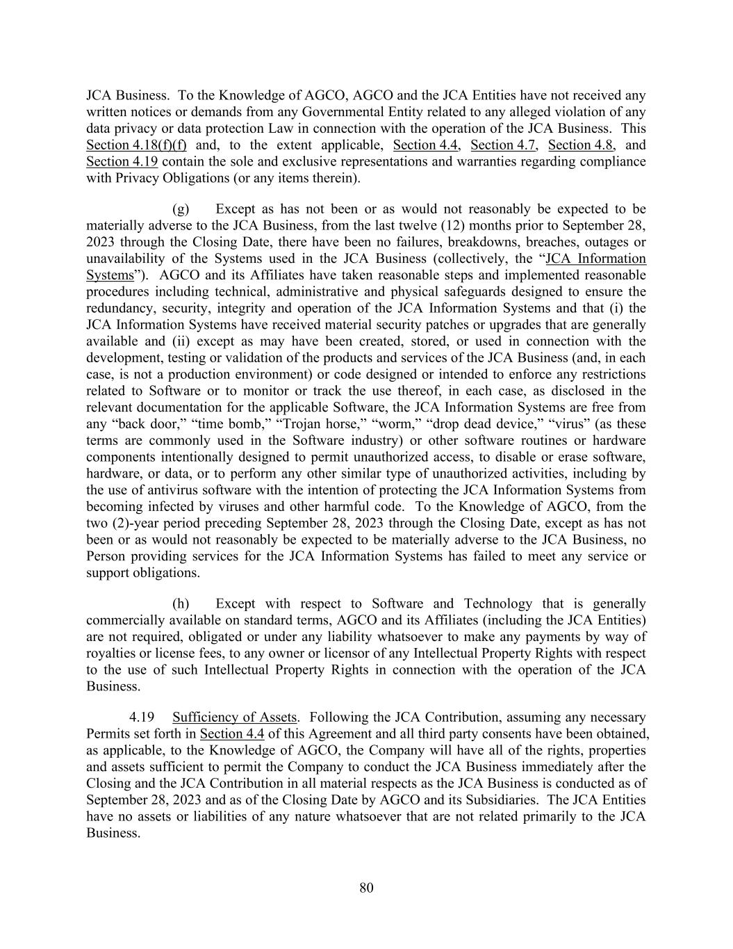 80 JCA Business. To the Knowledge of AGCO, AGCO and the JCA Entities have not received any written notices or demands from any Governmental Entity related to any alleged violation of any data privacy or data protection Law in connection with the operation of the JCA Business. This Section 4.18(f)(f) and, to the extent applicable, Section 4.4, Section 4.7, Section 4.8, and Section 4.19 contain the sole and exclusive representations and warranties regarding compliance with Privacy Obligations (or any items therein). (g) Except as has not been or as would not reasonably be expected to be materially adverse to the JCA Business, from the last twelve (12) months prior to September 28, 2023 through the Closing Date, there have been no failures, breakdowns, breaches, outages or unavailability of the Systems used in the JCA Business (collectively, the “JCA Information Systems”). AGCO and its Affiliates have taken reasonable steps and implemented reasonable procedures including technical, administrative and physical safeguards designed to ensure the redundancy, security, integrity and operation of the JCA Information Systems and that (i) the JCA Information Systems have received material security patches or upgrades that are generally available and (ii) except as may have been created, stored, or used in connection with the development, testing or validation of the products and services of the JCA Business (and, in each case, is not a production environment) or code designed or intended to enforce any restrictions related to Software or to monitor or track the use thereof, in each case, as disclosed in the relevant documentation for the applicable Software, the JCA Information Systems are free from any “back door,” “time bomb,” “Trojan horse,” “worm,” “drop dead device,” “virus” (as these terms are commonly used in the Software industry) or other software routines or hardware components intentionally designed to permit unauthorized access, to disable or erase software, hardware, or data, or to perform any other similar type of unauthorized activities, including by the use of antivirus software with the intention of protecting the JCA Information Systems from becoming infected by viruses and other harmful code. To the Knowledge of AGCO, from the two (2)-year period preceding September 28, 2023 through the Closing Date, except as has not been or as would not reasonably be expected to be materially adverse to the JCA Business, no Person providing services for the JCA Information Systems has failed to meet any service or support obligations. (h) Except with respect to Software and Technology that is generally commercially available on standard terms, AGCO and its Affiliates (including the JCA Entities) are not required, obligated or under any liability whatsoever to make any payments by way of royalties or license fees, to any owner or licensor of any Intellectual Property Rights with respect to the use of such Intellectual Property Rights in connection with the operation of the JCA Business. 4.19 Sufficiency of Assets. Following the JCA Contribution, assuming any necessary Permits set forth in Section 4.4 of this Agreement and all third party consents have been obtained, as applicable, to the Knowledge of AGCO, the Company will have all of the rights, properties and assets sufficient to permit the Company to conduct the JCA Business immediately after the Closing and the JCA Contribution in all material respects as the JCA Business is conducted as of September 28, 2023 and as of the Closing Date by AGCO and its Subsidiaries. The JCA Entities have no assets or liabilities of any nature whatsoever that are not related primarily to the JCA Business.