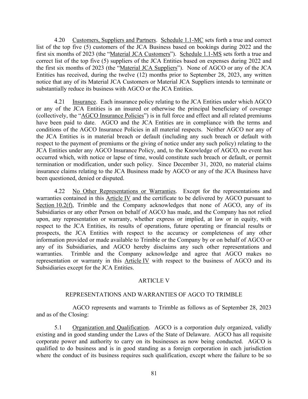 81 4.20 Customers, Suppliers and Partners. Schedule 1.1-MC sets forth a true and correct list of the top five (5) customers of the JCA Business based on bookings during 2022 and the first six months of 2023 (the “Material JCA Customers”). Schedule 1.1-MS sets forth a true and correct list of the top five (5) suppliers of the JCA Entities based on expenses during 2022 and the first six months of 2023 (the “Material JCA Suppliers”). None of AGCO or any of the JCA Entities has received, during the twelve (12) months prior to September 28, 2023, any written notice that any of its Material JCA Customers or Material JCA Suppliers intends to terminate or substantially reduce its business with AGCO or the JCA Entities. 4.21 Insurance. Each insurance policy relating to the JCA Entities under which AGCO or any of the JCA Entities is an insured or otherwise the principal beneficiary of coverage (collectively, the “AGCO Insurance Policies”) is in full force and effect and all related premiums have been paid to date. AGCO and the JCA Entities are in compliance with the terms and conditions of the AGCO Insurance Policies in all material respects. Neither AGCO nor any of the JCA Entities is in material breach or default (including any such breach or default with respect to the payment of premiums or the giving of notice under any such policy) relating to the JCA Entities under any AGCO Insurance Policy, and, to the Knowledge of AGCO, no event has occurred which, with notice or lapse of time, would constitute such breach or default, or permit termination or modification, under such policy. Since December 31, 2020, no material claims insurance claims relating to the JCA Business made by AGCO or any of the JCA Business have been questioned, denied or disputed. 4.22 No Other Representations or Warranties. Except for the representations and warranties contained in this Article IV and the certificate to be delivered by AGCO pursuant to Section 10.2(f), Trimble and the Company acknowledges that none of AGCO, any of its Subsidiaries or any other Person on behalf of AGCO has made, and the Company has not relied upon, any representation or warranty, whether express or implied, at law or in equity, with respect to the JCA Entities, its results of operations, future operating or financial results or prospects, the JCA Entities with respect to the accuracy or completeness of any other information provided or made available to Trimble or the Company by or on behalf of AGCO or any of its Subsidiaries, and AGCO hereby disclaims any such other representations and warranties. Trimble and the Company acknowledge and agree that AGCO makes no representation or warranty in this Article IV with respect to the business of AGCO and its Subsidiaries except for the JCA Entities. ARTICLE V REPRESENTATIONS AND WARRANTIES OF AGCO TO TRIMBLE AGCO represents and warrants to Trimble as follows as of September 28, 2023 and as of the Closing: 5.1 Organization and Qualification. AGCO is a corporation duly organized, validly existing and in good standing under the Laws of the State of Delaware. AGCO has all requisite corporate power and authority to carry on its businesses as now being conducted. AGCO is qualified to do business and is in good standing as a foreign corporation in each jurisdiction where the conduct of its business requires such qualification, except where the failure to be so