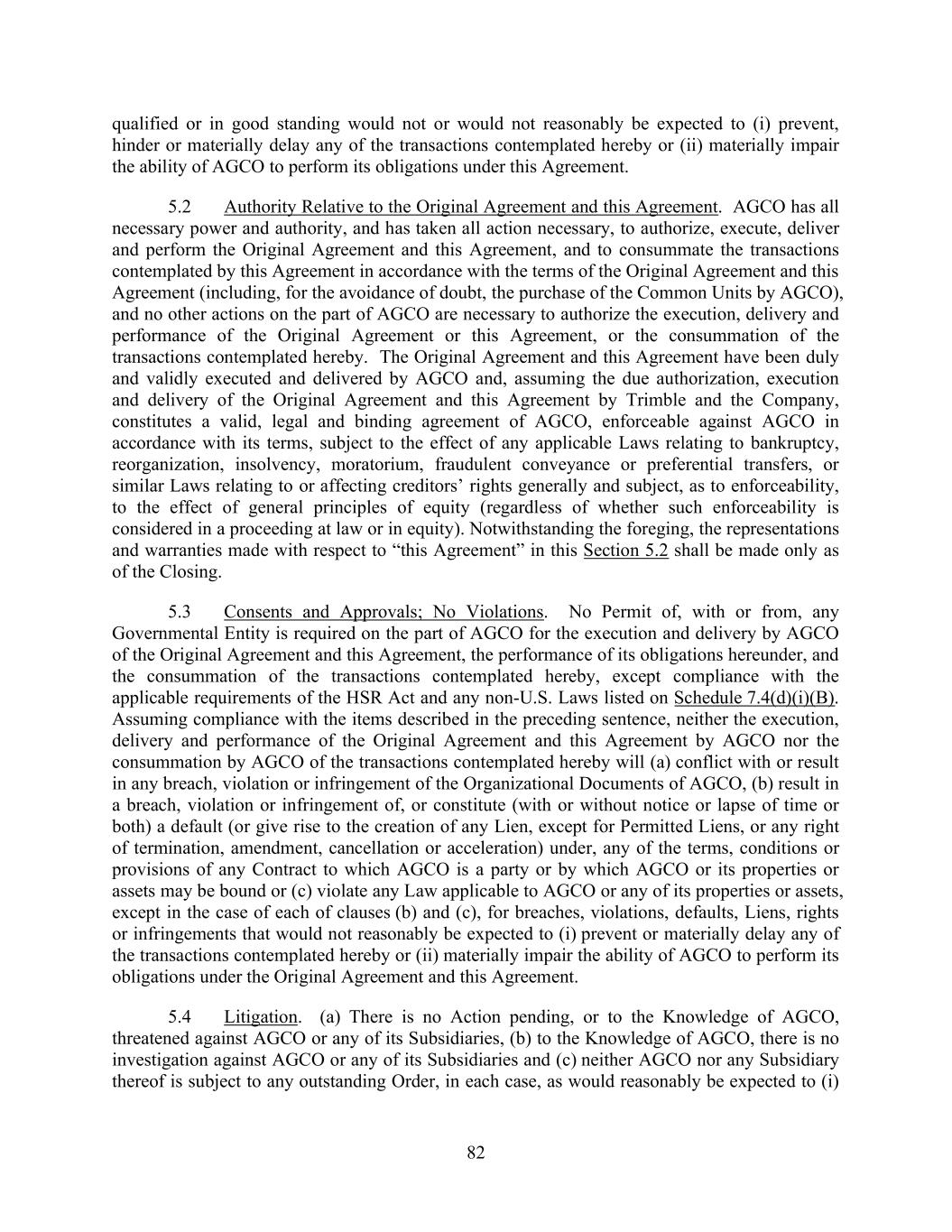 82 qualified or in good standing would not or would not reasonably be expected to (i) prevent, hinder or materially delay any of the transactions contemplated hereby or (ii) materially impair the ability of AGCO to perform its obligations under this Agreement. 5.2 Authority Relative to the Original Agreement and this Agreement. AGCO has all necessary power and authority, and has taken all action necessary, to authorize, execute, deliver and perform the Original Agreement and this Agreement, and to consummate the transactions contemplated by this Agreement in accordance with the terms of the Original Agreement and this Agreement (including, for the avoidance of doubt, the purchase of the Common Units by AGCO), and no other actions on the part of AGCO are necessary to authorize the execution, delivery and performance of the Original Agreement or this Agreement, or the consummation of the transactions contemplated hereby. The Original Agreement and this Agreement have been duly and validly executed and delivered by AGCO and, assuming the due authorization, execution and delivery of the Original Agreement and this Agreement by Trimble and the Company, constitutes a valid, legal and binding agreement of AGCO, enforceable against AGCO in accordance with its terms, subject to the effect of any applicable Laws relating to bankruptcy, reorganization, insolvency, moratorium, fraudulent conveyance or preferential transfers, or similar Laws relating to or affecting creditors’ rights generally and subject, as to enforceability, to the effect of general principles of equity (regardless of whether such enforceability is considered in a proceeding at law or in equity). Notwithstanding the foreging, the representations and warranties made with respect to “this Agreement” in this Section 5.2 shall be made only as of the Closing. 5.3 Consents and Approvals; No Violations. No Permit of, with or from, any Governmental Entity is required on the part of AGCO for the execution and delivery by AGCO of the Original Agreement and this Agreement, the performance of its obligations hereunder, and the consummation of the transactions contemplated hereby, except compliance with the applicable requirements of the HSR Act and any non-U.S. Laws listed on Schedule 7.4(d)(i)(B). Assuming compliance with the items described in the preceding sentence, neither the execution, delivery and performance of the Original Agreement and this Agreement by AGCO nor the consummation by AGCO of the transactions contemplated hereby will (a) conflict with or result in any breach, violation or infringement of the Organizational Documents of AGCO, (b) result in a breach, violation or infringement of, or constitute (with or without notice or lapse of time or both) a default (or give rise to the creation of any Lien, except for Permitted Liens, or any right of termination, amendment, cancellation or acceleration) under, any of the terms, conditions or provisions of any Contract to which AGCO is a party or by which AGCO or its properties or assets may be bound or (c) violate any Law applicable to AGCO or any of its properties or assets, except in the case of each of clauses (b) and (c), for breaches, violations, defaults, Liens, rights or infringements that would not reasonably be expected to (i) prevent or materially delay any of the transactions contemplated hereby or (ii) materially impair the ability of AGCO to perform its obligations under the Original Agreement and this Agreement. 5.4 Litigation. (a) There is no Action pending, or to the Knowledge of AGCO, threatened against AGCO or any of its Subsidiaries, (b) to the Knowledge of AGCO, there is no investigation against AGCO or any of its Subsidiaries and (c) neither AGCO nor any Subsidiary thereof is subject to any outstanding Order, in each case, as would reasonably be expected to (i)