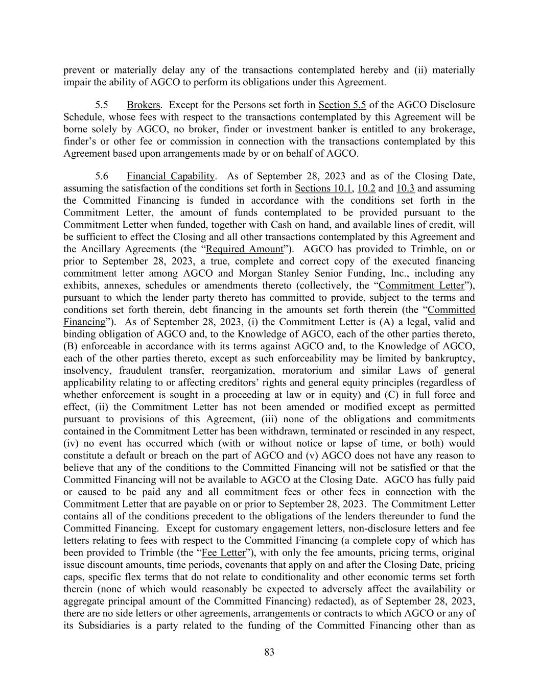 83 prevent or materially delay any of the transactions contemplated hereby and (ii) materially impair the ability of AGCO to perform its obligations under this Agreement. 5.5 Brokers. Except for the Persons set forth in Section 5.5 of the AGCO Disclosure Schedule, whose fees with respect to the transactions contemplated by this Agreement will be borne solely by AGCO, no broker, finder or investment banker is entitled to any brokerage, finder’s or other fee or commission in connection with the transactions contemplated by this Agreement based upon arrangements made by or on behalf of AGCO. 5.6 Financial Capability. As of September 28, 2023 and as of the Closing Date, assuming the satisfaction of the conditions set forth in Sections 10.1, 10.2 and 10.3 and assuming the Committed Financing is funded in accordance with the conditions set forth in the Commitment Letter, the amount of funds contemplated to be provided pursuant to the Commitment Letter when funded, together with Cash on hand, and available lines of credit, will be sufficient to effect the Closing and all other transactions contemplated by this Agreement and the Ancillary Agreements (the “Required Amount”). AGCO has provided to Trimble, on or prior to September 28, 2023, a true, complete and correct copy of the executed financing commitment letter among AGCO and Morgan Stanley Senior Funding, Inc., including any exhibits, annexes, schedules or amendments thereto (collectively, the “Commitment Letter”), pursuant to which the lender party thereto has committed to provide, subject to the terms and conditions set forth therein, debt financing in the amounts set forth therein (the “Committed Financing”). As of September 28, 2023, (i) the Commitment Letter is (A) a legal, valid and binding obligation of AGCO and, to the Knowledge of AGCO, each of the other parties thereto, (B) enforceable in accordance with its terms against AGCO and, to the Knowledge of AGCO, each of the other parties thereto, except as such enforceability may be limited by bankruptcy, insolvency, fraudulent transfer, reorganization, moratorium and similar Laws of general applicability relating to or affecting creditors’ rights and general equity principles (regardless of whether enforcement is sought in a proceeding at law or in equity) and (C) in full force and effect, (ii) the Commitment Letter has not been amended or modified except as permitted pursuant to provisions of this Agreement, (iii) none of the obligations and commitments contained in the Commitment Letter has been withdrawn, terminated or rescinded in any respect, (iv) no event has occurred which (with or without notice or lapse of time, or both) would constitute a default or breach on the part of AGCO and (v) AGCO does not have any reason to believe that any of the conditions to the Committed Financing will not be satisfied or that the Committed Financing will not be available to AGCO at the Closing Date. AGCO has fully paid or caused to be paid any and all commitment fees or other fees in connection with the Commitment Letter that are payable on or prior to September 28, 2023. The Commitment Letter contains all of the conditions precedent to the obligations of the lenders thereunder to fund the Committed Financing. Except for customary engagement letters, non-disclosure letters and fee letters relating to fees with respect to the Committed Financing (a complete copy of which has been provided to Trimble (the “Fee Letter”), with only the fee amounts, pricing terms, original issue discount amounts, time periods, covenants that apply on and after the Closing Date, pricing caps, specific flex terms that do not relate to conditionality and other economic terms set forth therein (none of which would reasonably be expected to adversely affect the availability or aggregate principal amount of the Committed Financing) redacted), as of September 28, 2023, there are no side letters or other agreements, arrangements or contracts to which AGCO or any of its Subsidiaries is a party related to the funding of the Committed Financing other than as