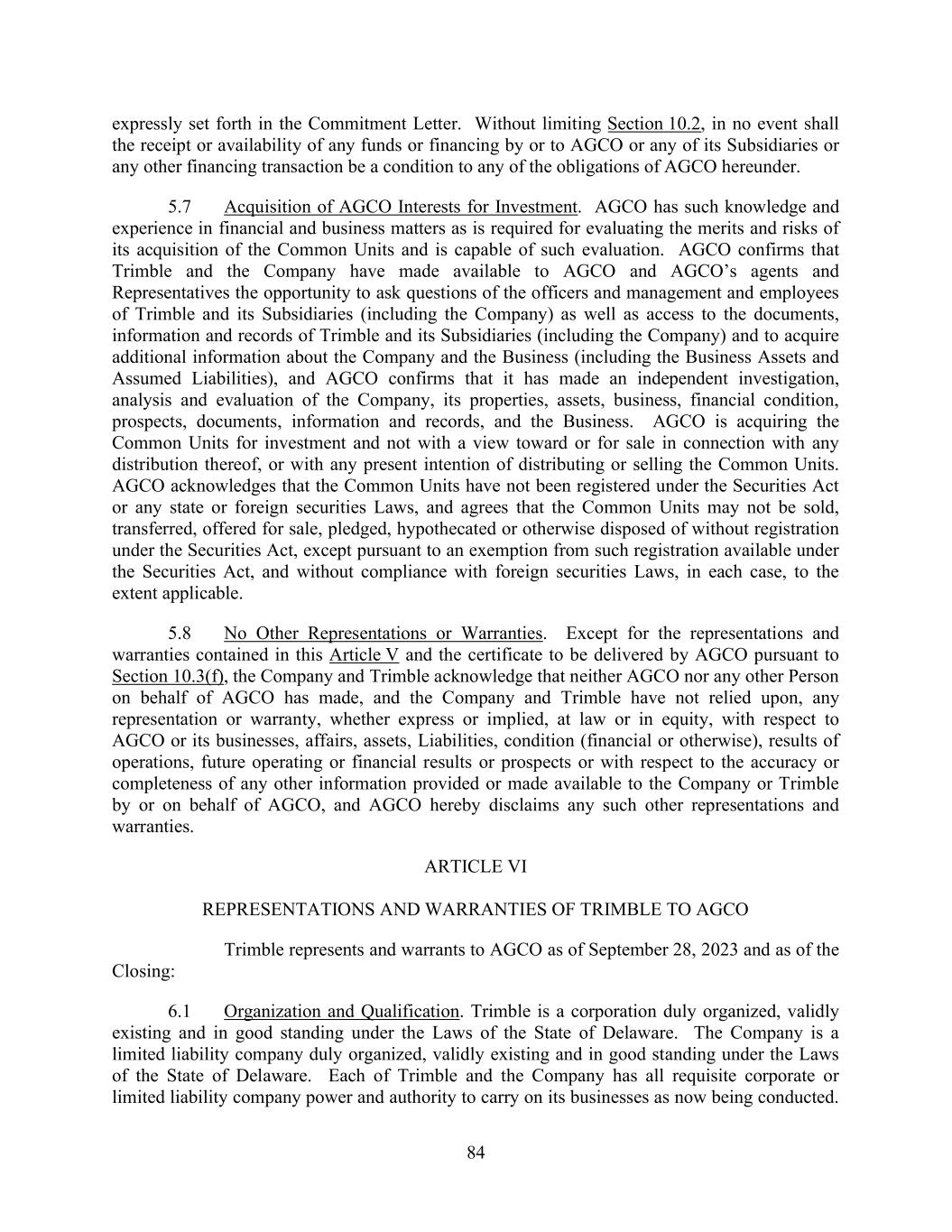 84 expressly set forth in the Commitment Letter. Without limiting Section 10.2, in no event shall the receipt or availability of any funds or financing by or to AGCO or any of its Subsidiaries or any other financing transaction be a condition to any of the obligations of AGCO hereunder. 5.7 Acquisition of AGCO Interests for Investment. AGCO has such knowledge and experience in financial and business matters as is required for evaluating the merits and risks of its acquisition of the Common Units and is capable of such evaluation. AGCO confirms that Trimble and the Company have made available to AGCO and AGCO’s agents and Representatives the opportunity to ask questions of the officers and management and employees of Trimble and its Subsidiaries (including the Company) as well as access to the documents, information and records of Trimble and its Subsidiaries (including the Company) and to acquire additional information about the Company and the Business (including the Business Assets and Assumed Liabilities), and AGCO confirms that it has made an independent investigation, analysis and evaluation of the Company, its properties, assets, business, financial condition, prospects, documents, information and records, and the Business. AGCO is acquiring the Common Units for investment and not with a view toward or for sale in connection with any distribution thereof, or with any present intention of distributing or selling the Common Units. AGCO acknowledges that the Common Units have not been registered under the Securities Act or any state or foreign securities Laws, and agrees that the Common Units may not be sold, transferred, offered for sale, pledged, hypothecated or otherwise disposed of without registration under the Securities Act, except pursuant to an exemption from such registration available under the Securities Act, and without compliance with foreign securities Laws, in each case, to the extent applicable. 5.8 No Other Representations or Warranties. Except for the representations and warranties contained in this Article V and the certificate to be delivered by AGCO pursuant to Section 10.3(f), the Company and Trimble acknowledge that neither AGCO nor any other Person on behalf of AGCO has made, and the Company and Trimble have not relied upon, any representation or warranty, whether express or implied, at law or in equity, with respect to AGCO or its businesses, affairs, assets, Liabilities, condition (financial or otherwise), results of operations, future operating or financial results or prospects or with respect to the accuracy or completeness of any other information provided or made available to the Company or Trimble by or on behalf of AGCO, and AGCO hereby disclaims any such other representations and warranties. ARTICLE VI REPRESENTATIONS AND WARRANTIES OF TRIMBLE TO AGCO Trimble represents and warrants to AGCO as of September 28, 2023 and as of the Closing: 6.1 Organization and Qualification. Trimble is a corporation duly organized, validly existing and in good standing under the Laws of the State of Delaware. The Company is a limited liability company duly organized, validly existing and in good standing under the Laws of the State of Delaware. Each of Trimble and the Company has all requisite corporate or limited liability company power and authority to carry on its businesses as now being conducted.