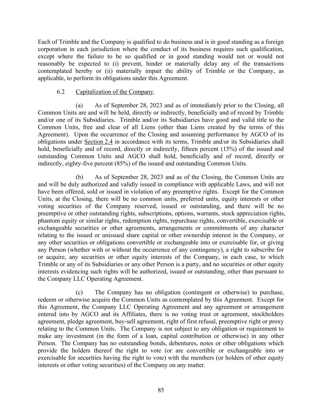 85 Each of Trimble and the Company is qualified to do business and is in good standing as a foreign corporation in each jurisdiction where the conduct of its business requires such qualification, except where the failure to be so qualified or in good standing would not or would not reasonably be expected to (i) prevent, hinder or materially delay any of the transactions contemplated hereby or (ii) materially impair the ability of Trimble or the Company, as applicable, to perform its obligations under this Agreement. 6.2 Capitalization of the Company. (a) As of September 28, 2023 and as of immediately prior to the Closing, all Common Units are and will be held, directly or indirectly, beneficially and of record by Trimble and/or one of its Subsidiaries. Trimble and/or its Subsidiaries have good and valid title to the Common Units, free and clear of all Liens (other than Liens created by the terms of this Agreement). Upon the occurrence of the Closing and assuming performance by AGCO of its obligations under Section 2.4 in accordance with its terms, Trimble and/or its Subsidiaries shall hold, beneficially and of record, directly or indirectly, fifteen percent (15%) of the issued and outstanding Common Units and AGCO shall hold, beneficially and of record, directly or indirectly, eighty-five percent (85%) of the issued and outstanding Common Units. (b) As of September 28, 2023 and as of the Closing, the Common Units are and will be duly authorized and validly issued in compliance with applicable Laws, and will not have been offered, sold or issued in violation of any preemptive rights. Except for the Common Units, at the Closing, there will be no common units, preferred units, equity interests or other voting securities of the Company reserved, issued or outstanding, and there will be no preemptive or other outstanding rights, subscriptions, options, warrants, stock appreciation rights, phantom equity or similar rights, redemption rights, repurchase rights, convertible, exercisable or exchangeable securities or other agreements, arrangements or commitments of any character relating to the issued or unissued share capital or other ownership interest in the Company, or any other securities or obligations convertible or exchangeable into or exercisable for, or giving any Person (whether with or without the occurrence of any contingency), a right to subscribe for or acquire, any securities or other equity interests of the Company, in each case, to which Trimble or any of its Subsidiaries or any other Person is a party, and no securities or other equity interests evidencing such rights will be authorized, issued or outstanding, other than pursuant to the Company LLC Operating Agreement. (c) The Company has no obligation (contingent or otherwise) to purchase, redeem or otherwise acquire the Common Units as contemplated by this Agreement. Except for this Agreement, the Company LLC Operating Agreement and any agreement or arrangement entered into by AGCO and its Affiliates, there is no voting trust or agreement, stockholders agreement, pledge agreement, buy-sell agreement, right of first refusal, preemptive right or proxy relating to the Common Units. The Company is not subject to any obligation or requirement to make any investment (in the form of a loan, capital contribution or otherwise) in any other Person. The Company has no outstanding bonds, debentures, notes or other obligations which provide the holders thereof the right to vote (or are convertible or exchangeable into or exercisable for securities having the right to vote) with the members (or holders of other equity interests or other voting securities) of the Company on any matter.