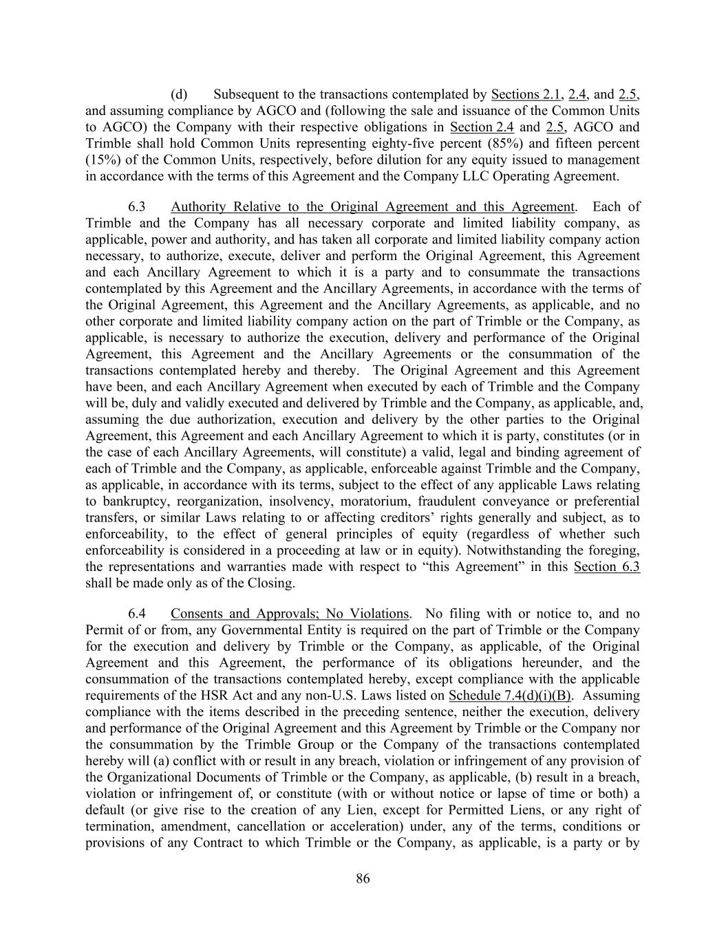 86 (d) Subsequent to the transactions contemplated by Sections 2.1, 2.4, and 2.5, and assuming compliance by AGCO and (following the sale and issuance of the Common Units to AGCO) the Company with their respective obligations in Section 2.4 and 2.5, AGCO and Trimble shall hold Common Units representing eighty-five percent (85%) and fifteen percent (15%) of the Common Units, respectively, before dilution for any equity issued to management in accordance with the terms of this Agreement and the Company LLC Operating Agreement. 6.3 Authority Relative to the Original Agreement and this Agreement. Each of Trimble and the Company has all necessary corporate and limited liability company, as applicable, power and authority, and has taken all corporate and limited liability company action necessary, to authorize, execute, deliver and perform the Original Agreement, this Agreement and each Ancillary Agreement to which it is a party and to consummate the transactions contemplated by this Agreement and the Ancillary Agreements, in accordance with the terms of the Original Agreement, this Agreement and the Ancillary Agreements, as applicable, and no other corporate and limited liability company action on the part of Trimble or the Company, as applicable, is necessary to authorize the execution, delivery and performance of the Original Agreement, this Agreement and the Ancillary Agreements or the consummation of the transactions contemplated hereby and thereby. The Original Agreement and this Agreement have been, and each Ancillary Agreement when executed by each of Trimble and the Company will be, duly and validly executed and delivered by Trimble and the Company, as applicable, and, assuming the due authorization, execution and delivery by the other parties to the Original Agreement, this Agreement and each Ancillary Agreement to which it is party, constitutes (or in the case of each Ancillary Agreements, will constitute) a valid, legal and binding agreement of each of Trimble and the Company, as applicable, enforceable against Trimble and the Company, as applicable, in accordance with its terms, subject to the effect of any applicable Laws relating to bankruptcy, reorganization, insolvency, moratorium, fraudulent conveyance or preferential transfers, or similar Laws relating to or affecting creditors’ rights generally and subject, as to enforceability, to the effect of general principles of equity (regardless of whether such enforceability is considered in a proceeding at law or in equity). Notwithstanding the foreging, the representations and warranties made with respect to “this Agreement” in this Section 6.3 shall be made only as of the Closing. 6.4 Consents and Approvals; No Violations. No filing with or notice to, and no Permit of or from, any Governmental Entity is required on the part of Trimble or the Company for the execution and delivery by Trimble or the Company, as applicable, of the Original Agreement and this Agreement, the performance of its obligations hereunder, and the consummation of the transactions contemplated hereby, except compliance with the applicable requirements of the HSR Act and any non-U.S. Laws listed on Schedule 7.4(d)(i)(B). Assuming compliance with the items described in the preceding sentence, neither the execution, delivery and performance of the Original Agreement and this Agreement by Trimble or the Company nor the consummation by the Trimble Group or the Company of the transactions contemplated hereby will (a) conflict with or result in any breach, violation or infringement of any provision of the Organizational Documents of Trimble or the Company, as applicable, (b) result in a breach, violation or infringement of, or constitute (with or without notice or lapse of time or both) a default (or give rise to the creation of any Lien, except for Permitted Liens, or any right of termination, amendment, cancellation or acceleration) under, any of the terms, conditions or provisions of any Contract to which Trimble or the Company, as applicable, is a party or by