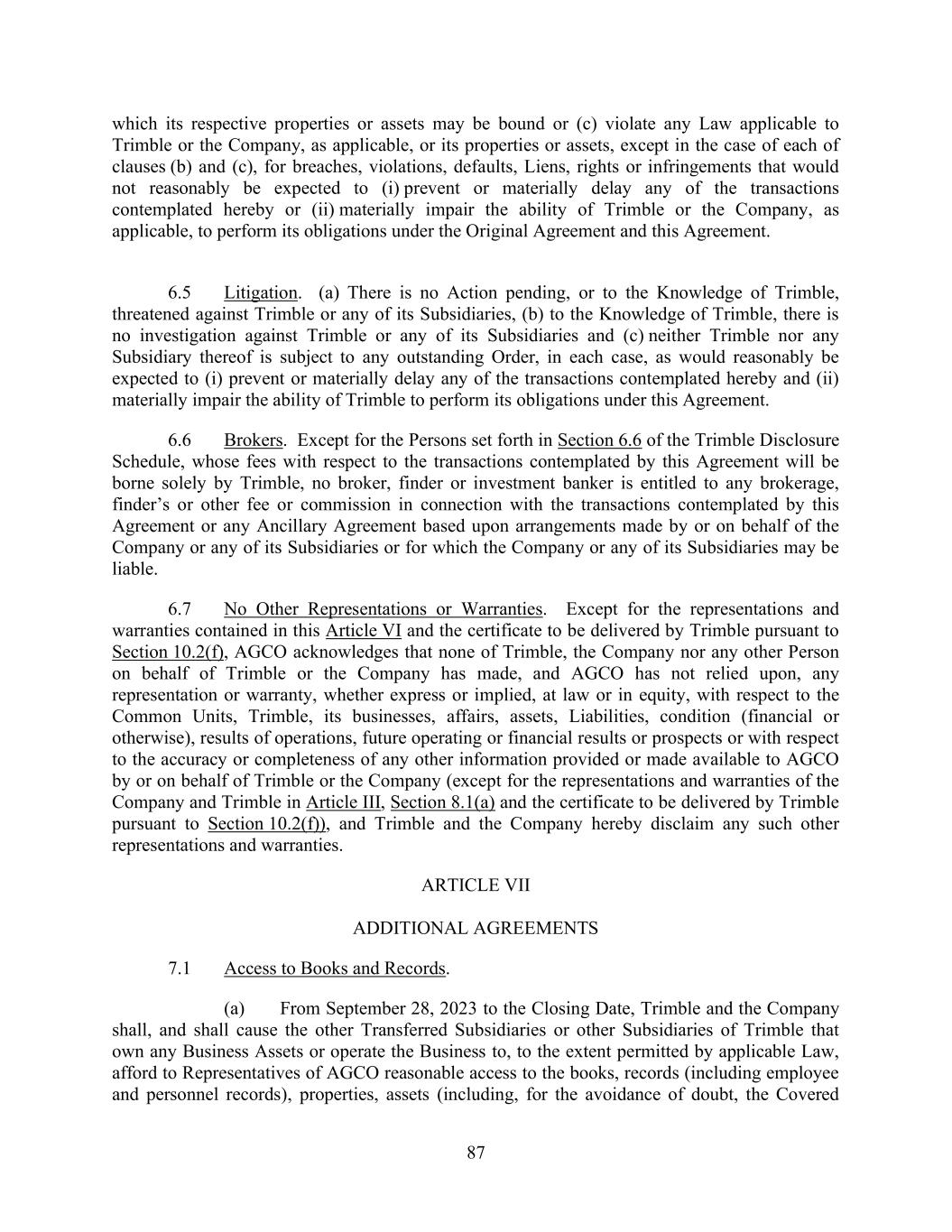 87 which its respective properties or assets may be bound or (c) violate any Law applicable to Trimble or the Company, as applicable, or its properties or assets, except in the case of each of clauses (b) and (c), for breaches, violations, defaults, Liens, rights or infringements that would not reasonably be expected to (i) prevent or materially delay any of the transactions contemplated hereby or (ii) materially impair the ability of Trimble or the Company, as applicable, to perform its obligations under the Original Agreement and this Agreement. 6.5 Litigation. (a) There is no Action pending, or to the Knowledge of Trimble, threatened against Trimble or any of its Subsidiaries, (b) to the Knowledge of Trimble, there is no investigation against Trimble or any of its Subsidiaries and (c) neither Trimble nor any Subsidiary thereof is subject to any outstanding Order, in each case, as would reasonably be expected to (i) prevent or materially delay any of the transactions contemplated hereby and (ii) materially impair the ability of Trimble to perform its obligations under this Agreement. 6.6 Brokers. Except for the Persons set forth in Section 6.6 of the Trimble Disclosure Schedule, whose fees with respect to the transactions contemplated by this Agreement will be borne solely by Trimble, no broker, finder or investment banker is entitled to any brokerage, finder’s or other fee or commission in connection with the transactions contemplated by this Agreement or any Ancillary Agreement based upon arrangements made by or on behalf of the Company or any of its Subsidiaries or for which the Company or any of its Subsidiaries may be liable. 6.7 No Other Representations or Warranties. Except for the representations and warranties contained in this Article VI and the certificate to be delivered by Trimble pursuant to Section 10.2(f), AGCO acknowledges that none of Trimble, the Company nor any other Person on behalf of Trimble or the Company has made, and AGCO has not relied upon, any representation or warranty, whether express or implied, at law or in equity, with respect to the Common Units, Trimble, its businesses, affairs, assets, Liabilities, condition (financial or otherwise), results of operations, future operating or financial results or prospects or with respect to the accuracy or completeness of any other information provided or made available to AGCO by or on behalf of Trimble or the Company (except for the representations and warranties of the Company and Trimble in Article III, Section 8.1(a) and the certificate to be delivered by Trimble pursuant to Section 10.2(f)), and Trimble and the Company hereby disclaim any such other representations and warranties. ARTICLE VII ADDITIONAL AGREEMENTS 7.1 Access to Books and Records. (a) From September 28, 2023 to the Closing Date, Trimble and the Company shall, and shall cause the other Transferred Subsidiaries or other Subsidiaries of Trimble that own any Business Assets or operate the Business to, to the extent permitted by applicable Law, afford to Representatives of AGCO reasonable access to the books, records (including employee and personnel records), properties, assets (including, for the avoidance of doubt, the Covered