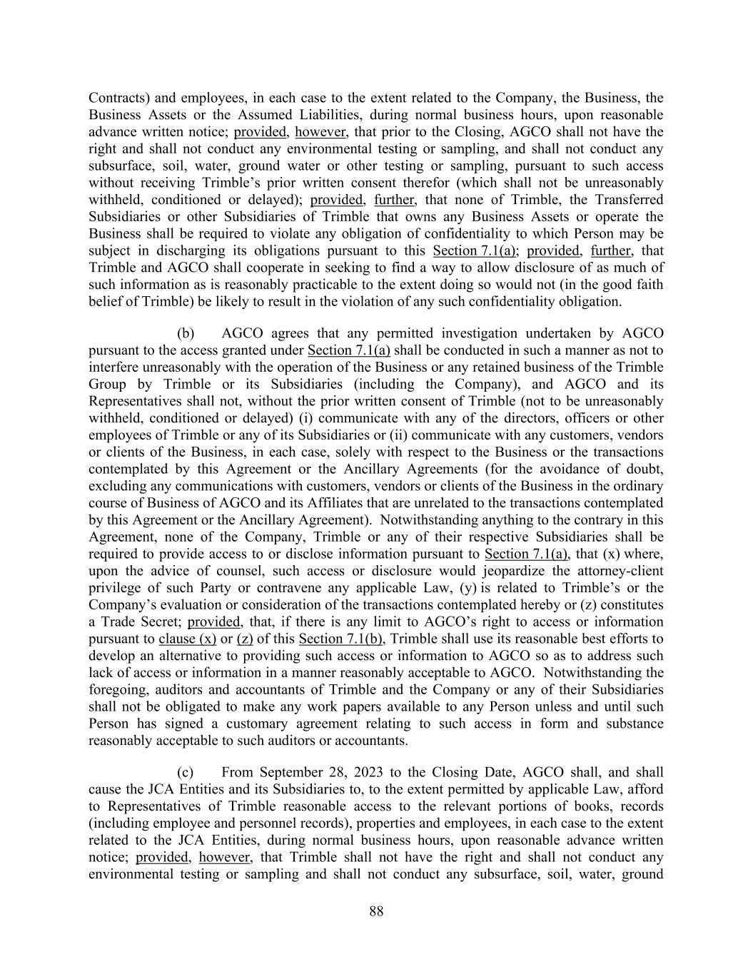 88 Contracts) and employees, in each case to the extent related to the Company, the Business, the Business Assets or the Assumed Liabilities, during normal business hours, upon reasonable advance written notice; provided, however, that prior to the Closing, AGCO shall not have the right and shall not conduct any environmental testing or sampling, and shall not conduct any subsurface, soil, water, ground water or other testing or sampling, pursuant to such access without receiving Trimble’s prior written consent therefor (which shall not be unreasonably withheld, conditioned or delayed); provided, further, that none of Trimble, the Transferred Subsidiaries or other Subsidiaries of Trimble that owns any Business Assets or operate the Business shall be required to violate any obligation of confidentiality to which Person may be subject in discharging its obligations pursuant to this Section 7.1(a); provided, further, that Trimble and AGCO shall cooperate in seeking to find a way to allow disclosure of as much of such information as is reasonably practicable to the extent doing so would not (in the good faith belief of Trimble) be likely to result in the violation of any such confidentiality obligation. (b) AGCO agrees that any permitted investigation undertaken by AGCO pursuant to the access granted under Section 7.1(a) shall be conducted in such a manner as not to interfere unreasonably with the operation of the Business or any retained business of the Trimble Group by Trimble or its Subsidiaries (including the Company), and AGCO and its Representatives shall not, without the prior written consent of Trimble (not to be unreasonably withheld, conditioned or delayed) (i) communicate with any of the directors, officers or other employees of Trimble or any of its Subsidiaries or (ii) communicate with any customers, vendors or clients of the Business, in each case, solely with respect to the Business or the transactions contemplated by this Agreement or the Ancillary Agreements (for the avoidance of doubt, excluding any communications with customers, vendors or clients of the Business in the ordinary course of Business of AGCO and its Affiliates that are unrelated to the transactions contemplated by this Agreement or the Ancillary Agreement). Notwithstanding anything to the contrary in this Agreement, none of the Company, Trimble or any of their respective Subsidiaries shall be required to provide access to or disclose information pursuant to Section 7.1(a), that (x) where, upon the advice of counsel, such access or disclosure would jeopardize the attorney-client privilege of such Party or contravene any applicable Law, (y) is related to Trimble’s or the Company’s evaluation or consideration of the transactions contemplated hereby or (z) constitutes a Trade Secret; provided, that, if there is any limit to AGCO’s right to access or information pursuant to clause (x) or (z) of this Section 7.1(b), Trimble shall use its reasonable best efforts to develop an alternative to providing such access or information to AGCO so as to address such lack of access or information in a manner reasonably acceptable to AGCO. Notwithstanding the foregoing, auditors and accountants of Trimble and the Company or any of their Subsidiaries shall not be obligated to make any work papers available to any Person unless and until such Person has signed a customary agreement relating to such access in form and substance reasonably acceptable to such auditors or accountants. (c) From September 28, 2023 to the Closing Date, AGCO shall, and shall cause the JCA Entities and its Subsidiaries to, to the extent permitted by applicable Law, afford to Representatives of Trimble reasonable access to the relevant portions of books, records (including employee and personnel records), properties and employees, in each case to the extent related to the JCA Entities, during normal business hours, upon reasonable advance written notice; provided, however, that Trimble shall not have the right and shall not conduct any environmental testing or sampling and shall not conduct any subsurface, soil, water, ground