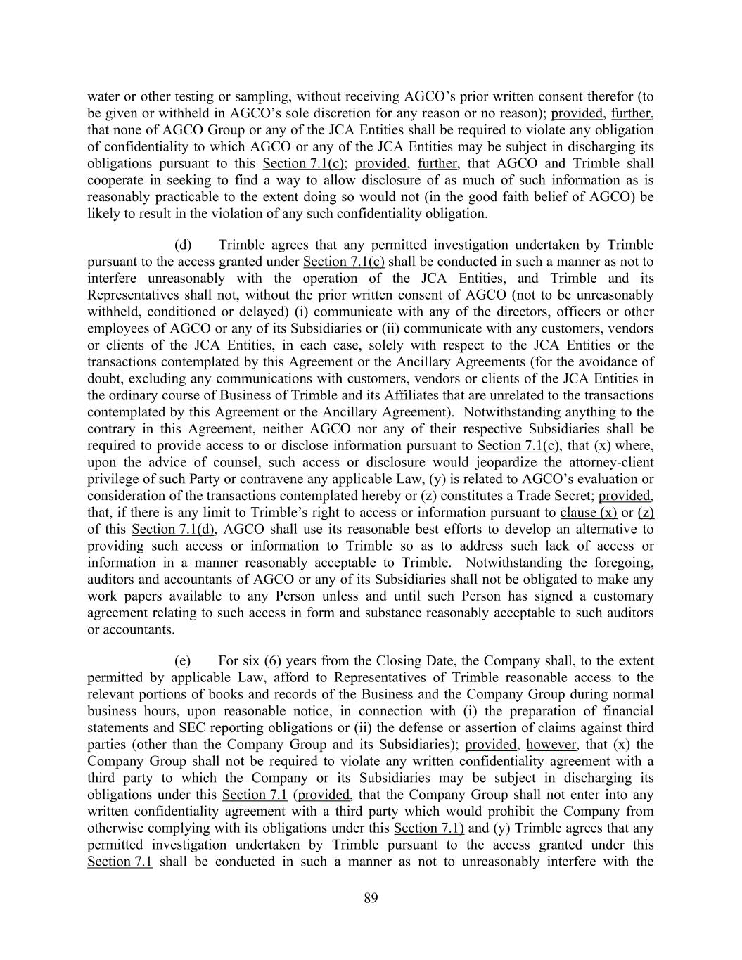 89 water or other testing or sampling, without receiving AGCO’s prior written consent therefor (to be given or withheld in AGCO’s sole discretion for any reason or no reason); provided, further, that none of AGCO Group or any of the JCA Entities shall be required to violate any obligation of confidentiality to which AGCO or any of the JCA Entities may be subject in discharging its obligations pursuant to this Section 7.1(c); provided, further, that AGCO and Trimble shall cooperate in seeking to find a way to allow disclosure of as much of such information as is reasonably practicable to the extent doing so would not (in the good faith belief of AGCO) be likely to result in the violation of any such confidentiality obligation. (d) Trimble agrees that any permitted investigation undertaken by Trimble pursuant to the access granted under Section 7.1(c) shall be conducted in such a manner as not to interfere unreasonably with the operation of the JCA Entities, and Trimble and its Representatives shall not, without the prior written consent of AGCO (not to be unreasonably withheld, conditioned or delayed) (i) communicate with any of the directors, officers or other employees of AGCO or any of its Subsidiaries or (ii) communicate with any customers, vendors or clients of the JCA Entities, in each case, solely with respect to the JCA Entities or the transactions contemplated by this Agreement or the Ancillary Agreements (for the avoidance of doubt, excluding any communications with customers, vendors or clients of the JCA Entities in the ordinary course of Business of Trimble and its Affiliates that are unrelated to the transactions contemplated by this Agreement or the Ancillary Agreement). Notwithstanding anything to the contrary in this Agreement, neither AGCO nor any of their respective Subsidiaries shall be required to provide access to or disclose information pursuant to Section 7.1(c), that (x) where, upon the advice of counsel, such access or disclosure would jeopardize the attorney-client privilege of such Party or contravene any applicable Law, (y) is related to AGCO’s evaluation or consideration of the transactions contemplated hereby or (z) constitutes a Trade Secret; provided, that, if there is any limit to Trimble’s right to access or information pursuant to clause (x) or (z) of this Section 7.1(d), AGCO shall use its reasonable best efforts to develop an alternative to providing such access or information to Trimble so as to address such lack of access or information in a manner reasonably acceptable to Trimble. Notwithstanding the foregoing, auditors and accountants of AGCO or any of its Subsidiaries shall not be obligated to make any work papers available to any Person unless and until such Person has signed a customary agreement relating to such access in form and substance reasonably acceptable to such auditors or accountants. (e) For six (6) years from the Closing Date, the Company shall, to the extent permitted by applicable Law, afford to Representatives of Trimble reasonable access to the relevant portions of books and records of the Business and the Company Group during normal business hours, upon reasonable notice, in connection with (i) the preparation of financial statements and SEC reporting obligations or (ii) the defense or assertion of claims against third parties (other than the Company Group and its Subsidiaries); provided, however, that (x) the Company Group shall not be required to violate any written confidentiality agreement with a third party to which the Company or its Subsidiaries may be subject in discharging its obligations under this Section 7.1 (provided, that the Company Group shall not enter into any written confidentiality agreement with a third party which would prohibit the Company from otherwise complying with its obligations under this Section 7.1) and (y) Trimble agrees that any permitted investigation undertaken by Trimble pursuant to the access granted under this Section 7.1 shall be conducted in such a manner as not to unreasonably interfere with the