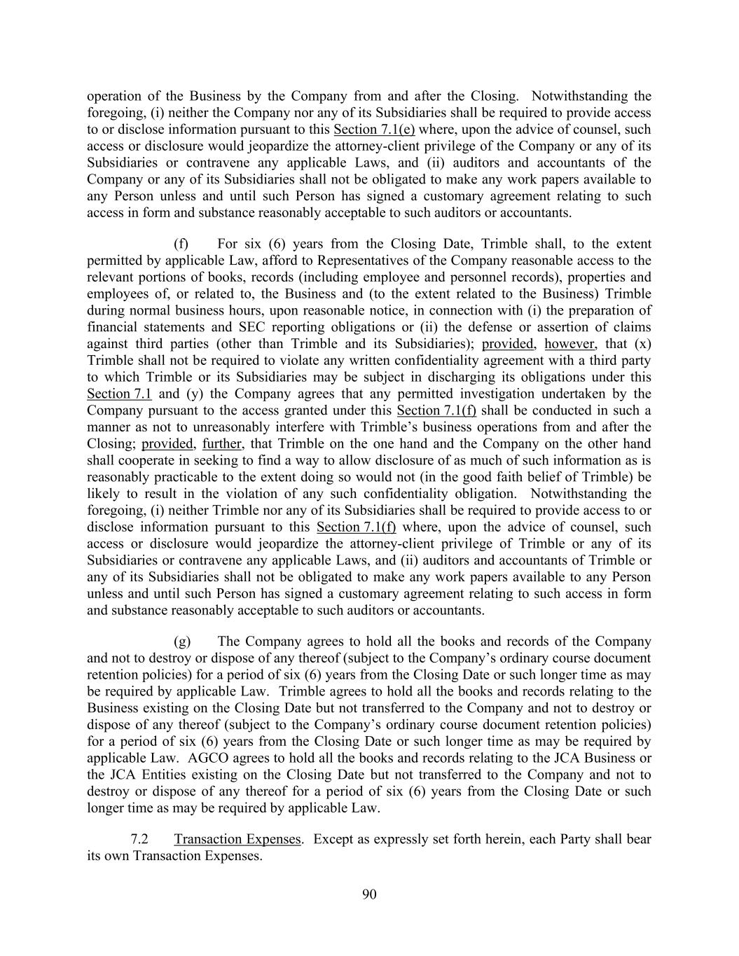 90 operation of the Business by the Company from and after the Closing. Notwithstanding the foregoing, (i) neither the Company nor any of its Subsidiaries shall be required to provide access to or disclose information pursuant to this Section 7.1(e) where, upon the advice of counsel, such access or disclosure would jeopardize the attorney-client privilege of the Company or any of its Subsidiaries or contravene any applicable Laws, and (ii) auditors and accountants of the Company or any of its Subsidiaries shall not be obligated to make any work papers available to any Person unless and until such Person has signed a customary agreement relating to such access in form and substance reasonably acceptable to such auditors or accountants. (f) For six (6) years from the Closing Date, Trimble shall, to the extent permitted by applicable Law, afford to Representatives of the Company reasonable access to the relevant portions of books, records (including employee and personnel records), properties and employees of, or related to, the Business and (to the extent related to the Business) Trimble during normal business hours, upon reasonable notice, in connection with (i) the preparation of financial statements and SEC reporting obligations or (ii) the defense or assertion of claims against third parties (other than Trimble and its Subsidiaries); provided, however, that (x) Trimble shall not be required to violate any written confidentiality agreement with a third party to which Trimble or its Subsidiaries may be subject in discharging its obligations under this Section 7.1 and (y) the Company agrees that any permitted investigation undertaken by the Company pursuant to the access granted under this Section 7.1(f) shall be conducted in such a manner as not to unreasonably interfere with Trimble’s business operations from and after the Closing; provided, further, that Trimble on the one hand and the Company on the other hand shall cooperate in seeking to find a way to allow disclosure of as much of such information as is reasonably practicable to the extent doing so would not (in the good faith belief of Trimble) be likely to result in the violation of any such confidentiality obligation. Notwithstanding the foregoing, (i) neither Trimble nor any of its Subsidiaries shall be required to provide access to or disclose information pursuant to this Section 7.1(f) where, upon the advice of counsel, such access or disclosure would jeopardize the attorney-client privilege of Trimble or any of its Subsidiaries or contravene any applicable Laws, and (ii) auditors and accountants of Trimble or any of its Subsidiaries shall not be obligated to make any work papers available to any Person unless and until such Person has signed a customary agreement relating to such access in form and substance reasonably acceptable to such auditors or accountants. (g) The Company agrees to hold all the books and records of the Company and not to destroy or dispose of any thereof (subject to the Company’s ordinary course document retention policies) for a period of six (6) years from the Closing Date or such longer time as may be required by applicable Law. Trimble agrees to hold all the books and records relating to the Business existing on the Closing Date but not transferred to the Company and not to destroy or dispose of any thereof (subject to the Company’s ordinary course document retention policies) for a period of six (6) years from the Closing Date or such longer time as may be required by applicable Law. AGCO agrees to hold all the books and records relating to the JCA Business or the JCA Entities existing on the Closing Date but not transferred to the Company and not to destroy or dispose of any thereof for a period of six (6) years from the Closing Date or such longer time as may be required by applicable Law. 7.2 Transaction Expenses. Except as expressly set forth herein, each Party shall bear its own Transaction Expenses.