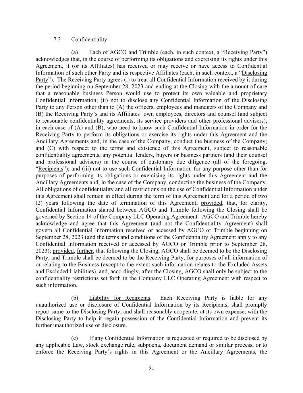 91 7.3 Confidentiality. (a) Each of AGCO and Trimble (each, in such context, a “Receiving Party”) acknowledges that, in the course of performing its obligations and exercising its rights under this Agreement, it (or its Affiliates) has received or may receive or have access to Confidential Information of such other Party and its respective Affiliates (each, in such context, a “Disclosing Party”). The Receiving Party agrees (i) to treat all Confidential Information received by it during the period beginning on September 28, 2023 and ending at the Closing with the amount of care that a reasonable business Person would use to protect its own valuable and proprietary Confidential Information; (ii) not to disclose any Confidential Information of the Disclosing Party to any Person other than to (A) the officers, employees and managers of the Company and (B) the Receiving Party’s and its Affiliates’ own employees, directors and counsel (and subject to reasonable confidentiality agreements, its service providers and other professional advisers), in each case of (A) and (B), who need to know such Confidential Information in order for the Receiving Party to perform its obligations or exercise its rights under this Agreement and the Ancillary Agreements and, in the case of the Company, conduct the business of the Company; and (C) with respect to the terms and existence of this Agreement, subject to reasonable confidentiality agreements, any potential lenders, buyers or business partners (and their counsel and professional advisers) in the course of customary due diligence (all of the foregoing, “Recipients”); and (iii) not to use such Confidential Information for any purpose other than for purposes of performing its obligations or exercising its rights under this Agreement and the Ancillary Agreements and, in the case of the Company, conducting the business of the Company. All obligations of confidentiality and all restrictions on the use of Confidential Information under this Agreement shall remain in effect during the term of this Agreement and for a period of two (2) years following the date of termination of this Agreement; provided, that, for clarity, Confidential Information shared between AGCO and Trimble following the Closing shall be governed by Section 14 of the Company LLC Operating Agreement. AGCO and Trimble hereby acknowledge and agree that this Agreement (and not the Confidentiality Agreement) shall govern all Confidential Information received or accessed by AGCO or Trimble beginning on September 28, 2023 (and the terms and conditions of the Confidentiality Agreement apply to any Confidential Information received or accessed by AGCO or Trimble prior to September 28, 2023); provided, further, that following the Closing, AGCO shall be deemed to be the Disclosing Party, and Trimble shall be deemed to be the Receiving Party, for purposes of all information of or relating to the Business (except to the extent such information relates to the Excluded Assets and Excluded Liabilities), and, accordingly, after the Closing, AGCO shall only be subject to the confidentiality restrictions set forth in the Company LLC Operating Agreement with respect to such information. (b) Liability for Recipients. Each Receiving Party is liable for any unauthorized use or disclosure of Confidential Information by its Recipients, shall promptly report same to the Disclosing Party, and shall reasonably cooperate, at its own expense, with the Disclosing Party to help it regain possession of the Confidential Information and prevent its further unauthorized use or disclosure. (c) If any Confidential Information is requested or required to be disclosed by any applicable Law, stock exchange rule, subpoena, document demand or similar process, or to enforce the Receiving Party’s rights in this Agreement or the Ancillary Agreements, the