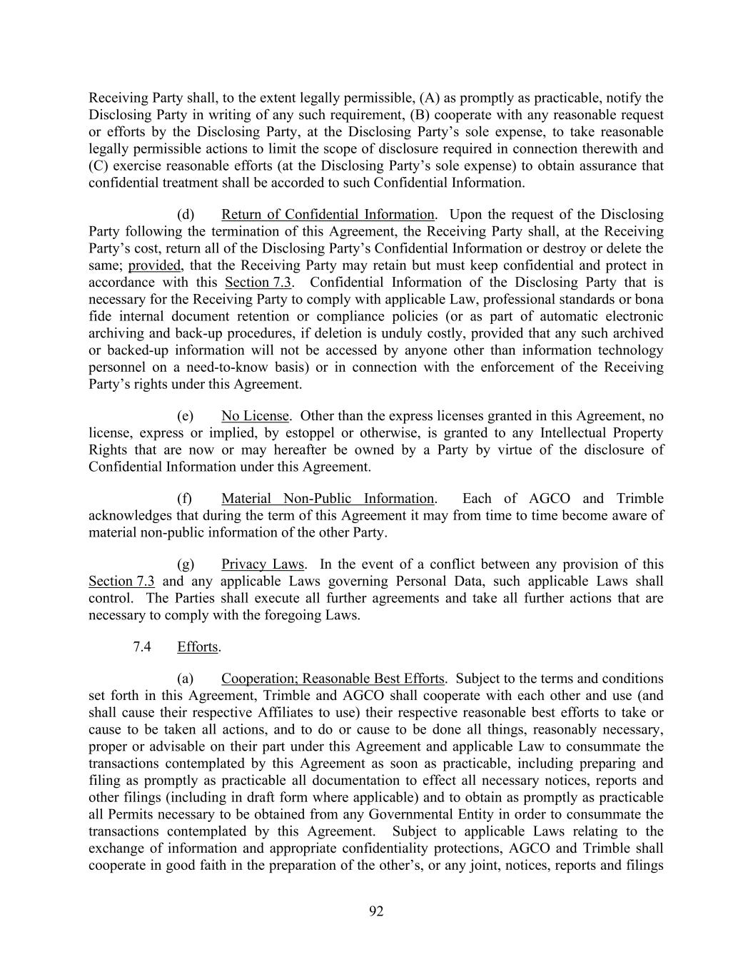 92 Receiving Party shall, to the extent legally permissible, (A) as promptly as practicable, notify the Disclosing Party in writing of any such requirement, (B) cooperate with any reasonable request or efforts by the Disclosing Party, at the Disclosing Party’s sole expense, to take reasonable legally permissible actions to limit the scope of disclosure required in connection therewith and (C) exercise reasonable efforts (at the Disclosing Party’s sole expense) to obtain assurance that confidential treatment shall be accorded to such Confidential Information. (d) Return of Confidential Information. Upon the request of the Disclosing Party following the termination of this Agreement, the Receiving Party shall, at the Receiving Party’s cost, return all of the Disclosing Party’s Confidential Information or destroy or delete the same; provided, that the Receiving Party may retain but must keep confidential and protect in accordance with this Section 7.3. Confidential Information of the Disclosing Party that is necessary for the Receiving Party to comply with applicable Law, professional standards or bona fide internal document retention or compliance policies (or as part of automatic electronic archiving and back-up procedures, if deletion is unduly costly, provided that any such archived or backed-up information will not be accessed by anyone other than information technology personnel on a need-to-know basis) or in connection with the enforcement of the Receiving Party’s rights under this Agreement. (e) No License. Other than the express licenses granted in this Agreement, no license, express or implied, by estoppel or otherwise, is granted to any Intellectual Property Rights that are now or may hereafter be owned by a Party by virtue of the disclosure of Confidential Information under this Agreement. (f) Material Non-Public Information. Each of AGCO and Trimble acknowledges that during the term of this Agreement it may from time to time become aware of material non-public information of the other Party. (g) Privacy Laws. In the event of a conflict between any provision of this Section 7.3 and any applicable Laws governing Personal Data, such applicable Laws shall control. The Parties shall execute all further agreements and take all further actions that are necessary to comply with the foregoing Laws. 7.4 Efforts. (a) Cooperation; Reasonable Best Efforts. Subject to the terms and conditions set forth in this Agreement, Trimble and AGCO shall cooperate with each other and use (and shall cause their respective Affiliates to use) their respective reasonable best efforts to take or cause to be taken all actions, and to do or cause to be done all things, reasonably necessary, proper or advisable on their part under this Agreement and applicable Law to consummate the transactions contemplated by this Agreement as soon as practicable, including preparing and filing as promptly as practicable all documentation to effect all necessary notices, reports and other filings (including in draft form where applicable) and to obtain as promptly as practicable all Permits necessary to be obtained from any Governmental Entity in order to consummate the transactions contemplated by this Agreement. Subject to applicable Laws relating to the exchange of information and appropriate confidentiality protections, AGCO and Trimble shall cooperate in good faith in the preparation of the other’s, or any joint, notices, reports and filings
