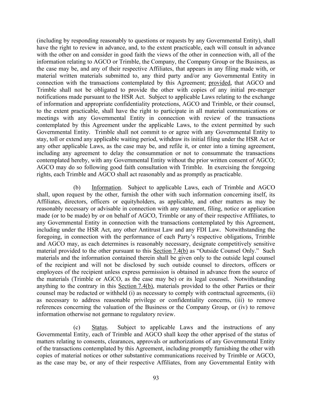 93 (including by responding reasonably to questions or requests by any Governmental Entity), shall have the right to review in advance, and, to the extent practicable, each will consult in advance with the other on and consider in good faith the views of the other in connection with, all of the information relating to AGCO or Trimble, the Company, the Company Group or the Business, as the case may be, and any of their respective Affiliates, that appears in any filing made with, or material written materials submitted to, any third party and/or any Governmental Entity in connection with the transactions contemplated by this Agreement; provided, that AGCO and Trimble shall not be obligated to provide the other with copies of any initial pre-merger notifications made pursuant to the HSR Act. Subject to applicable Laws relating to the exchange of information and appropriate confidentiality protections, AGCO and Trimble, or their counsel, to the extent practicable, shall have the right to participate in all material communications or meetings with any Governmental Entity in connection with review of the transactions contemplated by this Agreement under the applicable Laws, to the extent permitted by such Governmental Entity. Trimble shall not commit to or agree with any Governmental Entity to stay, toll or extend any applicable waiting period, withdraw its initial filing under the HSR Act or any other applicable Laws, as the case may be, and refile it, or enter into a timing agreement, including any agreement to delay the consummation or not to consummate the transactions contemplated hereby, with any Governmental Entity without the prior written consent of AGCO; AGCO may do so following good faith consultation with Trimble. In exercising the foregoing rights, each Trimble and AGCO shall act reasonably and as promptly as practicable. (b) Information. Subject to applicable Laws, each of Trimble and AGCO shall, upon request by the other, furnish the other with such information concerning itself, its Affiliates, directors, officers or equityholders, as applicable, and other matters as may be reasonably necessary or advisable in connection with any statement, filing, notice or application made (or to be made) by or on behalf of AGCO, Trimble or any of their respective Affiliates, to any Governmental Entity in connection with the transactions contemplated by this Agreement, including under the HSR Act, any other Antitrust Law and any FDI Law. Notwithstanding the foregoing, in connection with the performance of each Party’s respective obligations, Trimble and AGCO may, as each determines is reasonably necessary, designate competitively sensitive material provided to the other pursuant to this Section 7.4(b) as “Outside Counsel Only.” Such materials and the information contained therein shall be given only to the outside legal counsel of the recipient and will not be disclosed by such outside counsel to directors, officers or employees of the recipient unless express permission is obtained in advance from the source of the materials (Trimble or AGCO, as the case may be) or its legal counsel. Notwithstanding anything to the contrary in this Section 7.4(b), materials provided to the other Parties or their counsel may be redacted or withheld (i) as necessary to comply with contractual agreements, (ii) as necessary to address reasonable privilege or confidentiality concerns, (iii) to remove references concerning the valuation of the Business or the Company Group, or (iv) to remove information otherwise not germane to regulatory review. (c) Status. Subject to applicable Laws and the instructions of any Governmental Entity, each of Trimble and AGCO shall keep the other apprised of the status of matters relating to consents, clearances, approvals or authorizations of any Governmental Entity of the transactions contemplated by this Agreement, including promptly furnishing the other with copies of material notices or other substantive communications received by Trimble or AGCO, as the case may be, or any of their respective Affiliates, from any Governmental Entity with