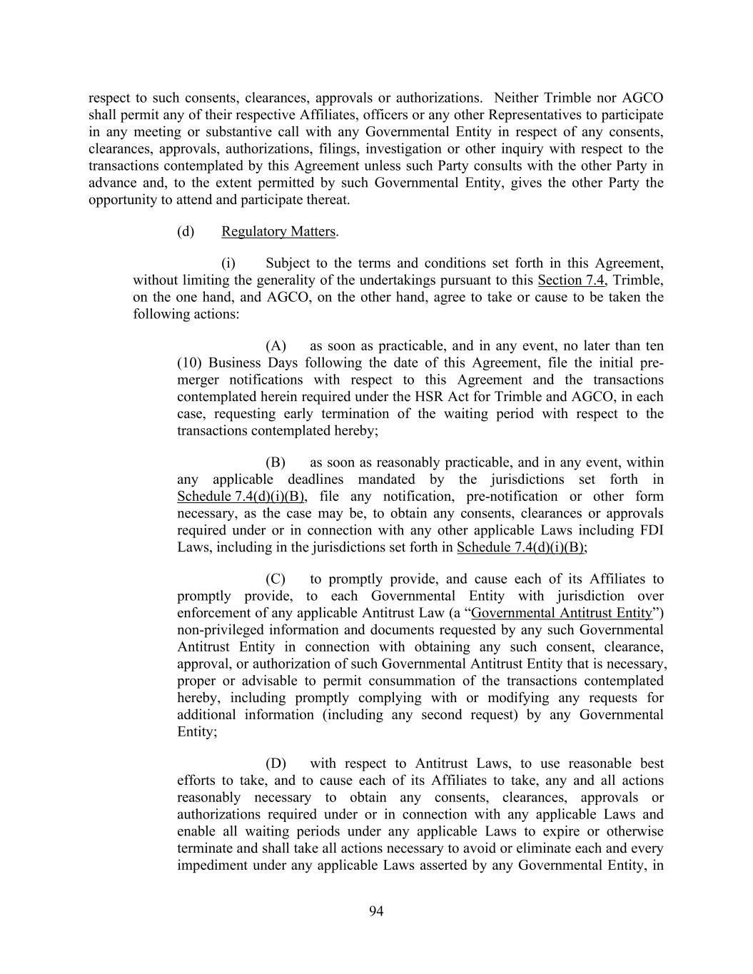 94 respect to such consents, clearances, approvals or authorizations. Neither Trimble nor AGCO shall permit any of their respective Affiliates, officers or any other Representatives to participate in any meeting or substantive call with any Governmental Entity in respect of any consents, clearances, approvals, authorizations, filings, investigation or other inquiry with respect to the transactions contemplated by this Agreement unless such Party consults with the other Party in advance and, to the extent permitted by such Governmental Entity, gives the other Party the opportunity to attend and participate thereat. (d) Regulatory Matters. (i) Subject to the terms and conditions set forth in this Agreement, without limiting the generality of the undertakings pursuant to this Section 7.4, Trimble, on the one hand, and AGCO, on the other hand, agree to take or cause to be taken the following actions: (A) as soon as practicable, and in any event, no later than ten (10) Business Days following the date of this Agreement, file the initial pre- merger notifications with respect to this Agreement and the transactions contemplated herein required under the HSR Act for Trimble and AGCO, in each case, requesting early termination of the waiting period with respect to the transactions contemplated hereby; (B) as soon as reasonably practicable, and in any event, within any applicable deadlines mandated by the jurisdictions set forth in Schedule 7.4(d)(i)(B), file any notification, pre-notification or other form necessary, as the case may be, to obtain any consents, clearances or approvals required under or in connection with any other applicable Laws including FDI Laws, including in the jurisdictions set forth in Schedule 7.4(d)(i)(B); (C) to promptly provide, and cause each of its Affiliates to promptly provide, to each Governmental Entity with jurisdiction over enforcement of any applicable Antitrust Law (a “Governmental Antitrust Entity”) non-privileged information and documents requested by any such Governmental Antitrust Entity in connection with obtaining any such consent, clearance, approval, or authorization of such Governmental Antitrust Entity that is necessary, proper or advisable to permit consummation of the transactions contemplated hereby, including promptly complying with or modifying any requests for additional information (including any second request) by any Governmental Entity; (D) with respect to Antitrust Laws, to use reasonable best efforts to take, and to cause each of its Affiliates to take, any and all actions reasonably necessary to obtain any consents, clearances, approvals or authorizations required under or in connection with any applicable Laws and enable all waiting periods under any applicable Laws to expire or otherwise terminate and shall take all actions necessary to avoid or eliminate each and every impediment under any applicable Laws asserted by any Governmental Entity, in