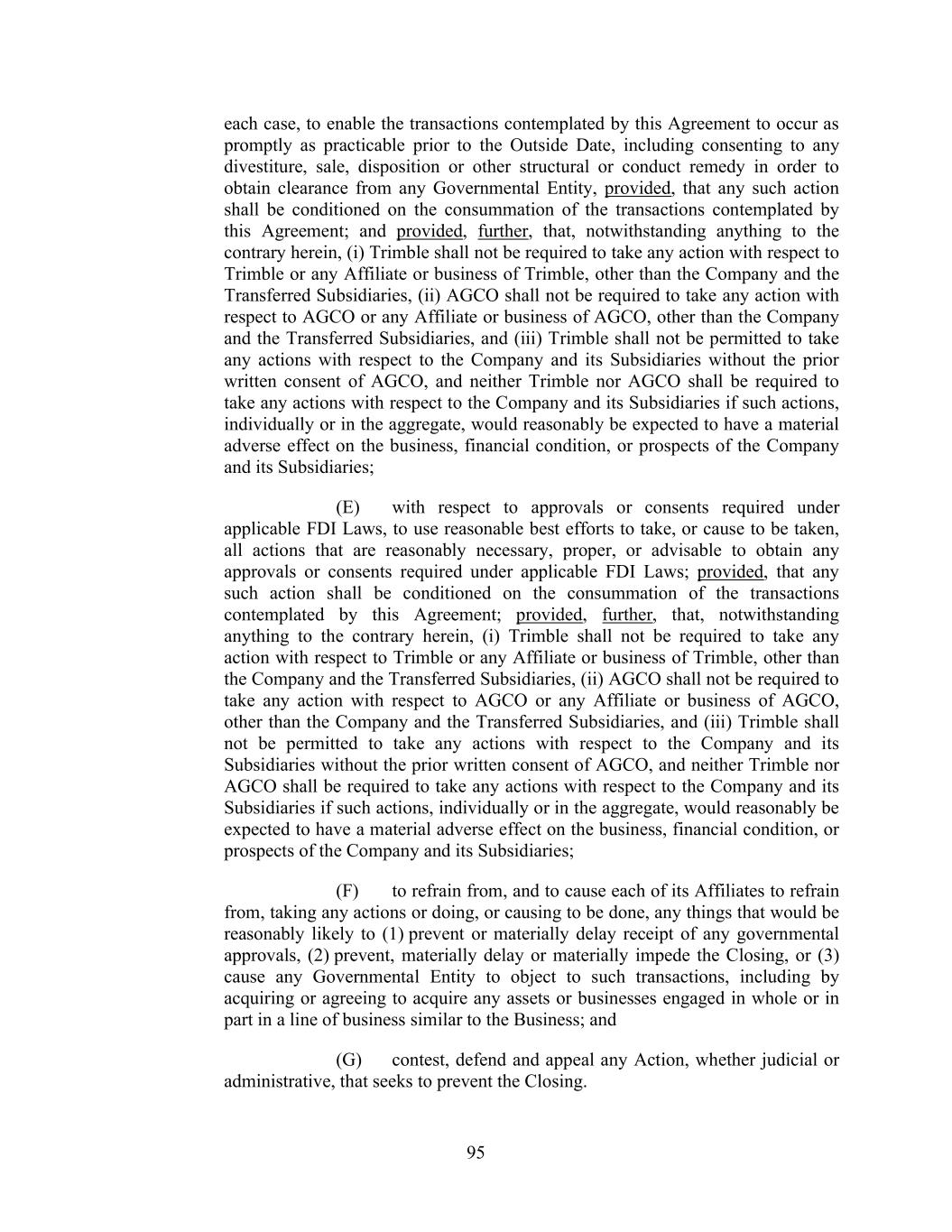 95 each case, to enable the transactions contemplated by this Agreement to occur as promptly as practicable prior to the Outside Date, including consenting to any divestiture, sale, disposition or other structural or conduct remedy in order to obtain clearance from any Governmental Entity, provided, that any such action shall be conditioned on the consummation of the transactions contemplated by this Agreement; and provided, further, that, notwithstanding anything to the contrary herein, (i) Trimble shall not be required to take any action with respect to Trimble or any Affiliate or business of Trimble, other than the Company and the Transferred Subsidiaries, (ii) AGCO shall not be required to take any action with respect to AGCO or any Affiliate or business of AGCO, other than the Company and the Transferred Subsidiaries, and (iii) Trimble shall not be permitted to take any actions with respect to the Company and its Subsidiaries without the prior written consent of AGCO, and neither Trimble nor AGCO shall be required to take any actions with respect to the Company and its Subsidiaries if such actions, individually or in the aggregate, would reasonably be expected to have a material adverse effect on the business, financial condition, or prospects of the Company and its Subsidiaries; (E) with respect to approvals or consents required under applicable FDI Laws, to use reasonable best efforts to take, or cause to be taken, all actions that are reasonably necessary, proper, or advisable to obtain any approvals or consents required under applicable FDI Laws; provided, that any such action shall be conditioned on the consummation of the transactions contemplated by this Agreement; provided, further, that, notwithstanding anything to the contrary herein, (i) Trimble shall not be required to take any action with respect to Trimble or any Affiliate or business of Trimble, other than the Company and the Transferred Subsidiaries, (ii) AGCO shall not be required to take any action with respect to AGCO or any Affiliate or business of AGCO, other than the Company and the Transferred Subsidiaries, and (iii) Trimble shall not be permitted to take any actions with respect to the Company and its Subsidiaries without the prior written consent of AGCO, and neither Trimble nor AGCO shall be required to take any actions with respect to the Company and its Subsidiaries if such actions, individually or in the aggregate, would reasonably be expected to have a material adverse effect on the business, financial condition, or prospects of the Company and its Subsidiaries; (F) to refrain from, and to cause each of its Affiliates to refrain from, taking any actions or doing, or causing to be done, any things that would be reasonably likely to (1) prevent or materially delay receipt of any governmental approvals, (2) prevent, materially delay or materially impede the Closing, or (3) cause any Governmental Entity to object to such transactions, including by acquiring or agreeing to acquire any assets or businesses engaged in whole or in part in a line of business similar to the Business; and (G) contest, defend and appeal any Action, whether judicial or administrative, that seeks to prevent the Closing.