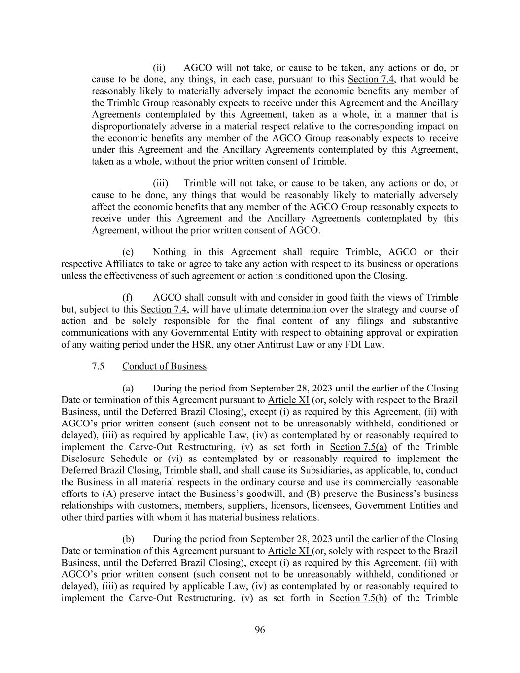 96 (ii) AGCO will not take, or cause to be taken, any actions or do, or cause to be done, any things, in each case, pursuant to this Section 7.4, that would be reasonably likely to materially adversely impact the economic benefits any member of the Trimble Group reasonably expects to receive under this Agreement and the Ancillary Agreements contemplated by this Agreement, taken as a whole, in a manner that is disproportionately adverse in a material respect relative to the corresponding impact on the economic benefits any member of the AGCO Group reasonably expects to receive under this Agreement and the Ancillary Agreements contemplated by this Agreement, taken as a whole, without the prior written consent of Trimble. (iii) Trimble will not take, or cause to be taken, any actions or do, or cause to be done, any things that would be reasonably likely to materially adversely affect the economic benefits that any member of the AGCO Group reasonably expects to receive under this Agreement and the Ancillary Agreements contemplated by this Agreement, without the prior written consent of AGCO. (e) Nothing in this Agreement shall require Trimble, AGCO or their respective Affiliates to take or agree to take any action with respect to its business or operations unless the effectiveness of such agreement or action is conditioned upon the Closing. (f) AGCO shall consult with and consider in good faith the views of Trimble but, subject to this Section 7.4, will have ultimate determination over the strategy and course of action and be solely responsible for the final content of any filings and substantive communications with any Governmental Entity with respect to obtaining approval or expiration of any waiting period under the HSR, any other Antitrust Law or any FDI Law. 7.5 Conduct of Business. (a) During the period from September 28, 2023 until the earlier of the Closing Date or termination of this Agreement pursuant to Article XI (or, solely with respect to the Brazil Business, until the Deferred Brazil Closing), except (i) as required by this Agreement, (ii) with AGCO’s prior written consent (such consent not to be unreasonably withheld, conditioned or delayed), (iii) as required by applicable Law, (iv) as contemplated by or reasonably required to implement the Carve-Out Restructuring, (v) as set forth in Section 7.5(a) of the Trimble Disclosure Schedule or (vi) as contemplated by or reasonably required to implement the Deferred Brazil Closing, Trimble shall, and shall cause its Subsidiaries, as applicable, to, conduct the Business in all material respects in the ordinary course and use its commercially reasonable efforts to (A) preserve intact the Business’s goodwill, and (B) preserve the Business’s business relationships with customers, members, suppliers, licensors, licensees, Government Entities and other third parties with whom it has material business relations. (b) During the period from September 28, 2023 until the earlier of the Closing Date or termination of this Agreement pursuant to Article XI (or, solely with respect to the Brazil Business, until the Deferred Brazil Closing), except (i) as required by this Agreement, (ii) with AGCO’s prior written consent (such consent not to be unreasonably withheld, conditioned or delayed), (iii) as required by applicable Law, (iv) as contemplated by or reasonably required to implement the Carve-Out Restructuring, (v) as set forth in Section 7.5(b) of the Trimble