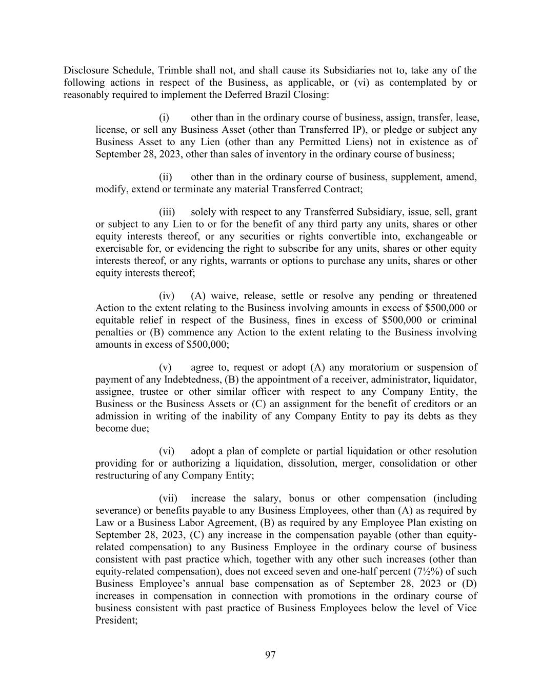 97 Disclosure Schedule, Trimble shall not, and shall cause its Subsidiaries not to, take any of the following actions in respect of the Business, as applicable, or (vi) as contemplated by or reasonably required to implement the Deferred Brazil Closing: (i) other than in the ordinary course of business, assign, transfer, lease, license, or sell any Business Asset (other than Transferred IP), or pledge or subject any Business Asset to any Lien (other than any Permitted Liens) not in existence as of September 28, 2023, other than sales of inventory in the ordinary course of business; (ii) other than in the ordinary course of business, supplement, amend, modify, extend or terminate any material Transferred Contract; (iii) solely with respect to any Transferred Subsidiary, issue, sell, grant or subject to any Lien to or for the benefit of any third party any units, shares or other equity interests thereof, or any securities or rights convertible into, exchangeable or exercisable for, or evidencing the right to subscribe for any units, shares or other equity interests thereof, or any rights, warrants or options to purchase any units, shares or other equity interests thereof; (iv) (A) waive, release, settle or resolve any pending or threatened Action to the extent relating to the Business involving amounts in excess of $500,000 or equitable relief in respect of the Business, fines in excess of $500,000 or criminal penalties or (B) commence any Action to the extent relating to the Business involving amounts in excess of $500,000; (v) agree to, request or adopt (A) any moratorium or suspension of payment of any Indebtedness, (B) the appointment of a receiver, administrator, liquidator, assignee, trustee or other similar officer with respect to any Company Entity, the Business or the Business Assets or (C) an assignment for the benefit of creditors or an admission in writing of the inability of any Company Entity to pay its debts as they become due; (vi) adopt a plan of complete or partial liquidation or other resolution providing for or authorizing a liquidation, dissolution, merger, consolidation or other restructuring of any Company Entity; (vii) increase the salary, bonus or other compensation (including severance) or benefits payable to any Business Employees, other than (A) as required by Law or a Business Labor Agreement, (B) as required by any Employee Plan existing on September 28, 2023, (C) any increase in the compensation payable (other than equity- related compensation) to any Business Employee in the ordinary course of business consistent with past practice which, together with any other such increases (other than equity-related compensation), does not exceed seven and one-half percent (7½%) of such Business Employee’s annual base compensation as of September 28, 2023 or (D) increases in compensation in connection with promotions in the ordinary course of business consistent with past practice of Business Employees below the level of Vice President;