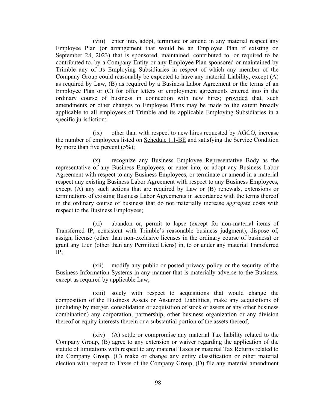 98 (viii) enter into, adopt, terminate or amend in any material respect any Employee Plan (or arrangement that would be an Employee Plan if existing on September 28, 2023) that is sponsored, maintained, contributed to, or required to be contributed to, by a Company Entity or any Employee Plan sponsored or maintained by Trimble any of its Employing Subsidiaries in respect of which any member of the Company Group could reasonably be expected to have any material Liability, except (A) as required by Law, (B) as required by a Business Labor Agreement or the terms of an Employee Plan or (C) for offer letters or employment agreements entered into in the ordinary course of business in connection with new hires; provided that, such amendments or other changes to Employee Plans may be made to the extent broadly applicable to all employees of Trimble and its applicable Employing Subsidiaries in a specific jurisdiction; (ix) other than with respect to new hires requested by AGCO, increase the number of employees listed on Schedule 1.1-BE and satisfying the Service Condition by more than five percent (5%); (x) recognize any Business Employee Representative Body as the representative of any Business Employees, or enter into, or adopt any Business Labor Agreement with respect to any Business Employees, or terminate or amend in a material respect any existing Business Labor Agreement with respect to any Business Employees, except (A) any such actions that are required by Law or (B) renewals, extensions or terminations of existing Business Labor Agreements in accordance with the terms thereof in the ordinary course of business that do not materially increase aggregate costs with respect to the Business Employees; (xi) abandon or, permit to lapse (except for non-material items of Transferred IP, consistent with Trimble’s reasonable business judgment), dispose of, assign, license (other than non-exclusive licenses in the ordinary course of business) or grant any Lien (other than any Permitted Liens) in, to or under any material Transferred IP; (xii) modify any public or posted privacy policy or the security of the Business Information Systems in any manner that is materially adverse to the Business, except as required by applicable Law; (xiii) solely with respect to acquisitions that would change the composition of the Business Assets or Assumed Liabilities, make any acquisitions of (including by merger, consolidation or acquisition of stock or assets or any other business combination) any corporation, partnership, other business organization or any division thereof or equity interests therein or a substantial portion of the assets thereof; (xiv) (A) settle or compromise any material Tax liability related to the Company Group, (B) agree to any extension or waiver regarding the application of the statute of limitations with respect to any material Taxes or material Tax Returns related to the Company Group, (C) make or change any entity classification or other material election with respect to Taxes of the Company Group, (D) file any material amendment