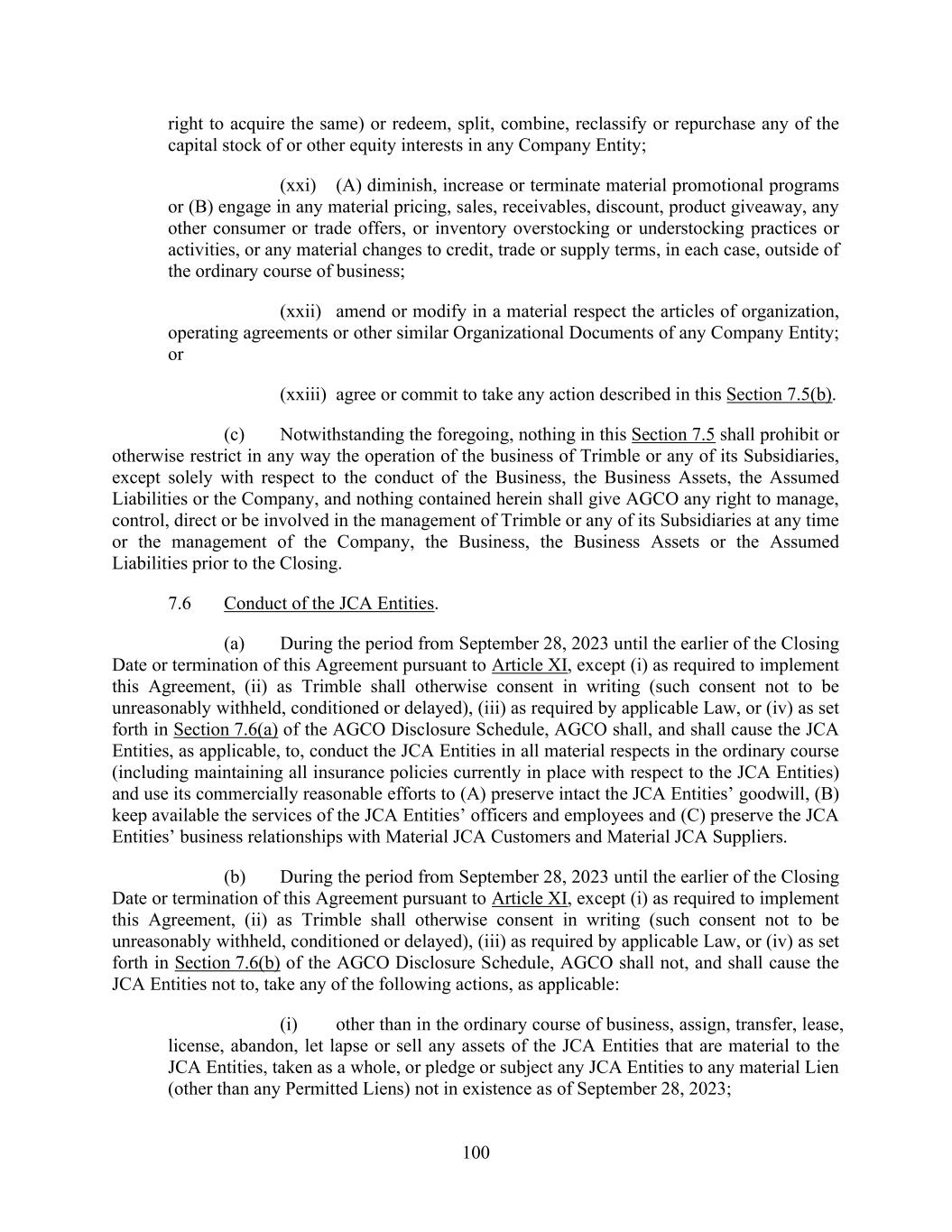 100 right to acquire the same) or redeem, split, combine, reclassify or repurchase any of the capital stock of or other equity interests in any Company Entity; (xxi) (A) diminish, increase or terminate material promotional programs or (B) engage in any material pricing, sales, receivables, discount, product giveaway, any other consumer or trade offers, or inventory overstocking or understocking practices or activities, or any material changes to credit, trade or supply terms, in each case, outside of the ordinary course of business; (xxii) amend or modify in a material respect the articles of organization, operating agreements or other similar Organizational Documents of any Company Entity; or (xxiii) agree or commit to take any action described in this Section 7.5(b). (c) Notwithstanding the foregoing, nothing in this Section 7.5 shall prohibit or otherwise restrict in any way the operation of the business of Trimble or any of its Subsidiaries, except solely with respect to the conduct of the Business, the Business Assets, the Assumed Liabilities or the Company, and nothing contained herein shall give AGCO any right to manage, control, direct or be involved in the management of Trimble or any of its Subsidiaries at any time or the management of the Company, the Business, the Business Assets or the Assumed Liabilities prior to the Closing. 7.6 Conduct of the JCA Entities. (a) During the period from September 28, 2023 until the earlier of the Closing Date or termination of this Agreement pursuant to Article XI, except (i) as required to implement this Agreement, (ii) as Trimble shall otherwise consent in writing (such consent not to be unreasonably withheld, conditioned or delayed), (iii) as required by applicable Law, or (iv) as set forth in Section 7.6(a) of the AGCO Disclosure Schedule, AGCO shall, and shall cause the JCA Entities, as applicable, to, conduct the JCA Entities in all material respects in the ordinary course (including maintaining all insurance policies currently in place with respect to the JCA Entities) and use its commercially reasonable efforts to (A) preserve intact the JCA Entities’ goodwill, (B) keep available the services of the JCA Entities’ officers and employees and (C) preserve the JCA Entities’ business relationships with Material JCA Customers and Material JCA Suppliers. (b) During the period from September 28, 2023 until the earlier of the Closing Date or termination of this Agreement pursuant to Article XI, except (i) as required to implement this Agreement, (ii) as Trimble shall otherwise consent in writing (such consent not to be unreasonably withheld, conditioned or delayed), (iii) as required by applicable Law, or (iv) as set forth in Section 7.6(b) of the AGCO Disclosure Schedule, AGCO shall not, and shall cause the JCA Entities not to, take any of the following actions, as applicable: (i) other than in the ordinary course of business, assign, transfer, lease, license, abandon, let lapse or sell any assets of the JCA Entities that are material to the JCA Entities, taken as a whole, or pledge or subject any JCA Entities to any material Lien (other than any Permitted Liens) not in existence as of September 28, 2023;