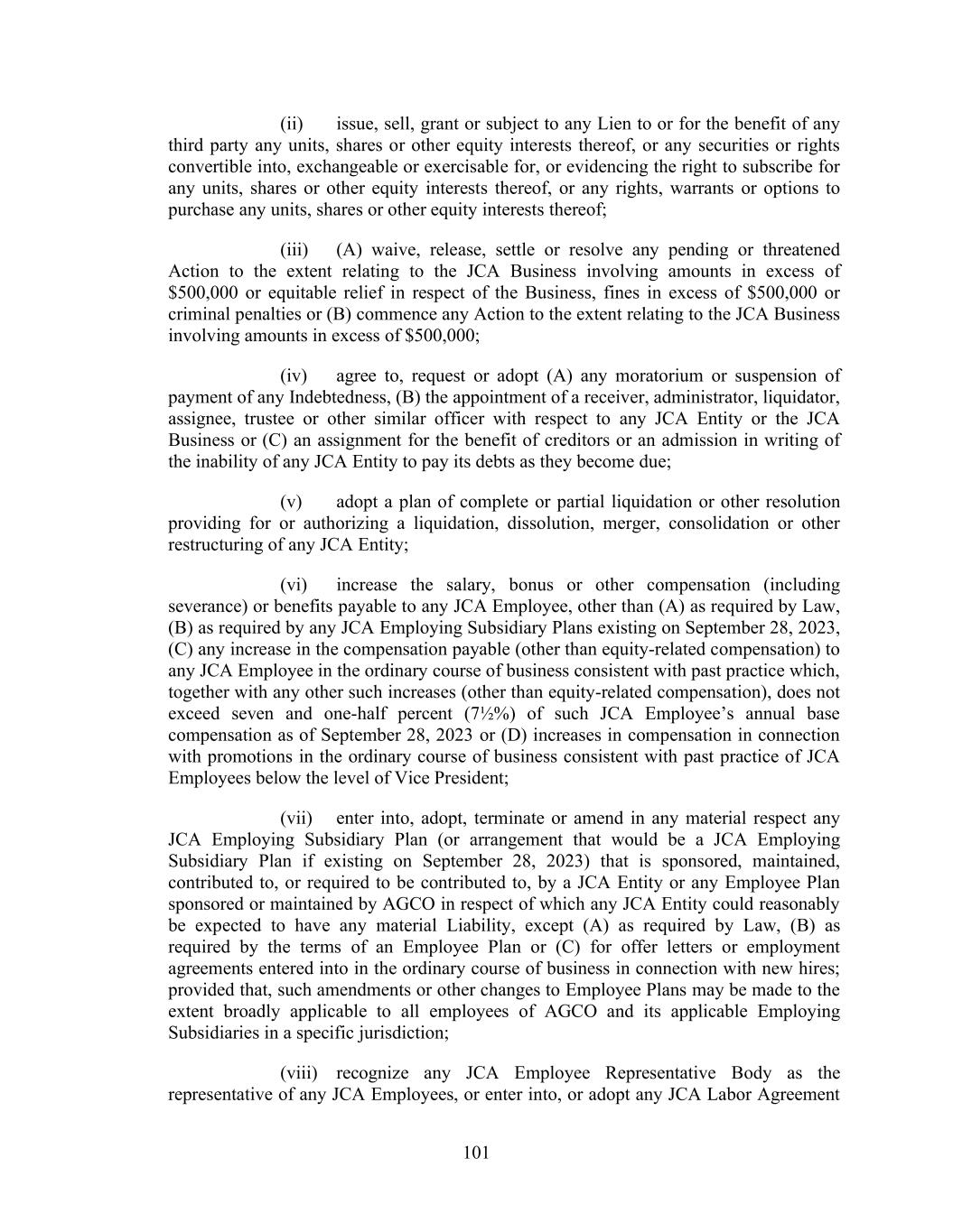 101 (ii) issue, sell, grant or subject to any Lien to or for the benefit of any third party any units, shares or other equity interests thereof, or any securities or rights convertible into, exchangeable or exercisable for, or evidencing the right to subscribe for any units, shares or other equity interests thereof, or any rights, warrants or options to purchase any units, shares or other equity interests thereof; (iii) (A) waive, release, settle or resolve any pending or threatened Action to the extent relating to the JCA Business involving amounts in excess of $500,000 or equitable relief in respect of the Business, fines in excess of $500,000 or criminal penalties or (B) commence any Action to the extent relating to the JCA Business involving amounts in excess of $500,000; (iv) agree to, request or adopt (A) any moratorium or suspension of payment of any Indebtedness, (B) the appointment of a receiver, administrator, liquidator, assignee, trustee or other similar officer with respect to any JCA Entity or the JCA Business or (C) an assignment for the benefit of creditors or an admission in writing of the inability of any JCA Entity to pay its debts as they become due; (v) adopt a plan of complete or partial liquidation or other resolution providing for or authorizing a liquidation, dissolution, merger, consolidation or other restructuring of any JCA Entity; (vi) increase the salary, bonus or other compensation (including severance) or benefits payable to any JCA Employee, other than (A) as required by Law, (B) as required by any JCA Employing Subsidiary Plans existing on September 28, 2023, (C) any increase in the compensation payable (other than equity-related compensation) to any JCA Employee in the ordinary course of business consistent with past practice which, together with any other such increases (other than equity-related compensation), does not exceed seven and one-half percent (7½%) of such JCA Employee’s annual base compensation as of September 28, 2023 or (D) increases in compensation in connection with promotions in the ordinary course of business consistent with past practice of JCA Employees below the level of Vice President; (vii) enter into, adopt, terminate or amend in any material respect any JCA Employing Subsidiary Plan (or arrangement that would be a JCA Employing Subsidiary Plan if existing on September 28, 2023) that is sponsored, maintained, contributed to, or required to be contributed to, by a JCA Entity or any Employee Plan sponsored or maintained by AGCO in respect of which any JCA Entity could reasonably be expected to have any material Liability, except (A) as required by Law, (B) as required by the terms of an Employee Plan or (C) for offer letters or employment agreements entered into in the ordinary course of business in connection with new hires; provided that, such amendments or other changes to Employee Plans may be made to the extent broadly applicable to all employees of AGCO and its applicable Employing Subsidiaries in a specific jurisdiction; (viii) recognize any JCA Employee Representative Body as the representative of any JCA Employees, or enter into, or adopt any JCA Labor Agreement