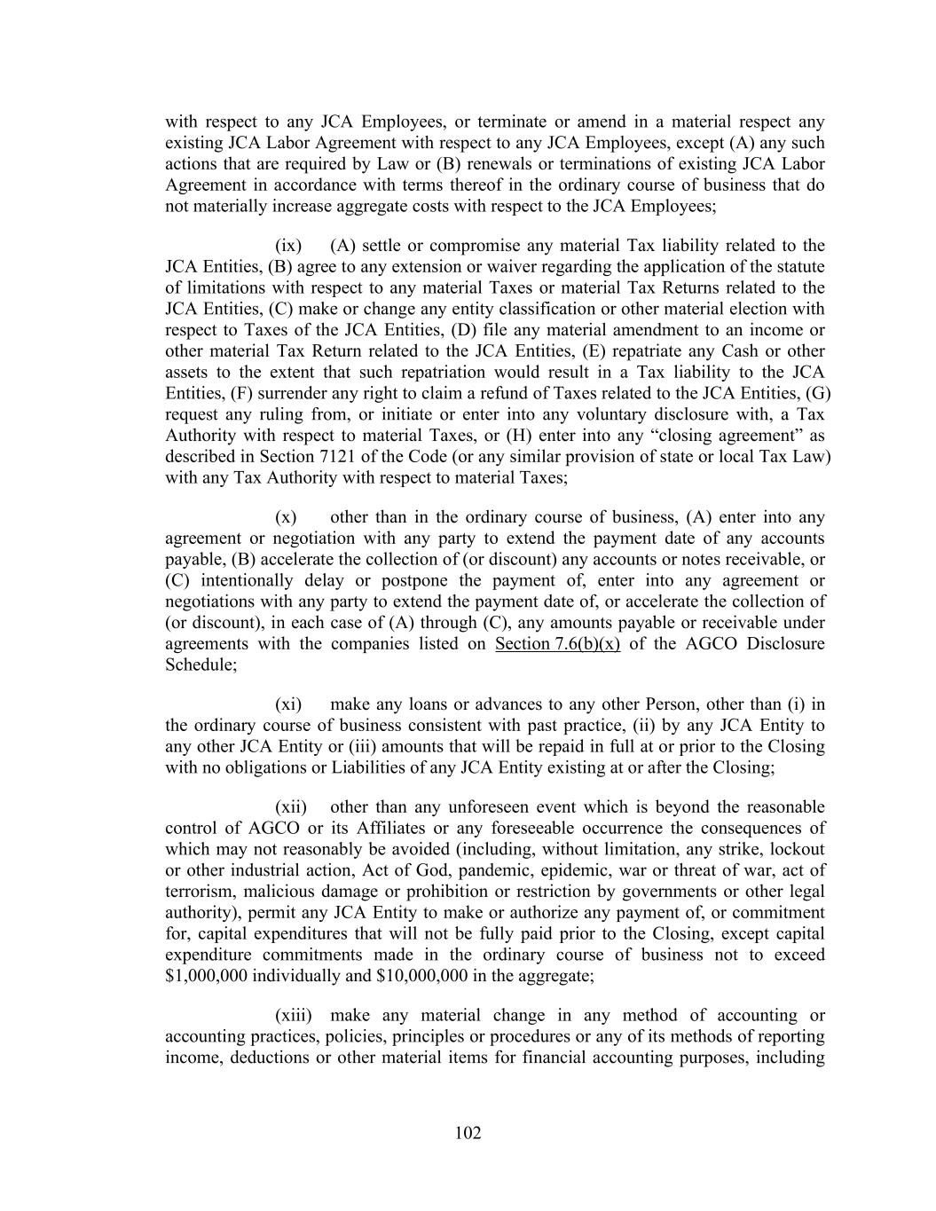 102 with respect to any JCA Employees, or terminate or amend in a material respect any existing JCA Labor Agreement with respect to any JCA Employees, except (A) any such actions that are required by Law or (B) renewals or terminations of existing JCA Labor Agreement in accordance with terms thereof in the ordinary course of business that do not materially increase aggregate costs with respect to the JCA Employees; (ix) (A) settle or compromise any material Tax liability related to the JCA Entities, (B) agree to any extension or waiver regarding the application of the statute of limitations with respect to any material Taxes or material Tax Returns related to the JCA Entities, (C) make or change any entity classification or other material election with respect to Taxes of the JCA Entities, (D) file any material amendment to an income or other material Tax Return related to the JCA Entities, (E) repatriate any Cash or other assets to the extent that such repatriation would result in a Tax liability to the JCA Entities, (F) surrender any right to claim a refund of Taxes related to the JCA Entities, (G) request any ruling from, or initiate or enter into any voluntary disclosure with, a Tax Authority with respect to material Taxes, or (H) enter into any “closing agreement” as described in Section 7121 of the Code (or any similar provision of state or local Tax Law) with any Tax Authority with respect to material Taxes; (x) other than in the ordinary course of business, (A) enter into any agreement or negotiation with any party to extend the payment date of any accounts payable, (B) accelerate the collection of (or discount) any accounts or notes receivable, or (C) intentionally delay or postpone the payment of, enter into any agreement or negotiations with any party to extend the payment date of, or accelerate the collection of (or discount), in each case of (A) through (C), any amounts payable or receivable under agreements with the companies listed on Section 7.6(b)(x) of the AGCO Disclosure Schedule; (xi) make any loans or advances to any other Person, other than (i) in the ordinary course of business consistent with past practice, (ii) by any JCA Entity to any other JCA Entity or (iii) amounts that will be repaid in full at or prior to the Closing with no obligations or Liabilities of any JCA Entity existing at or after the Closing; (xii) other than any unforeseen event which is beyond the reasonable control of AGCO or its Affiliates or any foreseeable occurrence the consequences of which may not reasonably be avoided (including, without limitation, any strike, lockout or other industrial action, Act of God, pandemic, epidemic, war or threat of war, act of terrorism, malicious damage or prohibition or restriction by governments or other legal authority), permit any JCA Entity to make or authorize any payment of, or commitment for, capital expenditures that will not be fully paid prior to the Closing, except capital expenditure commitments made in the ordinary course of business not to exceed $1,000,000 individually and $10,000,000 in the aggregate; (xiii) make any material change in any method of accounting or accounting practices, policies, principles or procedures or any of its methods of reporting income, deductions or other material items for financial accounting purposes, including