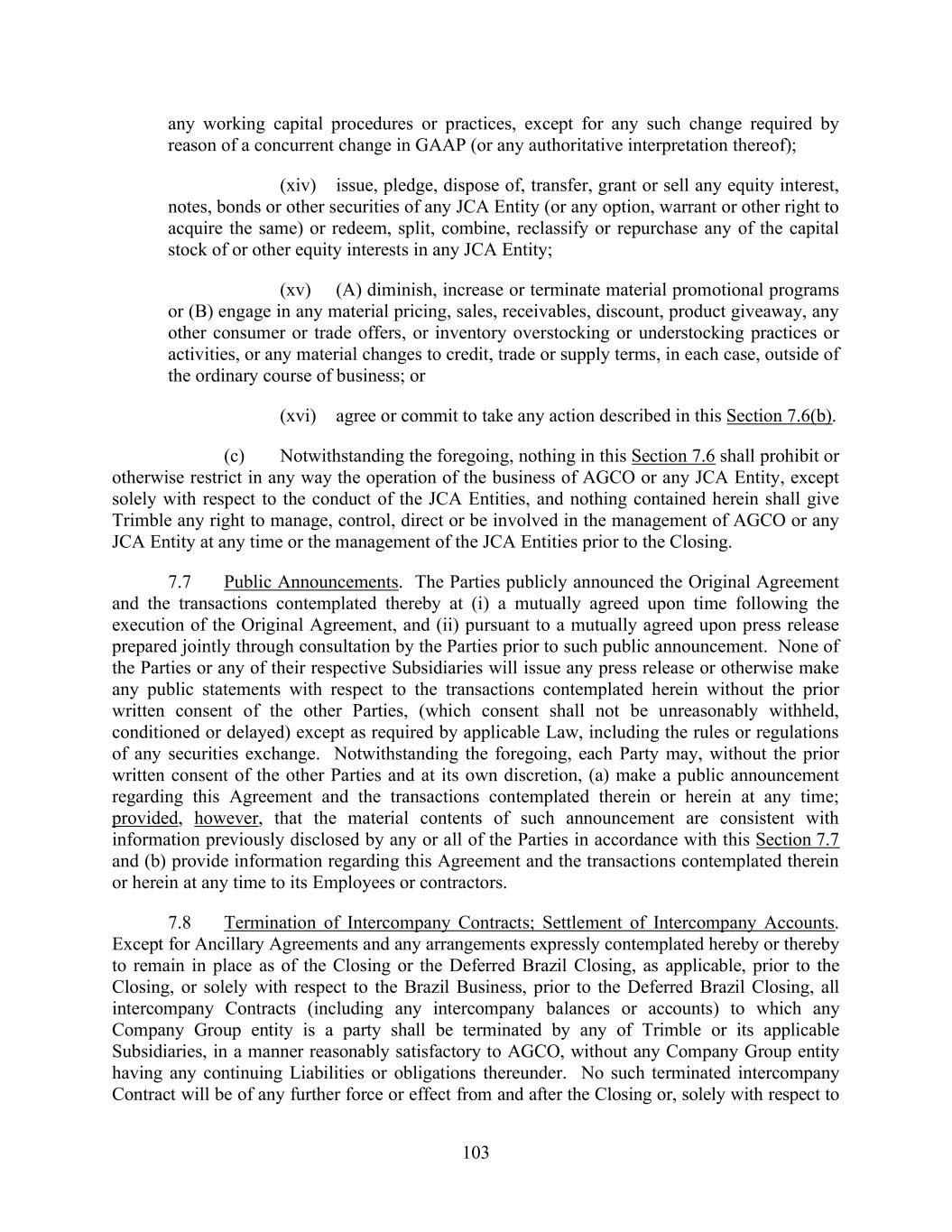 103 any working capital procedures or practices, except for any such change required by reason of a concurrent change in GAAP (or any authoritative interpretation thereof); (xiv) issue, pledge, dispose of, transfer, grant or sell any equity interest, notes, bonds or other securities of any JCA Entity (or any option, warrant or other right to acquire the same) or redeem, split, combine, reclassify or repurchase any of the capital stock of or other equity interests in any JCA Entity; (xv) (A) diminish, increase or terminate material promotional programs or (B) engage in any material pricing, sales, receivables, discount, product giveaway, any other consumer or trade offers, or inventory overstocking or understocking practices or activities, or any material changes to credit, trade or supply terms, in each case, outside of the ordinary course of business; or (xvi) agree or commit to take any action described in this Section 7.6(b). (c) Notwithstanding the foregoing, nothing in this Section 7.6 shall prohibit or otherwise restrict in any way the operation of the business of AGCO or any JCA Entity, except solely with respect to the conduct of the JCA Entities, and nothing contained herein shall give Trimble any right to manage, control, direct or be involved in the management of AGCO or any JCA Entity at any time or the management of the JCA Entities prior to the Closing. 7.7 Public Announcements. The Parties publicly announced the Original Agreement and the transactions contemplated thereby at (i) a mutually agreed upon time following the execution of the Original Agreement, and (ii) pursuant to a mutually agreed upon press release prepared jointly through consultation by the Parties prior to such public announcement. None of the Parties or any of their respective Subsidiaries will issue any press release or otherwise make any public statements with respect to the transactions contemplated herein without the prior written consent of the other Parties, (which consent shall not be unreasonably withheld, conditioned or delayed) except as required by applicable Law, including the rules or regulations of any securities exchange. Notwithstanding the foregoing, each Party may, without the prior written consent of the other Parties and at its own discretion, (a) make a public announcement regarding this Agreement and the transactions contemplated therein or herein at any time; provided, however, that the material contents of such announcement are consistent with information previously disclosed by any or all of the Parties in accordance with this Section 7.7 and (b) provide information regarding this Agreement and the transactions contemplated therein or herein at any time to its Employees or contractors. 7.8 Termination of Intercompany Contracts; Settlement of Intercompany Accounts. Except for Ancillary Agreements and any arrangements expressly contemplated hereby or thereby to remain in place as of the Closing or the Deferred Brazil Closing, as applicable, prior to the Closing, or solely with respect to the Brazil Business, prior to the Deferred Brazil Closing, all intercompany Contracts (including any intercompany balances or accounts) to which any Company Group entity is a party shall be terminated by any of Trimble or its applicable Subsidiaries, in a manner reasonably satisfactory to AGCO, without any Company Group entity having any continuing Liabilities or obligations thereunder. No such terminated intercompany Contract will be of any further force or effect from and after the Closing or, solely with respect to