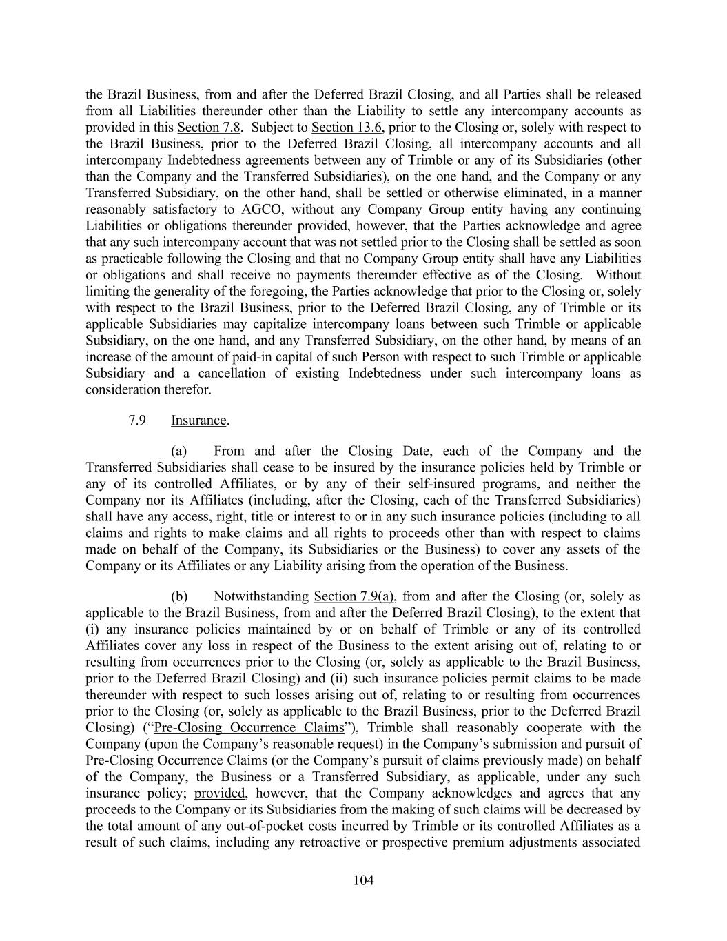 104 the Brazil Business, from and after the Deferred Brazil Closing, and all Parties shall be released from all Liabilities thereunder other than the Liability to settle any intercompany accounts as provided in this Section 7.8. Subject to Section 13.6, prior to the Closing or, solely with respect to the Brazil Business, prior to the Deferred Brazil Closing, all intercompany accounts and all intercompany Indebtedness agreements between any of Trimble or any of its Subsidiaries (other than the Company and the Transferred Subsidiaries), on the one hand, and the Company or any Transferred Subsidiary, on the other hand, shall be settled or otherwise eliminated, in a manner reasonably satisfactory to AGCO, without any Company Group entity having any continuing Liabilities or obligations thereunder provided, however, that the Parties acknowledge and agree that any such intercompany account that was not settled prior to the Closing shall be settled as soon as practicable following the Closing and that no Company Group entity shall have any Liabilities or obligations and shall receive no payments thereunder effective as of the Closing. Without limiting the generality of the foregoing, the Parties acknowledge that prior to the Closing or, solely with respect to the Brazil Business, prior to the Deferred Brazil Closing, any of Trimble or its applicable Subsidiaries may capitalize intercompany loans between such Trimble or applicable Subsidiary, on the one hand, and any Transferred Subsidiary, on the other hand, by means of an increase of the amount of paid-in capital of such Person with respect to such Trimble or applicable Subsidiary and a cancellation of existing Indebtedness under such intercompany loans as consideration therefor. 7.9 Insurance. (a) From and after the Closing Date, each of the Company and the Transferred Subsidiaries shall cease to be insured by the insurance policies held by Trimble or any of its controlled Affiliates, or by any of their self-insured programs, and neither the Company nor its Affiliates (including, after the Closing, each of the Transferred Subsidiaries) shall have any access, right, title or interest to or in any such insurance policies (including to all claims and rights to make claims and all rights to proceeds other than with respect to claims made on behalf of the Company, its Subsidiaries or the Business) to cover any assets of the Company or its Affiliates or any Liability arising from the operation of the Business. (b) Notwithstanding Section 7.9(a), from and after the Closing (or, solely as applicable to the Brazil Business, from and after the Deferred Brazil Closing), to the extent that (i) any insurance policies maintained by or on behalf of Trimble or any of its controlled Affiliates cover any loss in respect of the Business to the extent arising out of, relating to or resulting from occurrences prior to the Closing (or, solely as applicable to the Brazil Business, prior to the Deferred Brazil Closing) and (ii) such insurance policies permit claims to be made thereunder with respect to such losses arising out of, relating to or resulting from occurrences prior to the Closing (or, solely as applicable to the Brazil Business, prior to the Deferred Brazil Closing) (“Pre-Closing Occurrence Claims”), Trimble shall reasonably cooperate with the Company (upon the Company’s reasonable request) in the Company’s submission and pursuit of Pre-Closing Occurrence Claims (or the Company’s pursuit of claims previously made) on behalf of the Company, the Business or a Transferred Subsidiary, as applicable, under any such insurance policy; provided, however, that the Company acknowledges and agrees that any proceeds to the Company or its Subsidiaries from the making of such claims will be decreased by the total amount of any out-of-pocket costs incurred by Trimble or its controlled Affiliates as a result of such claims, including any retroactive or prospective premium adjustments associated
