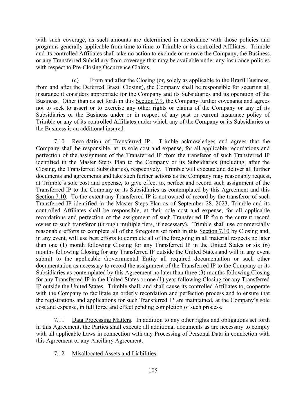 105 with such coverage, as such amounts are determined in accordance with those policies and programs generally applicable from time to time to Trimble or its controlled Affiliates. Trimble and its controlled Affiliates shall take no action to exclude or remove the Company, the Business, or any Transferred Subsidiary from coverage that may be available under any insurance policies with respect to Pre-Closing Occurrence Claims. (c) From and after the Closing (or, solely as applicable to the Brazil Business, from and after the Deferred Brazil Closing), the Company shall be responsible for securing all insurance it considers appropriate for the Company and its Subsidiaries and its operation of the Business. Other than as set forth in this Section 7.9, the Company further covenants and agrees not to seek to assert or to exercise any other rights or claims of the Company or any of its Subsidiaries or the Business under or in respect of any past or current insurance policy of Trimble or any of its controlled Affiliates under which any of the Company or its Subsidiaries or the Business is an additional insured. 7.10 Recordation of Transferred IP. Trimble acknowledges and agrees that the Company shall be responsible, at its sole cost and expense, for all applicable recordations and perfection of the assignment of the Transferred IP from the transferor of such Transferred IP identified in the Master Steps Plan to the Company or its Subsidiaries (including, after the Closing, the Transferred Subsidiaries), respectively. Trimble will execute and deliver all further documents and agreements and take such further actions as the Company may reasonably request, at Trimble’s sole cost and expense, to give effect to, perfect and record such assignment of the Transferred IP to the Company or its Subsidiaries as contemplated by this Agreement and this Section 7.10. To the extent any Transferred IP is not owned of record by the transferor of such Transferred IP identified in the Master Steps Plan as of September 28, 2023, Trimble and its controlled Affiliates shall be responsible, at their sole cost and expense, for all applicable recordations and perfection of the assignment of such Transferred IP from the current record owner to such transferor (through multiple tiers, if necessary). Trimble shall use commercially reasonable efforts to complete all of the foregoing set forth in this Section 7.10 by Closing and, in any event, will use best efforts to complete all of the foregoing in all material respects no later than one (1) month following Closing for any Transferred IP in the United States or six (6) months following Closing for any Transferred IP outside the United States and will in any event submit to the applicable Governmental Entity all required documentation or such other documentation as necessary to record the assignment of the Transferred IP to the Company or its Subsidiaries as contemplated by this Agreement no later than three (3) months following Closing for any Transferred IP in the United States or one (1) year following Closing for any Transferred IP outside the United States. Trimble shall, and shall cause its controlled Affiliates to, cooperate with the Company to facilitate an orderly recordation and perfection process and to ensure that the registrations and applications for such Transferred IP are maintained, at the Company’s sole cost and expense, in full force and effect pending completion of such process. 7.11 Data Processing Matters. In addition to any other rights and obligations set forth in this Agreement, the Parties shall execute all additional documents as are necessary to comply with all applicable Laws in connection with any Processing of Personal Data in connection with this Agreement or any Ancillary Agreement. 7.12 Misallocated Assets and Liabilities.
