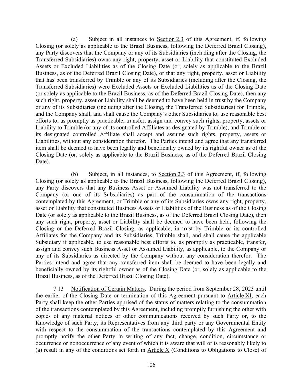 106 (a) Subject in all instances to Section 2.3 of this Agreement, if, following Closing (or solely as applicable to the Brazil Business, following the Deferred Brazil Closing), any Party discovers that the Company or any of its Subsidiaries (including after the Closing, the Transferred Subsidiaries) owns any right, property, asset or Liability that constituted Excluded Assets or Excluded Liabilities as of the Closing Date (or, solely as applicable to the Brazil Business, as of the Deferred Brazil Closing Date), or that any right, property, asset or Liability that has been transferred by Trimble or any of its Subsidiaries (including after the Closing, the Transferred Subsidiaries) were Excluded Assets or Excluded Liabilities as of the Closing Date (or solely as applicable to the Brazil Business, as of the Deferred Brazil Closing Date), then any such right, property, asset or Liability shall be deemed to have been held in trust by the Company or any of its Subsidiaries (including after the Closing, the Transferred Subsidiaries) for Trimble, and the Company shall, and shall cause the Company’s other Subsidiaries to, use reasonable best efforts to, as promptly as practicable, transfer, assign and convey such rights, property, assets or Liability to Trimble (or any of its controlled Affiliates as designated by Trimble), and Trimble or its designated controlled Affiliate shall accept and assume such rights, property, assets or Liabilities, without any consideration therefor. The Parties intend and agree that any transferred item shall be deemed to have been legally and beneficially owned by its rightful owner as of the Closing Date (or, solely as applicable to the Brazil Business, as of the Deferred Brazil Closing Date). (b) Subject, in all instances, to Section 2.3 of this Agreement, if, following Closing (or solely as applicable to the Brazil Business, following the Deferred Brazil Closing), any Party discovers that any Business Asset or Assumed Liability was not transferred to the Company (or one of its Subsidiaries) as part of the consummation of the transactions contemplated by this Agreement, or Trimble or any of its Subsidiaries owns any right, property, asset or Liability that constituted Business Assets or Liabilities of the Business as of the Closing Date (or solely as applicable to the Brazil Business, as of the Deferred Brazil Closing Date), then any such right, property, asset or Liability shall be deemed to have been held, following the Closing or the Deferred Brazil Closing, as applicable, in trust by Trimble or its controlled Affiliates for the Company and its Subsidiaries, Trimble shall, and shall cause the applicable Subsidiary if applicable, to use reasonable best efforts to, as promptly as practicable, transfer, assign and convey such Business Asset or Assumed Liability, as applicable, to the Company or any of its Subsidiaries as directed by the Company without any consideration therefor. The Parties intend and agree that any transferred item shall be deemed to have been legally and beneficially owned by its rightful owner as of the Closing Date (or, solely as applicable to the Brazil Business, as of the Deferred Brazil Closing Date). 7.13 Notification of Certain Matters. During the period from September 28, 2023 until the earlier of the Closing Date or termination of this Agreement pursuant to Article XI, each Party shall keep the other Parties apprised of the status of matters relating to the consummation of the transactions contemplated by this Agreement, including promptly furnishing the other with copies of any material notices or other communications received by such Party or, to the Knowledge of such Party, its Representatives from any third party or any Governmental Entity with respect to the consummation of the transactions contemplated by this Agreement and promptly notify the other Party in writing of any fact, change, condition, circumstance or occurrence or nonoccurrence of any event of which it is aware that will or is reasonably likely to (a) result in any of the conditions set forth in Article X (Conditions to Obligations to Close) of