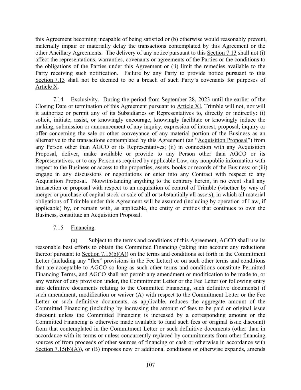 107 this Agreement becoming incapable of being satisfied or (b) otherwise would reasonably prevent, materially impair or materially delay the transactions contemplated by this Agreement or the other Ancillary Agreements. The delivery of any notice pursuant to this Section 7.13 shall not (i) affect the representations, warranties, covenants or agreements of the Parties or the conditions to the obligations of the Parties under this Agreement or (ii) limit the remedies available to the Party receiving such notification. Failure by any Party to provide notice pursuant to this Section 7.13 shall not be deemed to be a breach of such Party’s covenants for purposes of Article X. 7.14 Exclusivity. During the period from September 28, 2023 until the earlier of the Closing Date or termination of this Agreement pursuant to Article XI, Trimble will not, nor will it authorize or permit any of its Subsidiaries or Representatives to, directly or indirectly: (i) solicit, initiate, assist, or knowingly encourage, knowingly facilitate or knowingly induce the making, submission or announcement of any inquiry, expression of interest, proposal, inquiry or offer concerning the sale or other conveyance of any material portion of the Business as an alternative to the transactions contemplated by this Agreement (an “Acquisition Proposal”) from any Person other than AGCO or its Representatives; (ii) in connection with any Acquisition Proposal, deliver, make available or provide to any Person other than AGCO or its Representatives, or to any Person as required by applicable Law, any nonpublic information with respect to the Business or access to the properties, assets, books or records of the Business; or (iii) engage in any discussions or negotiations or enter into any Contract with respect to any Acquisition Proposal. Notwithstanding anything to the contrary herein, in no event shall any transaction or proposal with respect to an acquisition of control of Trimble (whether by way of merger or purchase of capital stock or sale of all or substantially all assets), in which all material obligations of Trimble under this Agreement will be assumed (including by operation of Law, if applicable) by, or remain with, as applicable, the entity or entities that continues to own the Business, constitute an Acquisition Proposal. 7.15 Financing. (a) Subject to the terms and conditions of this Agreement, AGCO shall use its reasonable best efforts to obtain the Committed Financing (taking into account any reductions thereof pursuant to Section 7.15(b)(A)) on the terms and conditions set forth in the Commitment Letter (including any “flex” provisions in the Fee Letter) or on such other terms and conditions that are acceptable to AGCO so long as such other terms and conditions constitute Permitted Financing Terms, and AGCO shall not permit any amendment or modification to be made to, or any waiver of any provision under, the Commitment Letter or the Fee Letter (or following entry into definitive documents relating to the Committed Financing, such definitive documents) if such amendment, modification or waiver (A) with respect to the Commitment Letter or the Fee Letter or such definitive documents, as applicable, reduces the aggregate amount of the Committed Financing (including by increasing the amount of fees to be paid or original issue discount unless the Committed Financing is increased by a corresponding amount or the Committed Financing is otherwise made available to fund such fees or original issue discount) from that contemplated in the Commitment Letter or such definitive documents (other than in accordance with its terms or unless concurrently replaced by commitments from other financing sources of from proceeds of other sources of financing or cash or otherwise in accordance with Section 7.15(b)(A)), or (B) imposes new or additional conditions or otherwise expands, amends