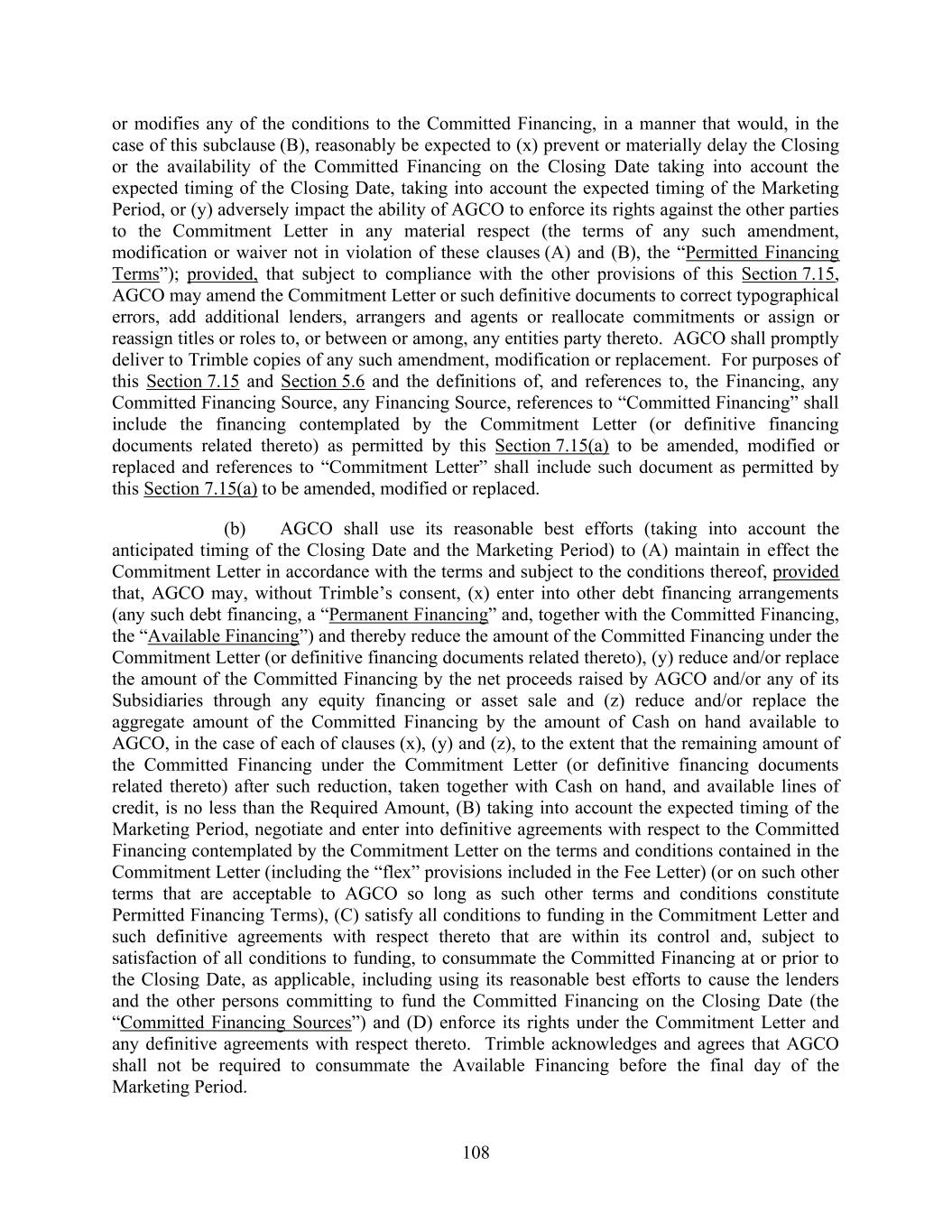 108 or modifies any of the conditions to the Committed Financing, in a manner that would, in the case of this subclause (B), reasonably be expected to (x) prevent or materially delay the Closing or the availability of the Committed Financing on the Closing Date taking into account the expected timing of the Closing Date, taking into account the expected timing of the Marketing Period, or (y) adversely impact the ability of AGCO to enforce its rights against the other parties to the Commitment Letter in any material respect (the terms of any such amendment, modification or waiver not in violation of these clauses (A) and (B), the “Permitted Financing Terms”); provided, that subject to compliance with the other provisions of this Section 7.15, AGCO may amend the Commitment Letter or such definitive documents to correct typographical errors, add additional lenders, arrangers and agents or reallocate commitments or assign or reassign titles or roles to, or between or among, any entities party thereto. AGCO shall promptly deliver to Trimble copies of any such amendment, modification or replacement. For purposes of this Section 7.15 and Section 5.6 and the definitions of, and references to, the Financing, any Committed Financing Source, any Financing Source, references to “Committed Financing” shall include the financing contemplated by the Commitment Letter (or definitive financing documents related thereto) as permitted by this Section 7.15(a) to be amended, modified or replaced and references to “Commitment Letter” shall include such document as permitted by this Section 7.15(a) to be amended, modified or replaced. (b) AGCO shall use its reasonable best efforts (taking into account the anticipated timing of the Closing Date and the Marketing Period) to (A) maintain in effect the Commitment Letter in accordance with the terms and subject to the conditions thereof, provided that, AGCO may, without Trimble’s consent, (x) enter into other debt financing arrangements (any such debt financing, a “Permanent Financing” and, together with the Committed Financing, the “Available Financing”) and thereby reduce the amount of the Committed Financing under the Commitment Letter (or definitive financing documents related thereto), (y) reduce and/or replace the amount of the Committed Financing by the net proceeds raised by AGCO and/or any of its Subsidiaries through any equity financing or asset sale and (z) reduce and/or replace the aggregate amount of the Committed Financing by the amount of Cash on hand available to AGCO, in the case of each of clauses (x), (y) and (z), to the extent that the remaining amount of the Committed Financing under the Commitment Letter (or definitive financing documents related thereto) after such reduction, taken together with Cash on hand, and available lines of credit, is no less than the Required Amount, (B) taking into account the expected timing of the Marketing Period, negotiate and enter into definitive agreements with respect to the Committed Financing contemplated by the Commitment Letter on the terms and conditions contained in the Commitment Letter (including the “flex” provisions included in the Fee Letter) (or on such other terms that are acceptable to AGCO so long as such other terms and conditions constitute Permitted Financing Terms), (C) satisfy all conditions to funding in the Commitment Letter and such definitive agreements with respect thereto that are within its control and, subject to satisfaction of all conditions to funding, to consummate the Committed Financing at or prior to the Closing Date, as applicable, including using its reasonable best efforts to cause the lenders and the other persons committing to fund the Committed Financing on the Closing Date (the “Committed Financing Sources”) and (D) enforce its rights under the Commitment Letter and any definitive agreements with respect thereto. Trimble acknowledges and agrees that AGCO shall not be required to consummate the Available Financing before the final day of the Marketing Period.