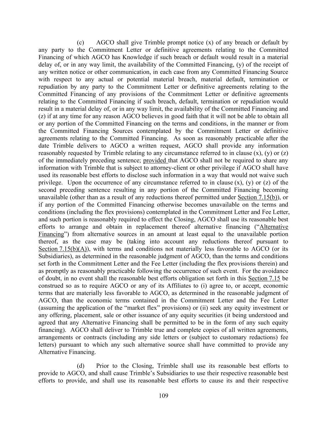 109 (c) AGCO shall give Trimble prompt notice (x) of any breach or default by any party to the Commitment Letter or definitive agreements relating to the Committed Financing of which AGCO has Knowledge if such breach or default would result in a material delay of, or in any way limit, the availability of the Committed Financing, (y) of the receipt of any written notice or other communication, in each case from any Committed Financing Source with respect to any actual or potential material breach, material default, termination or repudiation by any party to the Commitment Letter or definitive agreements relating to the Committed Financing of any provisions of the Commitment Letter or definitive agreements relating to the Committed Financing if such breach, default, termination or repudiation would result in a material delay of, or in any way limit, the availability of the Committed Financing and (z) if at any time for any reason AGCO believes in good faith that it will not be able to obtain all or any portion of the Committed Financing on the terms and conditions, in the manner or from the Committed Financing Sources contemplated by the Commitment Letter or definitive agreements relating to the Committed Financing. As soon as reasonably practicable after the date Trimble delivers to AGCO a written request, AGCO shall provide any information reasonably requested by Trimble relating to any circumstance referred to in clause (x), (y) or (z) of the immediately preceding sentence; provided that AGCO shall not be required to share any information with Trimble that is subject to attorney-client or other privilege if AGCO shall have used its reasonable best efforts to disclose such information in a way that would not waive such privilege. Upon the occurrence of any circumstance referred to in clause (x), (y) or (z) of the second preceding sentence resulting in any portion of the Committed Financing becoming unavailable (other than as a result of any reductions thereof permitted under Section 7.15(b)), or if any portion of the Committed Financing otherwise becomes unavailable on the terms and conditions (including the flex provisions) contemplated in the Commitment Letter and Fee Letter, and such portion is reasonably required to effect the Closing, AGCO shall use its reasonable best efforts to arrange and obtain in replacement thereof alternative financing (“Alternative Financing”) from alternative sources in an amount at least equal to the unavailable portion thereof, as the case may be (taking into account any reductions thereof pursuant to Section 7.15(b)(A)), with terms and conditions not materially less favorable to AGCO (or its Subsidiaries), as determined in the reasonable judgment of AGCO, than the terms and conditions set forth in the Commitment Letter and the Fee Letter (including the flex provisions therein) and as promptly as reasonably practicable following the occurrence of such event. For the avoidance of doubt, in no event shall the reasonable best efforts obligation set forth in this Section 7.15 be construed so as to require AGCO or any of its Affiliates to (i) agree to, or accept, economic terms that are materially less favorable to AGCO, as determined in the reasonable judgment of AGCO, than the economic terms contained in the Commitment Letter and the Fee Letter (assuming the application of the “market flex” provisions) or (ii) seek any equity investment or any offering, placement, sale or other issuance of any equity securities (it being understood and agreed that any Alternative Financing shall be permitted to be in the form of any such equity financing). AGCO shall deliver to Trimble true and complete copies of all written agreements, arrangements or contracts (including any side letters or (subject to customary redactions) fee letters) pursuant to which any such alternative source shall have committed to provide any Alternative Financing. (d) Prior to the Closing, Trimble shall use its reasonable best efforts to provide to AGCO, and shall cause Trimble’s Subsidiaries to use their respective reasonable best efforts to provide, and shall use its reasonable best efforts to cause its and their respective