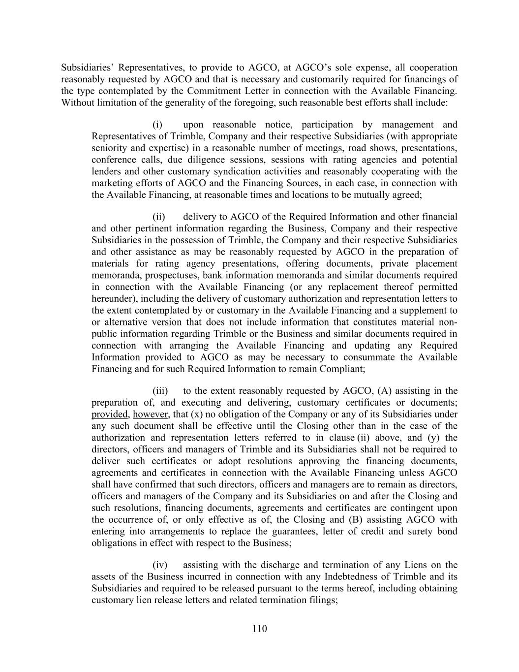 110 Subsidiaries’ Representatives, to provide to AGCO, at AGCO’s sole expense, all cooperation reasonably requested by AGCO and that is necessary and customarily required for financings of the type contemplated by the Commitment Letter in connection with the Available Financing. Without limitation of the generality of the foregoing, such reasonable best efforts shall include: (i) upon reasonable notice, participation by management and Representatives of Trimble, Company and their respective Subsidiaries (with appropriate seniority and expertise) in a reasonable number of meetings, road shows, presentations, conference calls, due diligence sessions, sessions with rating agencies and potential lenders and other customary syndication activities and reasonably cooperating with the marketing efforts of AGCO and the Financing Sources, in each case, in connection with the Available Financing, at reasonable times and locations to be mutually agreed; (ii) delivery to AGCO of the Required Information and other financial and other pertinent information regarding the Business, Company and their respective Subsidiaries in the possession of Trimble, the Company and their respective Subsidiaries and other assistance as may be reasonably requested by AGCO in the preparation of materials for rating agency presentations, offering documents, private placement memoranda, prospectuses, bank information memoranda and similar documents required in connection with the Available Financing (or any replacement thereof permitted hereunder), including the delivery of customary authorization and representation letters to the extent contemplated by or customary in the Available Financing and a supplement to or alternative version that does not include information that constitutes material non- public information regarding Trimble or the Business and similar documents required in connection with arranging the Available Financing and updating any Required Information provided to AGCO as may be necessary to consummate the Available Financing and for such Required Information to remain Compliant; (iii) to the extent reasonably requested by AGCO, (A) assisting in the preparation of, and executing and delivering, customary certificates or documents; provided, however, that (x) no obligation of the Company or any of its Subsidiaries under any such document shall be effective until the Closing other than in the case of the authorization and representation letters referred to in clause (ii) above, and (y) the directors, officers and managers of Trimble and its Subsidiaries shall not be required to deliver such certificates or adopt resolutions approving the financing documents, agreements and certificates in connection with the Available Financing unless AGCO shall have confirmed that such directors, officers and managers are to remain as directors, officers and managers of the Company and its Subsidiaries on and after the Closing and such resolutions, financing documents, agreements and certificates are contingent upon the occurrence of, or only effective as of, the Closing and (B) assisting AGCO with entering into arrangements to replace the guarantees, letter of credit and surety bond obligations in effect with respect to the Business; (iv) assisting with the discharge and termination of any Liens on the assets of the Business incurred in connection with any Indebtedness of Trimble and its Subsidiaries and required to be released pursuant to the terms hereof, including obtaining customary lien release letters and related termination filings;