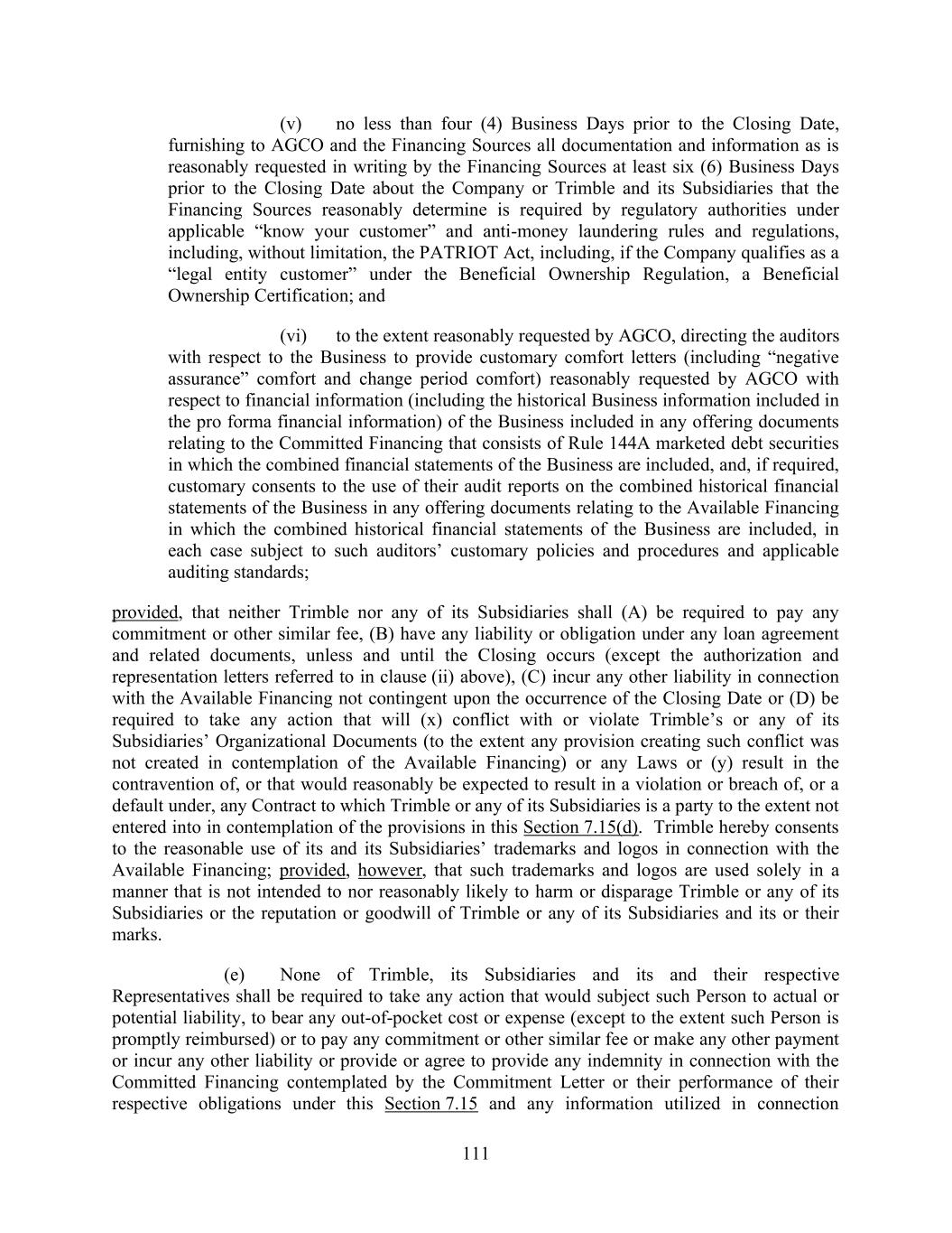 111 (v) no less than four (4) Business Days prior to the Closing Date, furnishing to AGCO and the Financing Sources all documentation and information as is reasonably requested in writing by the Financing Sources at least six (6) Business Days prior to the Closing Date about the Company or Trimble and its Subsidiaries that the Financing Sources reasonably determine is required by regulatory authorities under applicable “know your customer” and anti-money laundering rules and regulations, including, without limitation, the PATRIOT Act, including, if the Company qualifies as a “legal entity customer” under the Beneficial Ownership Regulation, a Beneficial Ownership Certification; and (vi) to the extent reasonably requested by AGCO, directing the auditors with respect to the Business to provide customary comfort letters (including “negative assurance” comfort and change period comfort) reasonably requested by AGCO with respect to financial information (including the historical Business information included in the pro forma financial information) of the Business included in any offering documents relating to the Committed Financing that consists of Rule 144A marketed debt securities in which the combined financial statements of the Business are included, and, if required, customary consents to the use of their audit reports on the combined historical financial statements of the Business in any offering documents relating to the Available Financing in which the combined historical financial statements of the Business are included, in each case subject to such auditors’ customary policies and procedures and applicable auditing standards; provided, that neither Trimble nor any of its Subsidiaries shall (A) be required to pay any commitment or other similar fee, (B) have any liability or obligation under any loan agreement and related documents, unless and until the Closing occurs (except the authorization and representation letters referred to in clause (ii) above), (C) incur any other liability in connection with the Available Financing not contingent upon the occurrence of the Closing Date or (D) be required to take any action that will (x) conflict with or violate Trimble’s or any of its Subsidiaries’ Organizational Documents (to the extent any provision creating such conflict was not created in contemplation of the Available Financing) or any Laws or (y) result in the contravention of, or that would reasonably be expected to result in a violation or breach of, or a default under, any Contract to which Trimble or any of its Subsidiaries is a party to the extent not entered into in contemplation of the provisions in this Section 7.15(d). Trimble hereby consents to the reasonable use of its and its Subsidiaries’ trademarks and logos in connection with the Available Financing; provided, however, that such trademarks and logos are used solely in a manner that is not intended to nor reasonably likely to harm or disparage Trimble or any of its Subsidiaries or the reputation or goodwill of Trimble or any of its Subsidiaries and its or their marks. (e) None of Trimble, its Subsidiaries and its and their respective Representatives shall be required to take any action that would subject such Person to actual or potential liability, to bear any out-of-pocket cost or expense (except to the extent such Person is promptly reimbursed) or to pay any commitment or other similar fee or make any other payment or incur any other liability or provide or agree to provide any indemnity in connection with the Committed Financing contemplated by the Commitment Letter or their performance of their respective obligations under this Section 7.15 and any information utilized in connection