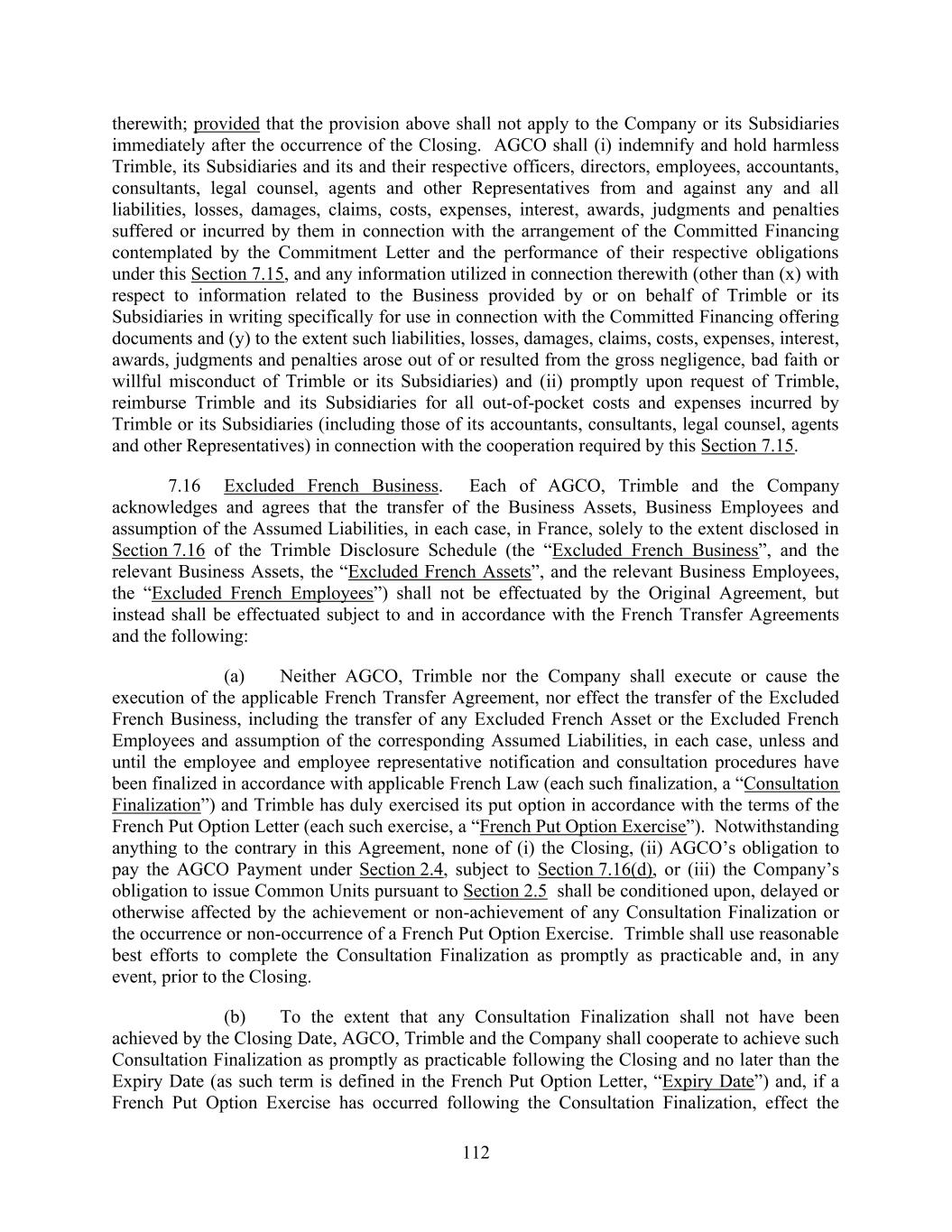 112 therewith; provided that the provision above shall not apply to the Company or its Subsidiaries immediately after the occurrence of the Closing. AGCO shall (i) indemnify and hold harmless Trimble, its Subsidiaries and its and their respective officers, directors, employees, accountants, consultants, legal counsel, agents and other Representatives from and against any and all liabilities, losses, damages, claims, costs, expenses, interest, awards, judgments and penalties suffered or incurred by them in connection with the arrangement of the Committed Financing contemplated by the Commitment Letter and the performance of their respective obligations under this Section 7.15, and any information utilized in connection therewith (other than (x) with respect to information related to the Business provided by or on behalf of Trimble or its Subsidiaries in writing specifically for use in connection with the Committed Financing offering documents and (y) to the extent such liabilities, losses, damages, claims, costs, expenses, interest, awards, judgments and penalties arose out of or resulted from the gross negligence, bad faith or willful misconduct of Trimble or its Subsidiaries) and (ii) promptly upon request of Trimble, reimburse Trimble and its Subsidiaries for all out-of-pocket costs and expenses incurred by Trimble or its Subsidiaries (including those of its accountants, consultants, legal counsel, agents and other Representatives) in connection with the cooperation required by this Section 7.15. 7.16 Excluded French Business. Each of AGCO, Trimble and the Company acknowledges and agrees that the transfer of the Business Assets, Business Employees and assumption of the Assumed Liabilities, in each case, in France, solely to the extent disclosed in Section 7.16 of the Trimble Disclosure Schedule (the “Excluded French Business”, and the relevant Business Assets, the “Excluded French Assets”, and the relevant Business Employees, the “Excluded French Employees”) shall not be effectuated by the Original Agreement, but instead shall be effectuated subject to and in accordance with the French Transfer Agreements and the following: (a) Neither AGCO, Trimble nor the Company shall execute or cause the execution of the applicable French Transfer Agreement, nor effect the transfer of the Excluded French Business, including the transfer of any Excluded French Asset or the Excluded French Employees and assumption of the corresponding Assumed Liabilities, in each case, unless and until the employee and employee representative notification and consultation procedures have been finalized in accordance with applicable French Law (each such finalization, a “Consultation Finalization”) and Trimble has duly exercised its put option in accordance with the terms of the French Put Option Letter (each such exercise, a “French Put Option Exercise”). Notwithstanding anything to the contrary in this Agreement, none of (i) the Closing, (ii) AGCO’s obligation to pay the AGCO Payment under Section 2.4, subject to Section 7.16(d), or (iii) the Company’s obligation to issue Common Units pursuant to Section 2.5 shall be conditioned upon, delayed or otherwise affected by the achievement or non-achievement of any Consultation Finalization or the occurrence or non-occurrence of a French Put Option Exercise. Trimble shall use reasonable best efforts to complete the Consultation Finalization as promptly as practicable and, in any event, prior to the Closing. (b) To the extent that any Consultation Finalization shall not have been achieved by the Closing Date, AGCO, Trimble and the Company shall cooperate to achieve such Consultation Finalization as promptly as practicable following the Closing and no later than the Expiry Date (as such term is defined in the French Put Option Letter, “Expiry Date”) and, if a French Put Option Exercise has occurred following the Consultation Finalization, effect the