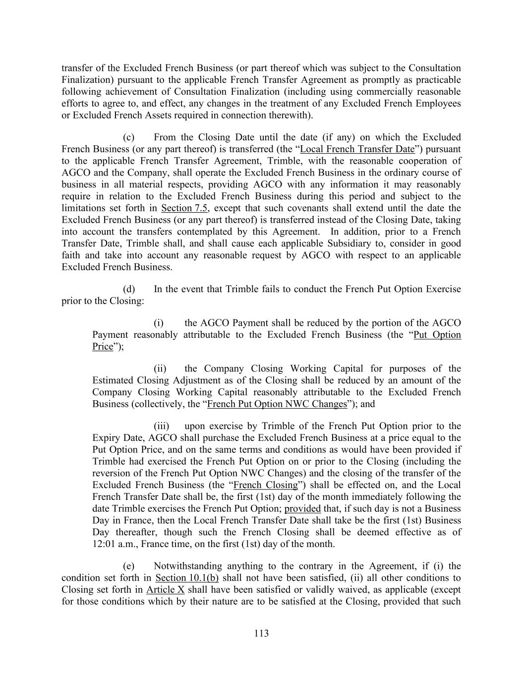 113 transfer of the Excluded French Business (or part thereof which was subject to the Consultation Finalization) pursuant to the applicable French Transfer Agreement as promptly as practicable following achievement of Consultation Finalization (including using commercially reasonable efforts to agree to, and effect, any changes in the treatment of any Excluded French Employees or Excluded French Assets required in connection therewith). (c) From the Closing Date until the date (if any) on which the Excluded French Business (or any part thereof) is transferred (the “Local French Transfer Date”) pursuant to the applicable French Transfer Agreement, Trimble, with the reasonable cooperation of AGCO and the Company, shall operate the Excluded French Business in the ordinary course of business in all material respects, providing AGCO with any information it may reasonably require in relation to the Excluded French Business during this period and subject to the limitations set forth in Section 7.5, except that such covenants shall extend until the date the Excluded French Business (or any part thereof) is transferred instead of the Closing Date, taking into account the transfers contemplated by this Agreement. In addition, prior to a French Transfer Date, Trimble shall, and shall cause each applicable Subsidiary to, consider in good faith and take into account any reasonable request by AGCO with respect to an applicable Excluded French Business. (d) In the event that Trimble fails to conduct the French Put Option Exercise prior to the Closing: (i) the AGCO Payment shall be reduced by the portion of the AGCO Payment reasonably attributable to the Excluded French Business (the “Put Option Price”); (ii) the Company Closing Working Capital for purposes of the Estimated Closing Adjustment as of the Closing shall be reduced by an amount of the Company Closing Working Capital reasonably attributable to the Excluded French Business (collectively, the “French Put Option NWC Changes”); and (iii) upon exercise by Trimble of the French Put Option prior to the Expiry Date, AGCO shall purchase the Excluded French Business at a price equal to the Put Option Price, and on the same terms and conditions as would have been provided if Trimble had exercised the French Put Option on or prior to the Closing (including the reversion of the French Put Option NWC Changes) and the closing of the transfer of the Excluded French Business (the “French Closing”) shall be effected on, and the Local French Transfer Date shall be, the first (1st) day of the month immediately following the date Trimble exercises the French Put Option; provided that, if such day is not a Business Day in France, then the Local French Transfer Date shall take be the first (1st) Business Day thereafter, though such the French Closing shall be deemed effective as of 12:01 a.m., France time, on the first (1st) day of the month. (e) Notwithstanding anything to the contrary in the Agreement, if (i) the condition set forth in Section 10.1(b) shall not have been satisfied, (ii) all other conditions to Closing set forth in Article X shall have been satisfied or validly waived, as applicable (except for those conditions which by their nature are to be satisfied at the Closing, provided that such