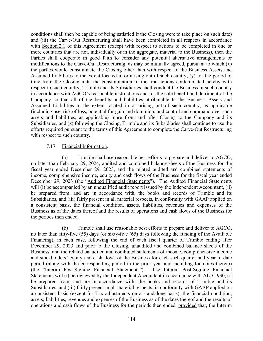 114 conditions shall then be capable of being satisfied if the Closing were to take place on such date) and (iii) the Carve-Out Restructuring shall have been completed in all respects in accordance with Section 2.1 of this Agreement (except with respect to actions to be completed in one or more countries that are not, individually or in the aggregate, material to the Business), then the Parties shall cooperate in good faith to consider any potential alternative arrangements or modifications to the Carve-Out Restructuring, as may be mutually agreed, pursuant to which (x) the parties would consummate the Closing other than with respect to the Business Assets and Assumed Liabilities to the extent located in or arising out of such country, (y) for the period of time from the Closing until the consummation of the transactions contemplated hereby with respect to such country, Trimble and its Subsidiaries shall conduct the Business in such country in accordance with AGCO’s reasonable instructions and for the sole benefit and detriment of the Company so that all of the benefits and liabilities attributable to the Business Assets and Assumed Liabilities to the extent located in or arising out of such country, as applicable (including use, risk of loss, potential for gain and dominion, and control and command over such assets and liabilities, as applicable) inure from and after Closing to the Company and its Subsidiaries, and (z) following the Closing, Trimble and its Subsidiaries shall continue to use the efforts required pursuant to the terms of this Agreement to complete the Carve-Out Restructuring with respect to such country. 7.17 Financial Information. (a) Trimble shall use reasonable best efforts to prepare and deliver to AGCO, no later than February 29, 2024, audited and combined balance sheets of the Business for the fiscal year ended December 29, 2023, and the related audited and combined statements of income, comprehensive income, equity and cash flows of the Business for the fiscal year ended December 29, 2023 (the “Audited Financial Statements”). The Audited Financial Statements will (i) be accompanied by an unqualified audit report issued by the Independent Accountant, (ii) be prepared from, and are in accordance with, the books and records of Trimble and its Subsidiaries, and (iii) fairly present in all material respects, in conformity with GAAP applied on a consistent basis, the financial condition, assets, liabilities, revenues and expenses of the Business as of the dates thereof and the results of operations and cash flows of the Business for the periods then ended. (b) Trimble shall use reasonable best efforts to prepare and deliver to AGCO, no later than fifty-five (55) days (or sixty-five (65) days following the funding of the Available Financing), in each case, following the end of each fiscal quarter of Trimble ending after December 29, 2023 and prior to the Closing, unaudited and combined balance sheets of the Business, and the related unaudited and combined statements of income, comprehensive income and stockholders’ equity and cash flows of the Business for each such quarter and year-to-date period (along with the corresponding period in the prior year and including footnotes thereto) (the “Interim Post-Signing Financial Statements”). The Interim Post-Signing Financial Statements will (i) be reviewed by the Independent Accountant in accordance with AU-C 930, (ii) be prepared from, and are in accordance with, the books and records of Trimble and its Subsidiaries, and (iii) fairly present in all material respects, in conformity with GAAP applied on a consistent basis (except for Tax adjustments on a standalone basis), the financial condition, assets, liabilities, revenues and expenses of the Business as of the dates thereof and the results of operations and cash flows of the Business for the periods then ended; provided that, the Interim