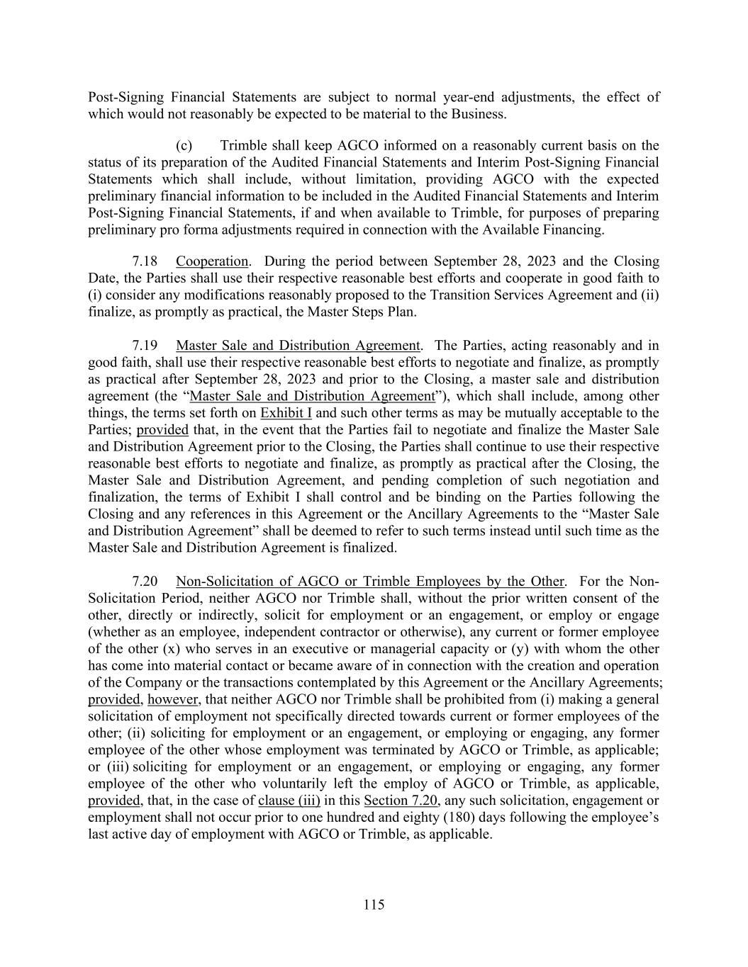 115 Post-Signing Financial Statements are subject to normal year-end adjustments, the effect of which would not reasonably be expected to be material to the Business. (c) Trimble shall keep AGCO informed on a reasonably current basis on the status of its preparation of the Audited Financial Statements and Interim Post-Signing Financial Statements which shall include, without limitation, providing AGCO with the expected preliminary financial information to be included in the Audited Financial Statements and Interim Post-Signing Financial Statements, if and when available to Trimble, for purposes of preparing preliminary pro forma adjustments required in connection with the Available Financing. 7.18 Cooperation. During the period between September 28, 2023 and the Closing Date, the Parties shall use their respective reasonable best efforts and cooperate in good faith to (i) consider any modifications reasonably proposed to the Transition Services Agreement and (ii) finalize, as promptly as practical, the Master Steps Plan. 7.19 Master Sale and Distribution Agreement. The Parties, acting reasonably and in good faith, shall use their respective reasonable best efforts to negotiate and finalize, as promptly as practical after September 28, 2023 and prior to the Closing, a master sale and distribution agreement (the “Master Sale and Distribution Agreement”), which shall include, among other things, the terms set forth on Exhibit I and such other terms as may be mutually acceptable to the Parties; provided that, in the event that the Parties fail to negotiate and finalize the Master Sale and Distribution Agreement prior to the Closing, the Parties shall continue to use their respective reasonable best efforts to negotiate and finalize, as promptly as practical after the Closing, the Master Sale and Distribution Agreement, and pending completion of such negotiation and finalization, the terms of Exhibit I shall control and be binding on the Parties following the Closing and any references in this Agreement or the Ancillary Agreements to the “Master Sale and Distribution Agreement” shall be deemed to refer to such terms instead until such time as the Master Sale and Distribution Agreement is finalized. 7.20 Non-Solicitation of AGCO or Trimble Employees by the Other. For the Non- Solicitation Period, neither AGCO nor Trimble shall, without the prior written consent of the other, directly or indirectly, solicit for employment or an engagement, or employ or engage (whether as an employee, independent contractor or otherwise), any current or former employee of the other (x) who serves in an executive or managerial capacity or (y) with whom the other has come into material contact or became aware of in connection with the creation and operation of the Company or the transactions contemplated by this Agreement or the Ancillary Agreements; provided, however, that neither AGCO nor Trimble shall be prohibited from (i) making a general solicitation of employment not specifically directed towards current or former employees of the other; (ii) soliciting for employment or an engagement, or employing or engaging, any former employee of the other whose employment was terminated by AGCO or Trimble, as applicable; or (iii) soliciting for employment or an engagement, or employing or engaging, any former employee of the other who voluntarily left the employ of AGCO or Trimble, as applicable, provided, that, in the case of clause (iii) in this Section 7.20, any such solicitation, engagement or employment shall not occur prior to one hundred and eighty (180) days following the employee’s last active day of employment with AGCO or Trimble, as applicable.