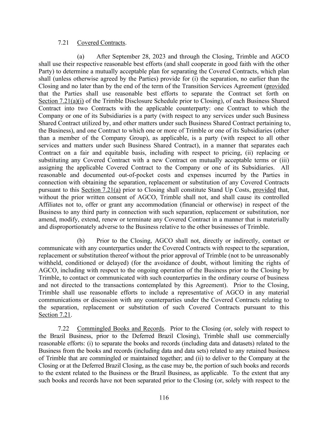 116 7.21 Covered Contracts. (a) After September 28, 2023 and through the Closing, Trimble and AGCO shall use their respective reasonable best efforts (and shall cooperate in good faith with the other Party) to determine a mutually acceptable plan for separating the Covered Contracts, which plan shall (unless otherwise agreed by the Parties) provide for (i) the separation, no earlier than the Closing and no later than by the end of the term of the Transition Services Agreement (provided that the Parties shall use reasonable best efforts to separate the Contract set forth on Section 7.21(a)(i) of the Trimble Disclosure Schedule prior to Closing), of each Business Shared Contract into two Contracts with the applicable counterparty: one Contract to which the Company or one of its Subsidiaries is a party (with respect to any services under such Business Shared Contract utilized by, and other matters under such Business Shared Contract pertaining to, the Business), and one Contract to which one or more of Trimble or one of its Subsidiaries (other than a member of the Company Group), as applicable, is a party (with respect to all other services and matters under such Business Shared Contract), in a manner that separates each Contract on a fair and equitable basis, including with respect to pricing, (ii) replacing or substituting any Covered Contract with a new Contract on mutually acceptable terms or (iii) assigning the applicable Covered Contract to the Company or one of its Subsidiaries. All reasonable and documented out-of-pocket costs and expenses incurred by the Parties in connection with obtaining the separation, replacement or substitution of any Covered Contracts pursuant to this Section 7.21(a) prior to Closing shall constitute Stand Up Costs, provided that, without the prior written consent of AGCO, Trimble shall not, and shall cause its controlled Affiliates not to, offer or grant any accommodation (financial or otherwise) in respect of the Business to any third party in connection with such separation, replacement or substitution, nor amend, modify, extend, renew or terminate any Covered Contract in a manner that is materially and disproportionately adverse to the Business relative to the other businesses of Trimble. (b) Prior to the Closing, AGCO shall not, directly or indirectly, contact or communicate with any counterparties under the Covered Contracts with respect to the separation, replacement or substitution thereof without the prior approval of Trimble (not to be unreasonably withheld, conditioned or delayed) (for the avoidance of doubt, without limiting the rights of AGCO, including with respect to the ongoing operation of the Business prior to the Closing by Trimble, to contact or communicated with such counterparties in the ordinary course of business and not directed to the transactions contemplated by this Agreement). Prior to the Closing, Trimble shall use reasonable efforts to include a representative of AGCO in any material communications or discussion with any counterparties under the Covered Contracts relating to the separation, replacement or substitution of such Covered Contracts pursuant to this Section 7.21. 7.22 Commingled Books and Records. Prior to the Closing (or, solely with respect to the Brazil Business, prior to the Deferred Brazil Closing), Trimble shall use commercially reasonable efforts: (i) to separate the books and records (including data and datasets) related to the Business from the books and records (including data and data sets) related to any retained business of Trimble that are commingled or maintained together; and (ii) to deliver to the Company at the Closing or at the Deferred Brazil Closing, as the case may be, the portion of such books and records to the extent related to the Business or the Brazil Business, as applicable. To the extent that any such books and records have not been separated prior to the Closing (or, solely with respect to the