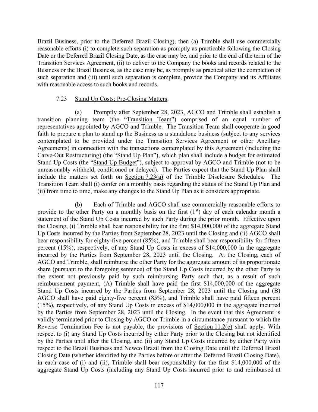 117 Brazil Business, prior to the Deferred Brazil Closing), then (a) Trimble shall use commercially reasonable efforts (i) to complete such separation as promptly as practicable following the Closing Date or the Deferred Brazil Closing Date, as the case may be, and prior to the end of the term of the Transition Services Agreement, (ii) to deliver to the Company the books and records related to the Business or the Brazil Business, as the case may be, as promptly as practical after the completion of such separation and (iii) until such separation is complete, provide the Company and its Affiliates with reasonable access to such books and records. 7.23 Stand Up Costs; Pre-Closing Matters. (a) Promptly after September 28, 2023, AGCO and Trimble shall establish a transition planning team (the “Transition Team”) comprised of an equal number of representatives appointed by AGCO and Trimble. The Transition Team shall cooperate in good faith to prepare a plan to stand up the Business as a standalone business (subject to any services contemplated to be provided under the Transition Services Agreement or other Ancillary Agreements) in connection with the transactions contemplated by this Agreement (including the Carve-Out Restructuring) (the “Stand Up Plan”), which plan shall include a budget for estimated Stand Up Costs (the “Stand Up Budget”), subject to approval by AGCO and Trimble (not to be unreasonably withheld, conditioned or delayed). The Parties expect that the Stand Up Plan shall include the matters set forth on Section 7.23(a) of the Trimble Disclosure Schedules. The Transition Team shall (i) confer on a monthly basis regarding the status of the Stand Up Plan and (ii) from time to time, make any changes to the Stand Up Plan as it considers appropriate. (b) Each of Trimble and AGCO shall use commercially reasonable efforts to provide to the other Party on a monthly basis on the first (1st) day of each calendar month a statement of the Stand Up Costs incurred by such Party during the prior month. Effective upon the Closing, (i) Trimble shall bear responsibility for the first $14,000,000 of the aggregate Stand Up Costs incurred by the Parties from September 28, 2023 until the Closing and (ii) AGCO shall bear responsibility for eighty-five percent (85%), and Trimble shall bear responsibility for fifteen percent (15%), respectively, of any Stand Up Costs in excess of $14,000,000 in the aggregate incurred by the Parties from September 28, 2023 until the Closing. At the Closing, each of AGCO and Trimble, shall reimburse the other Party for the aggregate amount of its proportionate share (pursuant to the foregoing sentence) of the Stand Up Costs incurred by the other Party to the extent not previously paid by such reimbursing Party such that, as a result of such reimbursement payment, (A) Trimble shall have paid the first $14,000,000 of the aggregate Stand Up Costs incurred by the Parties from September 28, 2023 until the Closing and (B) AGCO shall have paid eighty-five percent (85%), and Trimble shall have paid fifteen percent (15%), respectively, of any Stand Up Costs in excess of $14,000,000 in the aggregate incurred by the Parties from September 28, 2023 until the Closing. In the event that this Agreement is validly terminated prior to Closing by AGCO or Trimble in a circumstance pursuant to which the Reverse Termination Fee is not payable, the provisions of Section 11.2(e) shall apply. With respect to (i) any Stand Up Costs incurred by either Party prior to the Closing but not identified by the Parties until after the Closing, and (ii) any Stand Up Costs incurred by either Party with respect to the Brazil Business and Newco Brazil from the Closing Date until the Deferred Brazil Closing Date (whether identified by the Parties before or after the Deferred Brazil Closing Date), in each case of (i) and (ii), Trimble shall bear responsibility for the first $14,000,000 of the aggregate Stand Up Costs (including any Stand Up Costs incurred prior to and reimbursed at