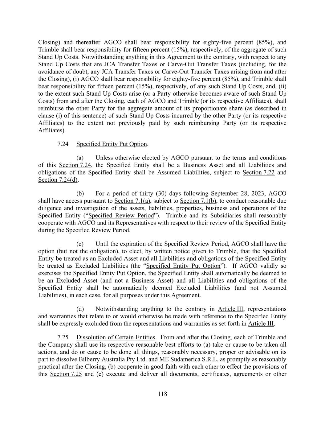 118 Closing) and thereafter AGCO shall bear responsibility for eighty-five percent (85%), and Trimble shall bear responsibility for fifteen percent (15%), respectively, of the aggregate of such Stand Up Costs. Notwithstanding anything in this Agreement to the contrary, with respect to any Stand Up Costs that are JCA Transfer Taxes or Carve-Out Transfer Taxes (including, for the avoidance of doubt, any JCA Transfer Taxes or Carve-Out Transfer Taxes arising from and after the Closing), (i) AGCO shall bear responsibility for eighty-five percent (85%), and Trimble shall bear responsibility for fifteen percent (15%), respectively, of any such Stand Up Costs, and, (ii) to the extent such Stand Up Costs arise (or a Party otherwise becomes aware of such Stand Up Costs) from and after the Closing, each of AGCO and Trimble (or its respective Affiliates), shall reimburse the other Party for the aggregate amount of its proportionate share (as described in clause (i) of this sentence) of such Stand Up Costs incurred by the other Party (or its respective Affiliates) to the extent not previously paid by such reimbursing Party (or its respective Affiliates). 7.24 Specified Entity Put Option. (a) Unless otherwise elected by AGCO pursuant to the terms and conditions of this Section 7.24, the Specified Entity shall be a Business Asset and all Liabilities and obligations of the Specified Entity shall be Assumed Liabilities, subject to Section 7.22 and Section 7.24(d). (b) For a period of thirty (30) days following September 28, 2023, AGCO shall have access pursuant to Section 7.1(a), subject to Section 7.1(b), to conduct reasonable due diligence and investigation of the assets, liabilities, properties, business and operations of the Specified Entity (“Specified Review Period”). Trimble and its Subsidiaries shall reasonably cooperate with AGCO and its Representatives with respect to their review of the Specified Entity during the Specified Review Period. (c) Until the expiration of the Specified Review Period, AGCO shall have the option (but not the obligation), to elect, by written notice given to Trimble, that the Specified Entity be treated as an Excluded Asset and all Liabilities and obligations of the Specified Entity be treated as Excluded Liabilities (the “Specified Entity Put Option”). If AGCO validly so exercises the Specified Entity Put Option, the Specified Entity shall automatically be deemed to be an Excluded Asset (and not a Business Asset) and all Liabilities and obligations of the Specified Entity shall be automatically deemed Excluded Liabilities (and not Assumed Liabilities), in each case, for all purposes under this Agreement. (d) Notwithstanding anything to the contrary in Article III, representations and warranties that relate to or would otherwise be made with reference to the Specified Entity shall be expressly excluded from the representations and warranties as set forth in Article III. 7.25 Dissolution of Certain Entities. From and after the Closing, each of Trimble and the Company shall use its respective reasonable best efforts to (a) take or cause to be taken all actions, and do or cause to be done all things, reasonably necessary, proper or advisable on its part to dissolve Bilberry Australia Pty Ltd. and ME Sudamerica S.R.L. as promptly as reasonably practical after the Closing, (b) cooperate in good faith with each other to effect the provisions of this Section 7.25 and (c) execute and deliver all documents, certificates, agreements or other