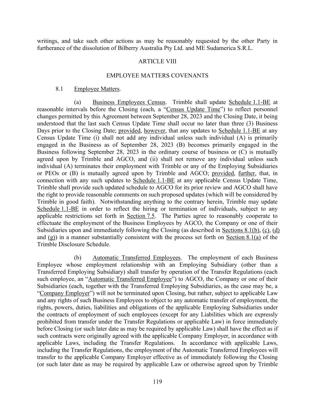 119 writings, and take such other actions as may be reasonably requested by the other Party in furtherance of the dissolution of Bilberry Australia Pty Ltd. and ME Sudamerica S.R.L. ARTICLE VIII EMPLOYEE MATTERS COVENANTS 8.1 Employee Matters. (a) Business Employees Census. Trimble shall update Schedule 1.1-BE at reasonable intervals before the Closing (each, a “Census Update Time”) to reflect personnel changes permitted by this Agreement between September 28, 2023 and the Closing Date, it being understood that the last such Census Update Time shall occur no later than three (3) Business Days prior to the Closing Date; provided, however, that any updates to Schedule 1.1-BE at any Census Update Time (i) shall not add any individual unless such individual (A) is primarily engaged in the Business as of September 28, 2023 (B) becomes primarily engaged in the Business following September 28, 2023 in the ordinary course of business or (C) is mutually agreed upon by Trimble and AGCO, and (ii) shall not remove any individual unless such individual (A) terminates their employment with Trimble or any of the Employing Subsidiaries or PEOs or (B) is mutually agreed upon by Trimble and AGCO; provided, further, that, in connection with any such updates to Schedule 1.1-BE at any applicable Census Update Time, Trimble shall provide such updated schedule to AGCO for its prior review and AGCO shall have the right to provide reasonable comments on such proposed updates (which will be considered by Trimble in good faith). Notwithstanding anything to the contrary herein, Trimble may update Schedule 1.1-BE in order to reflect the hiring or termination of individuals, subject to any applicable restrictions set forth in Section 7.5. The Parties agree to reasonably cooperate to effectuate the employment of the Business Employees by AGCO, the Company or one of their Subsidiaries upon and immediately following the Closing (as described in Sections 8.1(b), (c), (d) and (g)) in a manner substantially consistent with the process set forth on Section 8.1(a) of the Trimble Disclosure Schedule. (b) Automatic Transferred Employees. The employment of each Business Employee whose employment relationship with an Employing Subsidiary (other than a Transferred Employing Subsidiary) shall transfer by operation of the Transfer Regulations (each such employee, an “Automatic Transferred Employee”) to AGCO, the Company or one of their Subsidiaries (each, together with the Transferred Employing Subsidiaries, as the case may be, a “Company Employer”) will not be terminated upon Closing, but rather, subject to applicable Law and any rights of such Business Employees to object to any automatic transfer of employment, the rights, powers, duties, liabilities and obligations of the applicable Employing Subsidiaries under the contracts of employment of such employees (except for any Liabilities which are expressly prohibited from transfer under the Transfer Regulations or applicable Law) in force immediately before Closing (or such later date as may be required by applicable Law) shall have the effect as if such contracts were originally agreed with the applicable Company Employer, in accordance with applicable Laws, including the Transfer Regulations. In accordance with applicable Laws, including the Transfer Regulations, the employment of the Automatic Transferred Employees will transfer to the applicable Company Employer effective as of immediately following the Closing (or such later date as may be required by applicable Law or otherwise agreed upon by Trimble