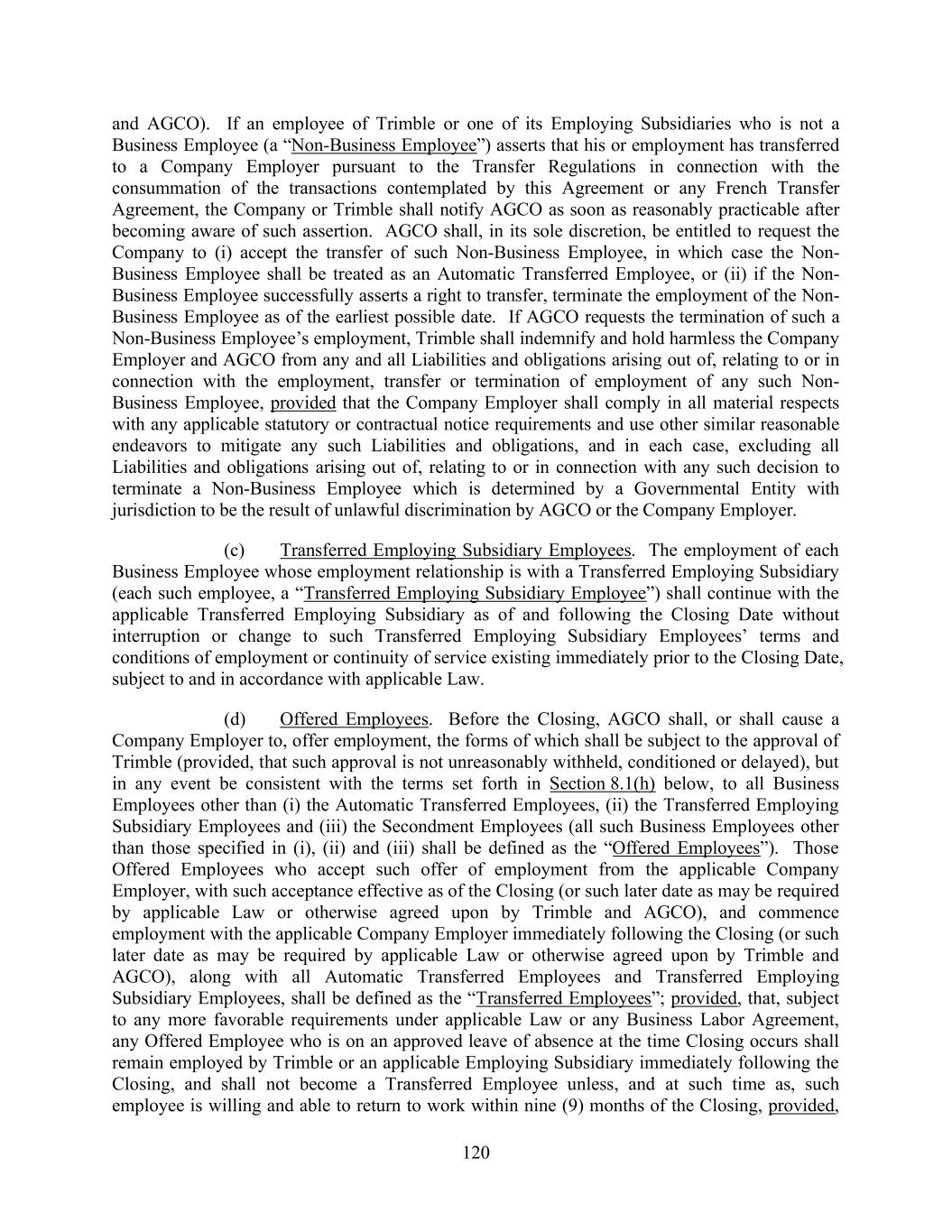 120 and AGCO). If an employee of Trimble or one of its Employing Subsidiaries who is not a Business Employee (a “Non-Business Employee”) asserts that his or employment has transferred to a Company Employer pursuant to the Transfer Regulations in connection with the consummation of the transactions contemplated by this Agreement or any French Transfer Agreement, the Company or Trimble shall notify AGCO as soon as reasonably practicable after becoming aware of such assertion. AGCO shall, in its sole discretion, be entitled to request the Company to (i) accept the transfer of such Non-Business Employee, in which case the Non- Business Employee shall be treated as an Automatic Transferred Employee, or (ii) if the Non- Business Employee successfully asserts a right to transfer, terminate the employment of the Non- Business Employee as of the earliest possible date. If AGCO requests the termination of such a Non-Business Employee’s employment, Trimble shall indemnify and hold harmless the Company Employer and AGCO from any and all Liabilities and obligations arising out of, relating to or in connection with the employment, transfer or termination of employment of any such Non- Business Employee, provided that the Company Employer shall comply in all material respects with any applicable statutory or contractual notice requirements and use other similar reasonable endeavors to mitigate any such Liabilities and obligations, and in each case, excluding all Liabilities and obligations arising out of, relating to or in connection with any such decision to terminate a Non-Business Employee which is determined by a Governmental Entity with jurisdiction to be the result of unlawful discrimination by AGCO or the Company Employer. (c) Transferred Employing Subsidiary Employees. The employment of each Business Employee whose employment relationship is with a Transferred Employing Subsidiary (each such employee, a “Transferred Employing Subsidiary Employee”) shall continue with the applicable Transferred Employing Subsidiary as of and following the Closing Date without interruption or change to such Transferred Employing Subsidiary Employees’ terms and conditions of employment or continuity of service existing immediately prior to the Closing Date, subject to and in accordance with applicable Law. (d) Offered Employees. Before the Closing, AGCO shall, or shall cause a Company Employer to, offer employment, the forms of which shall be subject to the approval of Trimble (provided, that such approval is not unreasonably withheld, conditioned or delayed), but in any event be consistent with the terms set forth in Section 8.1(h) below, to all Business Employees other than (i) the Automatic Transferred Employees, (ii) the Transferred Employing Subsidiary Employees and (iii) the Secondment Employees (all such Business Employees other than those specified in (i), (ii) and (iii) shall be defined as the “Offered Employees”). Those Offered Employees who accept such offer of employment from the applicable Company Employer, with such acceptance effective as of the Closing (or such later date as may be required by applicable Law or otherwise agreed upon by Trimble and AGCO), and commence employment with the applicable Company Employer immediately following the Closing (or such later date as may be required by applicable Law or otherwise agreed upon by Trimble and AGCO), along with all Automatic Transferred Employees and Transferred Employing Subsidiary Employees, shall be defined as the “Transferred Employees”; provided, that, subject to any more favorable requirements under applicable Law or any Business Labor Agreement, any Offered Employee who is on an approved leave of absence at the time Closing occurs shall remain employed by Trimble or an applicable Employing Subsidiary immediately following the Closing, and shall not become a Transferred Employee unless, and at such time as, such employee is willing and able to return to work within nine (9) months of the Closing, provided,