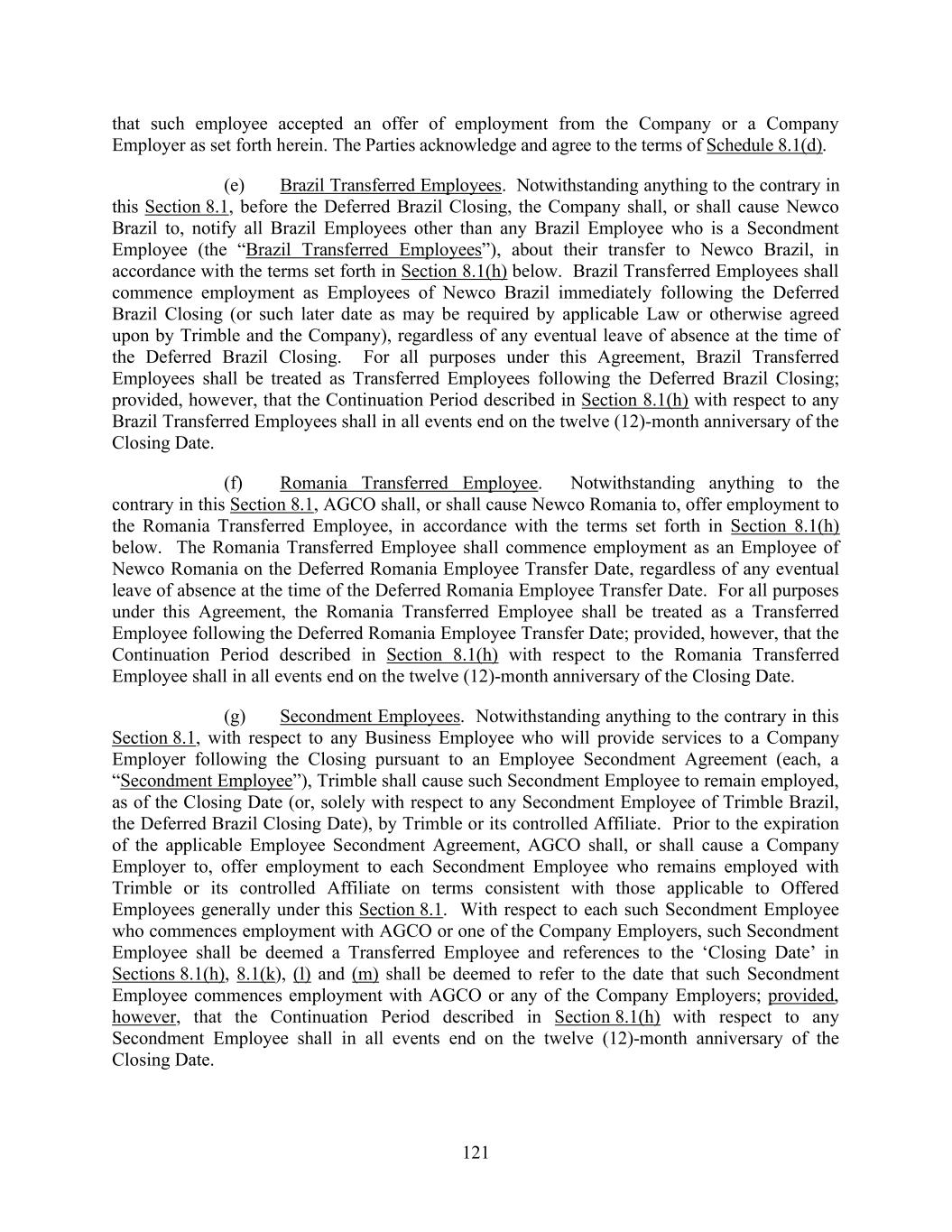 121 that such employee accepted an offer of employment from the Company or a Company Employer as set forth herein. The Parties acknowledge and agree to the terms of Schedule 8.1(d). (e) Brazil Transferred Employees. Notwithstanding anything to the contrary in this Section 8.1, before the Deferred Brazil Closing, the Company shall, or shall cause Newco Brazil to, notify all Brazil Employees other than any Brazil Employee who is a Secondment Employee (the “Brazil Transferred Employees”), about their transfer to Newco Brazil, in accordance with the terms set forth in Section 8.1(h) below. Brazil Transferred Employees shall commence employment as Employees of Newco Brazil immediately following the Deferred Brazil Closing (or such later date as may be required by applicable Law or otherwise agreed upon by Trimble and the Company), regardless of any eventual leave of absence at the time of the Deferred Brazil Closing. For all purposes under this Agreement, Brazil Transferred Employees shall be treated as Transferred Employees following the Deferred Brazil Closing; provided, however, that the Continuation Period described in Section 8.1(h) with respect to any Brazil Transferred Employees shall in all events end on the twelve (12)-month anniversary of the Closing Date. (f) Romania Transferred Employee. Notwithstanding anything to the contrary in this Section 8.1, AGCO shall, or shall cause Newco Romania to, offer employment to the Romania Transferred Employee, in accordance with the terms set forth in Section 8.1(h) below. The Romania Transferred Employee shall commence employment as an Employee of Newco Romania on the Deferred Romania Employee Transfer Date, regardless of any eventual leave of absence at the time of the Deferred Romania Employee Transfer Date. For all purposes under this Agreement, the Romania Transferred Employee shall be treated as a Transferred Employee following the Deferred Romania Employee Transfer Date; provided, however, that the Continuation Period described in Section 8.1(h) with respect to the Romania Transferred Employee shall in all events end on the twelve (12)-month anniversary of the Closing Date. (g) Secondment Employees. Notwithstanding anything to the contrary in this Section 8.1, with respect to any Business Employee who will provide services to a Company Employer following the Closing pursuant to an Employee Secondment Agreement (each, a “Secondment Employee”), Trimble shall cause such Secondment Employee to remain employed, as of the Closing Date (or, solely with respect to any Secondment Employee of Trimble Brazil, the Deferred Brazil Closing Date), by Trimble or its controlled Affiliate. Prior to the expiration of the applicable Employee Secondment Agreement, AGCO shall, or shall cause a Company Employer to, offer employment to each Secondment Employee who remains employed with Trimble or its controlled Affiliate on terms consistent with those applicable to Offered Employees generally under this Section 8.1. With respect to each such Secondment Employee who commences employment with AGCO or one of the Company Employers, such Secondment Employee shall be deemed a Transferred Employee and references to the ‘Closing Date’ in Sections 8.1(h), 8.1(k), (l) and (m) shall be deemed to refer to the date that such Secondment Employee commences employment with AGCO or any of the Company Employers; provided, however, that the Continuation Period described in Section 8.1(h) with respect to any Secondment Employee shall in all events end on the twelve (12)-month anniversary of the Closing Date.