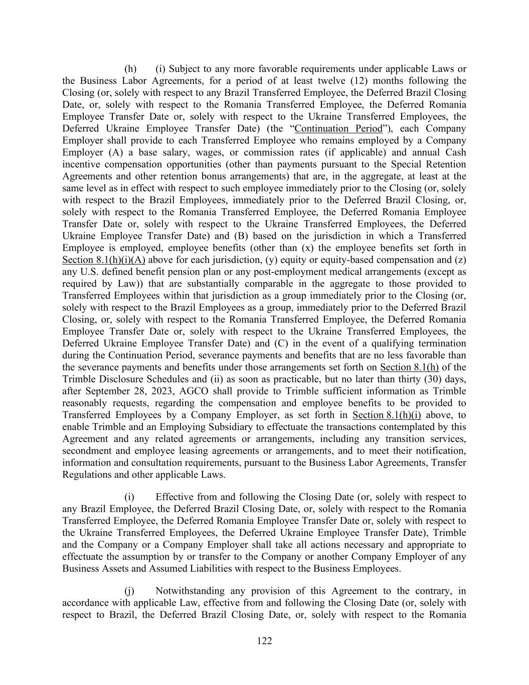 122 (h) (i) Subject to any more favorable requirements under applicable Laws or the Business Labor Agreements, for a period of at least twelve (12) months following the Closing (or, solely with respect to any Brazil Transferred Employee, the Deferred Brazil Closing Date, or, solely with respect to the Romania Transferred Employee, the Deferred Romania Employee Transfer Date or, solely with respect to the Ukraine Transferred Employees, the Deferred Ukraine Employee Transfer Date) (the “Continuation Period”), each Company Employer shall provide to each Transferred Employee who remains employed by a Company Employer (A) a base salary, wages, or commission rates (if applicable) and annual Cash incentive compensation opportunities (other than payments pursuant to the Special Retention Agreements and other retention bonus arrangements) that are, in the aggregate, at least at the same level as in effect with respect to such employee immediately prior to the Closing (or, solely with respect to the Brazil Employees, immediately prior to the Deferred Brazil Closing, or, solely with respect to the Romania Transferred Employee, the Deferred Romania Employee Transfer Date or, solely with respect to the Ukraine Transferred Employees, the Deferred Ukraine Employee Transfer Date) and (B) based on the jurisdiction in which a Transferred Employee is employed, employee benefits (other than (x) the employee benefits set forth in Section 8.1(h)(i)(A) above for each jurisdiction, (y) equity or equity-based compensation and (z) any U.S. defined benefit pension plan or any post-employment medical arrangements (except as required by Law)) that are substantially comparable in the aggregate to those provided to Transferred Employees within that jurisdiction as a group immediately prior to the Closing (or, solely with respect to the Brazil Employees as a group, immediately prior to the Deferred Brazil Closing, or, solely with respect to the Romania Transferred Employee, the Deferred Romania Employee Transfer Date or, solely with respect to the Ukraine Transferred Employees, the Deferred Ukraine Employee Transfer Date) and (C) in the event of a qualifying termination during the Continuation Period, severance payments and benefits that are no less favorable than the severance payments and benefits under those arrangements set forth on Section 8.1(h) of the Trimble Disclosure Schedules and (ii) as soon as practicable, but no later than thirty (30) days, after September 28, 2023, AGCO shall provide to Trimble sufficient information as Trimble reasonably requests, regarding the compensation and employee benefits to be provided to Transferred Employees by a Company Employer, as set forth in Section 8.1(h)(i) above, to enable Trimble and an Employing Subsidiary to effectuate the transactions contemplated by this Agreement and any related agreements or arrangements, including any transition services, secondment and employee leasing agreements or arrangements, and to meet their notification, information and consultation requirements, pursuant to the Business Labor Agreements, Transfer Regulations and other applicable Laws. (i) Effective from and following the Closing Date (or, solely with respect to any Brazil Employee, the Deferred Brazil Closing Date, or, solely with respect to the Romania Transferred Employee, the Deferred Romania Employee Transfer Date or, solely with respect to the Ukraine Transferred Employees, the Deferred Ukraine Employee Transfer Date), Trimble and the Company or a Company Employer shall take all actions necessary and appropriate to effectuate the assumption by or transfer to the Company or another Company Employer of any Business Assets and Assumed Liabilities with respect to the Business Employees. (j) Notwithstanding any provision of this Agreement to the contrary, in accordance with applicable Law, effective from and following the Closing Date (or, solely with respect to Brazil, the Deferred Brazil Closing Date, or, solely with respect to the Romania
