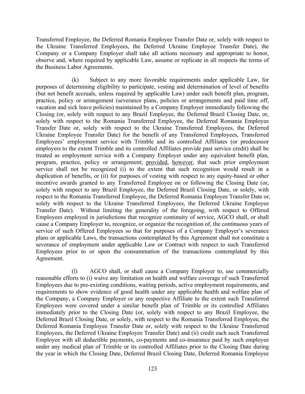 123 Transferred Employee, the Deferred Romania Employee Transfer Date or, solely with respect to the Ukraine Transferred Employees, the Deferred Ukraine Employee Transfer Date), the Company or a Company Employer shall take all actions necessary and appropriate to honor, observe and, where required by applicable Law, assume or replicate in all respects the terms of the Business Labor Agreements. (k) Subject to any more favorable requirements under applicable Law, for purposes of determining eligibility to participate, vesting and determination of level of benefits (but not benefit accruals, unless required by applicable Law) under each benefit plan, program, practice, policy or arrangement (severance plans, policies or arrangements and paid time off, vacation and sick leave policies) maintained by a Company Employer immediately following the Closing (or, solely with respect to any Brazil Employee, the Deferred Brazil Closing Date, or, solely with respect to the Romania Transferred Employee, the Deferred Romania Employee Transfer Date or, solely with respect to the Ukraine Transferred Employees, the Deferred Ukraine Employee Transfer Date) for the benefit of any Transferred Employees, Transferred Employees’ employment service with Trimble and its controlled Affiliates (or predecessor employers to the extent Trimble and its controlled Affiliates provide past service credit) shall be treated as employment service with a Company Employer under any equivalent benefit plan, program, practice, policy or arrangement; provided, however, that such prior employment service shall not be recognized (i) to the extent that such recognition would result in a duplication of benefits, or (ii) for purposes of vesting with respect to any equity-based or other incentive awards granted to any Transferred Employee on or following the Closing Date (or, solely with respect to any Brazil Employee, the Deferred Brazil Closing Date, or solely, with respect to the Romania Transferred Employee, the Deferred Romania Employee Transfer Date or, solely with respect to the Ukraine Transferred Employees, the Deferred Ukraine Employee Transfer Date). Without limiting the generality of the foregoing, with respect to Offered Employees employed in jurisdictions that recognize continuity of service, AGCO shall, or shall cause a Company Employer to, recognize, or organize the recognition of, the continuous years of service of such Offered Employees so that for purposes of a Company Employer’s severance plans or applicable Laws, the transactions contemplated by this Agreement shall not constitute a severance of employment under applicable Law or Contract with respect to such Transferred Employees prior to or upon the consummation of the transactions contemplated by this Agreement. (l) AGCO shall, or shall cause a Company Employer to, use commercially reasonable efforts to (i) waive any limitation on health and welfare coverage of such Transferred Employees due to pre-existing conditions, waiting periods, active employment requirements, and requirements to show evidence of good health under any applicable health and welfare plan of the Company, a Company Employer or any respective Affiliate to the extent such Transferred Employees were covered under a similar benefit plan of Trimble or its controlled Affiliates immediately prior to the Closing Date (or, solely with respect to any Brazil Employee, the Deferred Brazil Closing Date, or solely, with respect to the Romania Transferred Employee, the Deferred Romania Employee Transfer Date or, solely with respect to the Ukraine Transferred Employees, the Deferred Ukraine Employee Transfer Date) and (ii) credit each such Transferred Employee with all deductible payments, co-payments and co-insurance paid by such employee under any medical plan of Trimble or its controlled Affiliates prior to the Closing Date during the year in which the Closing Date, Deferred Brazil Closing Date, Deferred Romania Employee
