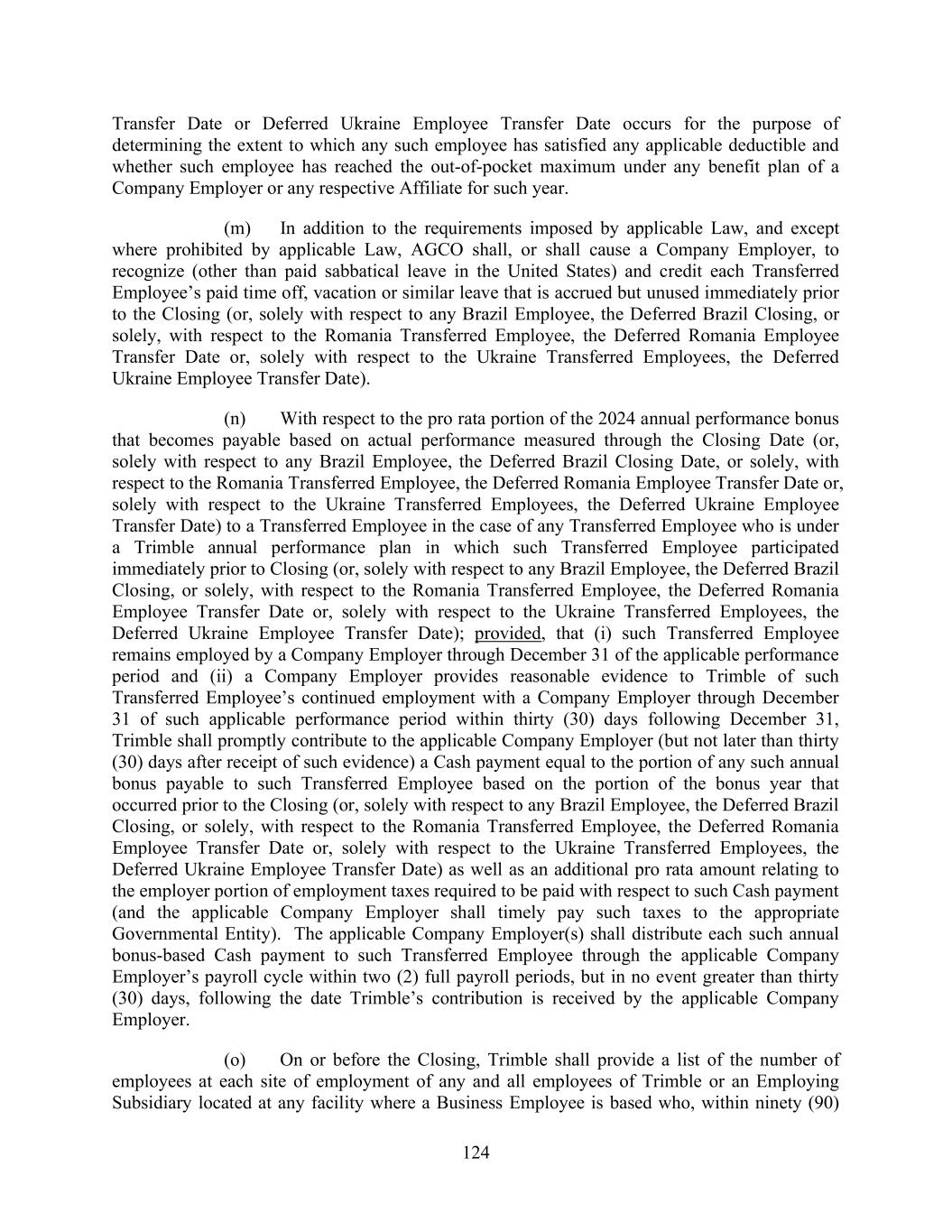 124 Transfer Date or Deferred Ukraine Employee Transfer Date occurs for the purpose of determining the extent to which any such employee has satisfied any applicable deductible and whether such employee has reached the out-of-pocket maximum under any benefit plan of a Company Employer or any respective Affiliate for such year. (m) In addition to the requirements imposed by applicable Law, and except where prohibited by applicable Law, AGCO shall, or shall cause a Company Employer, to recognize (other than paid sabbatical leave in the United States) and credit each Transferred Employee’s paid time off, vacation or similar leave that is accrued but unused immediately prior to the Closing (or, solely with respect to any Brazil Employee, the Deferred Brazil Closing, or solely, with respect to the Romania Transferred Employee, the Deferred Romania Employee Transfer Date or, solely with respect to the Ukraine Transferred Employees, the Deferred Ukraine Employee Transfer Date). (n) With respect to the pro rata portion of the 2024 annual performance bonus that becomes payable based on actual performance measured through the Closing Date (or, solely with respect to any Brazil Employee, the Deferred Brazil Closing Date, or solely, with respect to the Romania Transferred Employee, the Deferred Romania Employee Transfer Date or, solely with respect to the Ukraine Transferred Employees, the Deferred Ukraine Employee Transfer Date) to a Transferred Employee in the case of any Transferred Employee who is under a Trimble annual performance plan in which such Transferred Employee participated immediately prior to Closing (or, solely with respect to any Brazil Employee, the Deferred Brazil Closing, or solely, with respect to the Romania Transferred Employee, the Deferred Romania Employee Transfer Date or, solely with respect to the Ukraine Transferred Employees, the Deferred Ukraine Employee Transfer Date); provided, that (i) such Transferred Employee remains employed by a Company Employer through December 31 of the applicable performance period and (ii) a Company Employer provides reasonable evidence to Trimble of such Transferred Employee’s continued employment with a Company Employer through December 31 of such applicable performance period within thirty (30) days following December 31, Trimble shall promptly contribute to the applicable Company Employer (but not later than thirty (30) days after receipt of such evidence) a Cash payment equal to the portion of any such annual bonus payable to such Transferred Employee based on the portion of the bonus year that occurred prior to the Closing (or, solely with respect to any Brazil Employee, the Deferred Brazil Closing, or solely, with respect to the Romania Transferred Employee, the Deferred Romania Employee Transfer Date or, solely with respect to the Ukraine Transferred Employees, the Deferred Ukraine Employee Transfer Date) as well as an additional pro rata amount relating to the employer portion of employment taxes required to be paid with respect to such Cash payment (and the applicable Company Employer shall timely pay such taxes to the appropriate Governmental Entity). The applicable Company Employer(s) shall distribute each such annual bonus-based Cash payment to such Transferred Employee through the applicable Company Employer’s payroll cycle within two (2) full payroll periods, but in no event greater than thirty (30) days, following the date Trimble’s contribution is received by the applicable Company Employer. (o) On or before the Closing, Trimble shall provide a list of the number of employees at each site of employment of any and all employees of Trimble or an Employing Subsidiary located at any facility where a Business Employee is based who, within ninety (90)