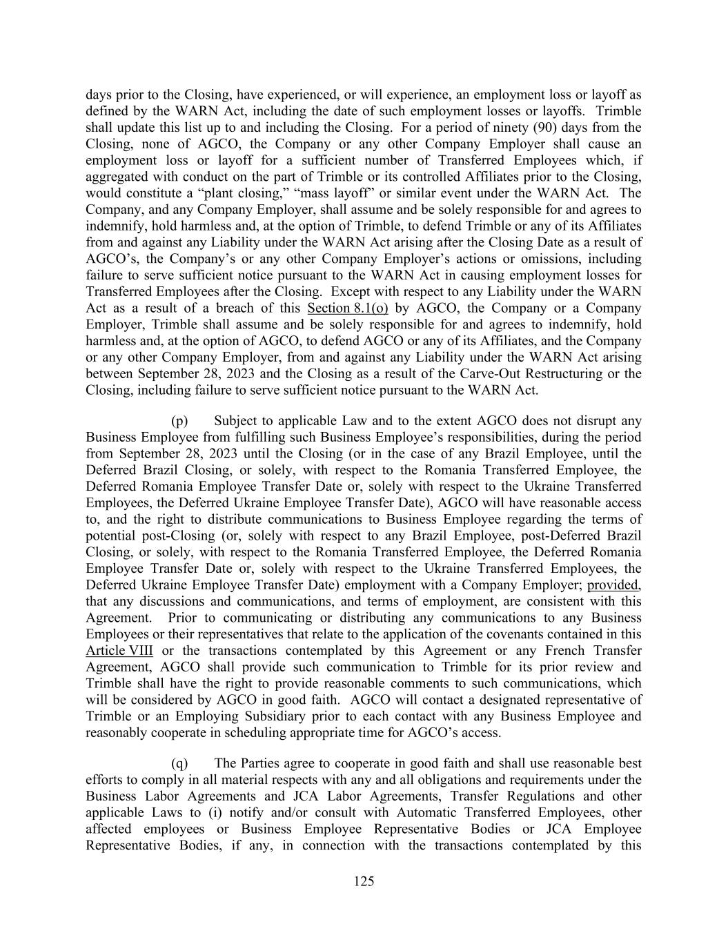 125 days prior to the Closing, have experienced, or will experience, an employment loss or layoff as defined by the WARN Act, including the date of such employment losses or layoffs. Trimble shall update this list up to and including the Closing. For a period of ninety (90) days from the Closing, none of AGCO, the Company or any other Company Employer shall cause an employment loss or layoff for a sufficient number of Transferred Employees which, if aggregated with conduct on the part of Trimble or its controlled Affiliates prior to the Closing, would constitute a “plant closing,” “mass layoff” or similar event under the WARN Act. The Company, and any Company Employer, shall assume and be solely responsible for and agrees to indemnify, hold harmless and, at the option of Trimble, to defend Trimble or any of its Affiliates from and against any Liability under the WARN Act arising after the Closing Date as a result of AGCO’s, the Company’s or any other Company Employer’s actions or omissions, including failure to serve sufficient notice pursuant to the WARN Act in causing employment losses for Transferred Employees after the Closing. Except with respect to any Liability under the WARN Act as a result of a breach of this Section 8.1(o) by AGCO, the Company or a Company Employer, Trimble shall assume and be solely responsible for and agrees to indemnify, hold harmless and, at the option of AGCO, to defend AGCO or any of its Affiliates, and the Company or any other Company Employer, from and against any Liability under the WARN Act arising between September 28, 2023 and the Closing as a result of the Carve-Out Restructuring or the Closing, including failure to serve sufficient notice pursuant to the WARN Act. (p) Subject to applicable Law and to the extent AGCO does not disrupt any Business Employee from fulfilling such Business Employee’s responsibilities, during the period from September 28, 2023 until the Closing (or in the case of any Brazil Employee, until the Deferred Brazil Closing, or solely, with respect to the Romania Transferred Employee, the Deferred Romania Employee Transfer Date or, solely with respect to the Ukraine Transferred Employees, the Deferred Ukraine Employee Transfer Date), AGCO will have reasonable access to, and the right to distribute communications to Business Employee regarding the terms of potential post-Closing (or, solely with respect to any Brazil Employee, post-Deferred Brazil Closing, or solely, with respect to the Romania Transferred Employee, the Deferred Romania Employee Transfer Date or, solely with respect to the Ukraine Transferred Employees, the Deferred Ukraine Employee Transfer Date) employment with a Company Employer; provided, that any discussions and communications, and terms of employment, are consistent with this Agreement. Prior to communicating or distributing any communications to any Business Employees or their representatives that relate to the application of the covenants contained in this Article VIII or the transactions contemplated by this Agreement or any French Transfer Agreement, AGCO shall provide such communication to Trimble for its prior review and Trimble shall have the right to provide reasonable comments to such communications, which will be considered by AGCO in good faith. AGCO will contact a designated representative of Trimble or an Employing Subsidiary prior to each contact with any Business Employee and reasonably cooperate in scheduling appropriate time for AGCO’s access. (q) The Parties agree to cooperate in good faith and shall use reasonable best efforts to comply in all material respects with any and all obligations and requirements under the Business Labor Agreements and JCA Labor Agreements, Transfer Regulations and other applicable Laws to (i) notify and/or consult with Automatic Transferred Employees, other affected employees or Business Employee Representative Bodies or JCA Employee Representative Bodies, if any, in connection with the transactions contemplated by this